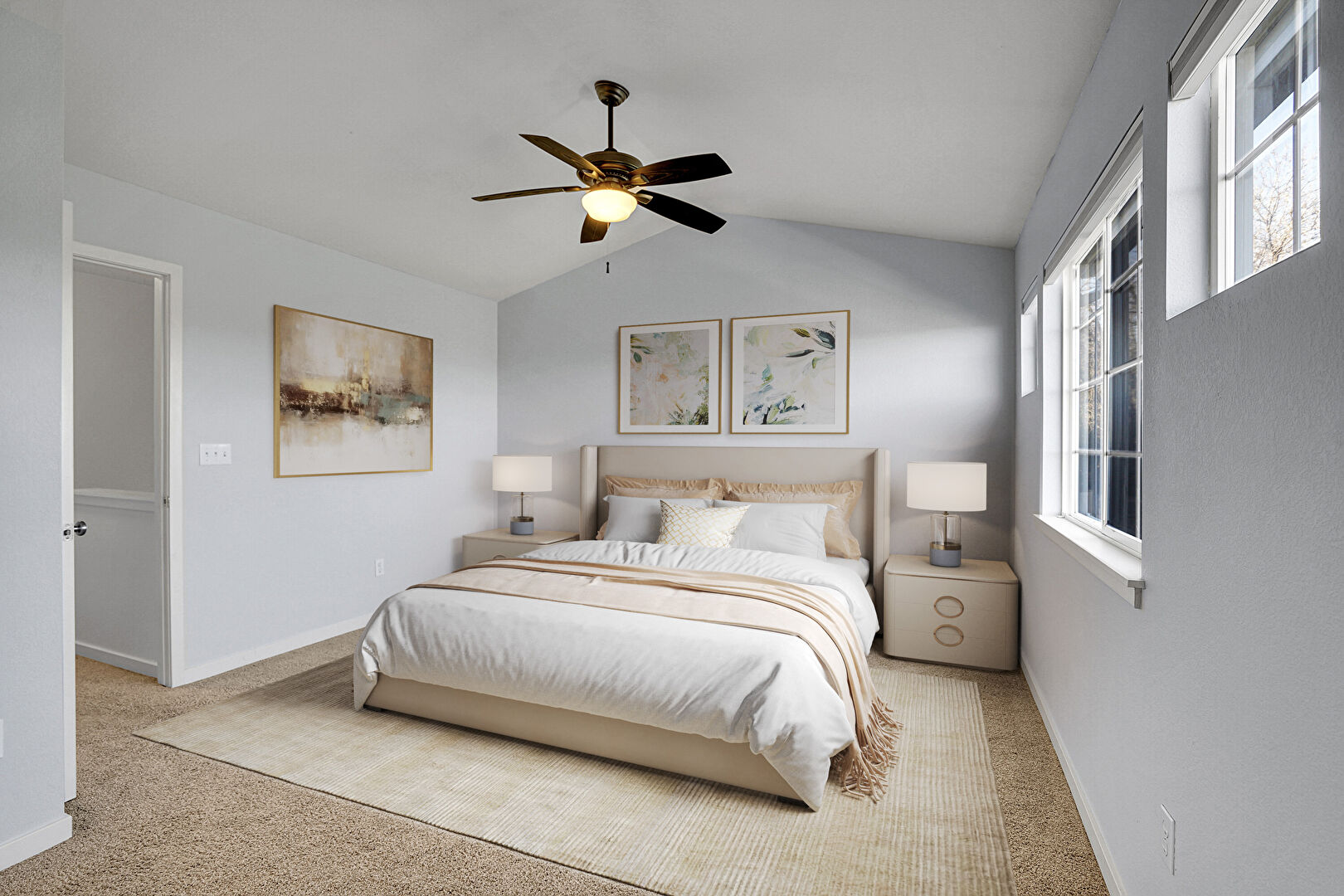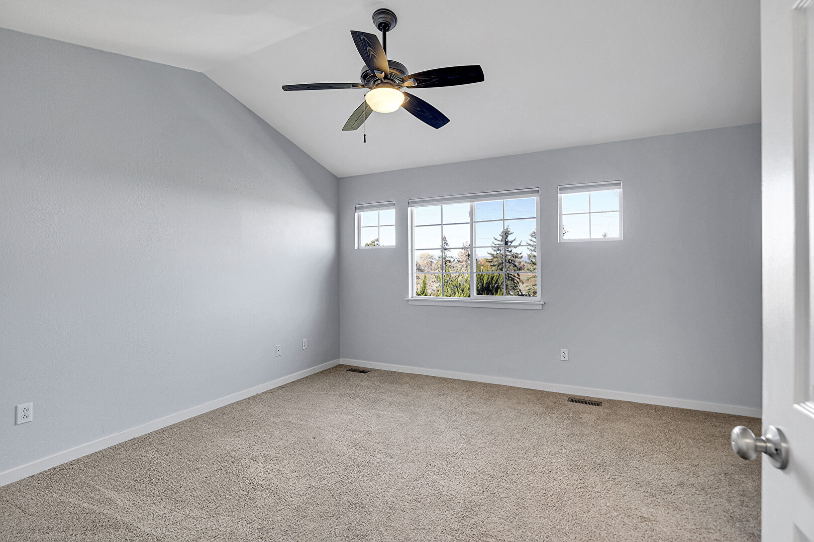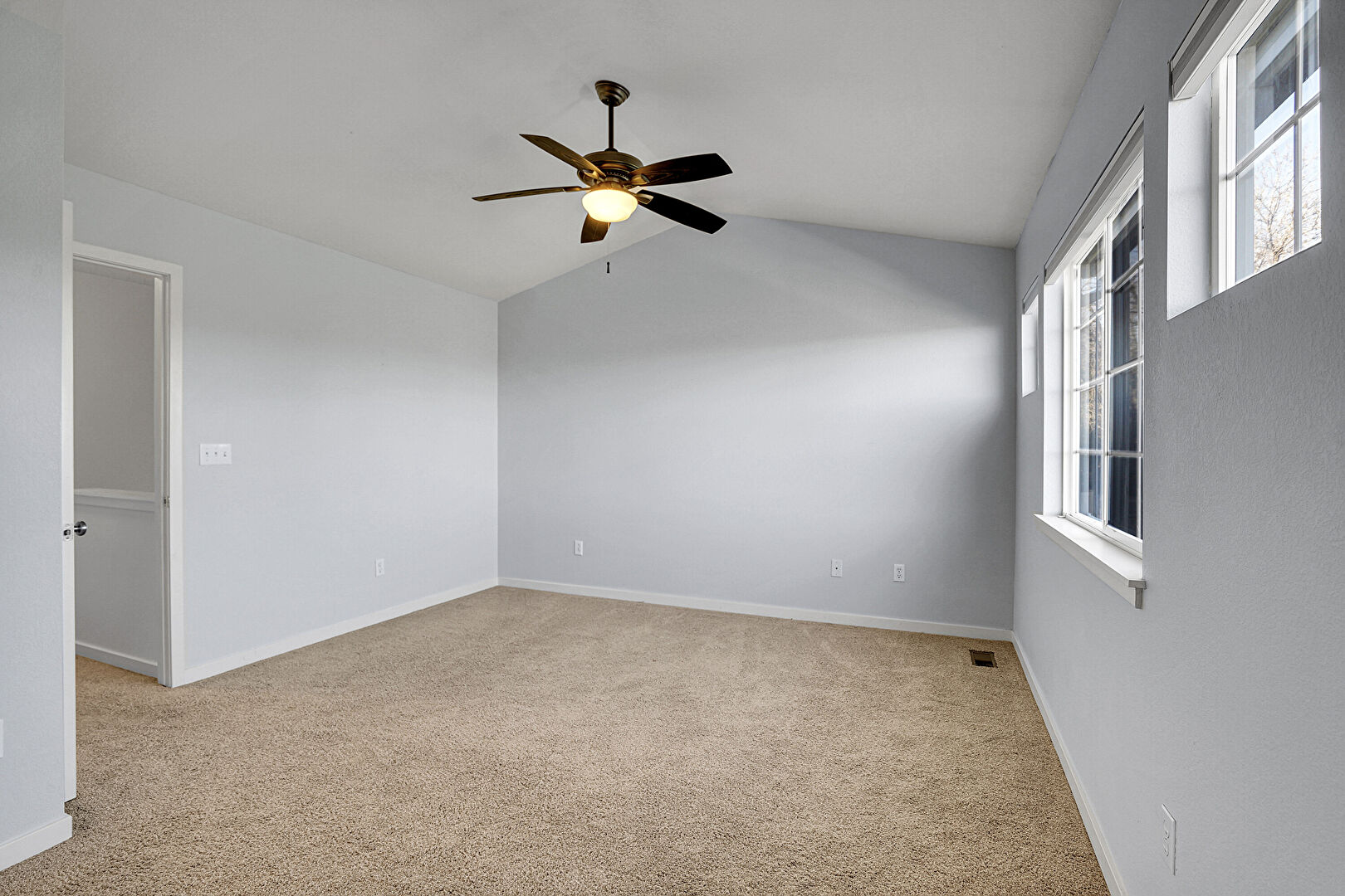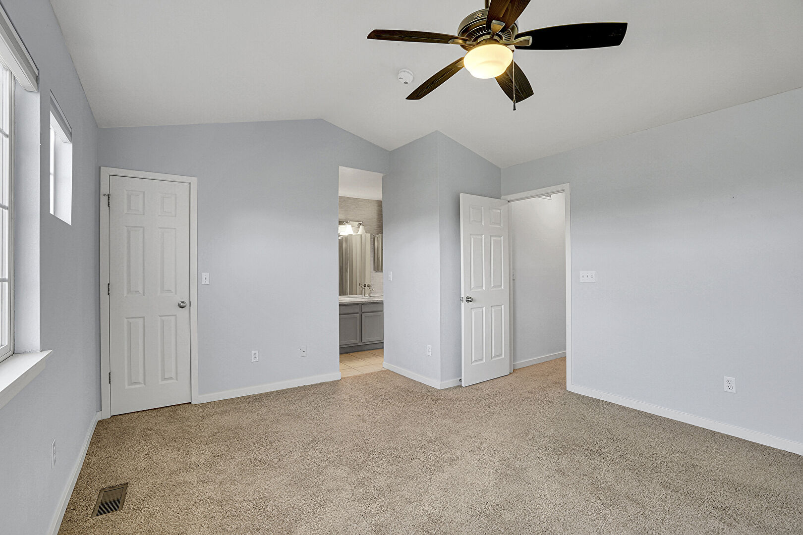 Baseboards Wall, Carpet, Cathedral Ceiling, Ceiling Fan, Drywall, Ensuite Bathroom, Natural Light, Smoke Carbon Monoxide Detector, Vaulted Ceiling, Vent, Ceiling Fan, Ensuite Bathroom