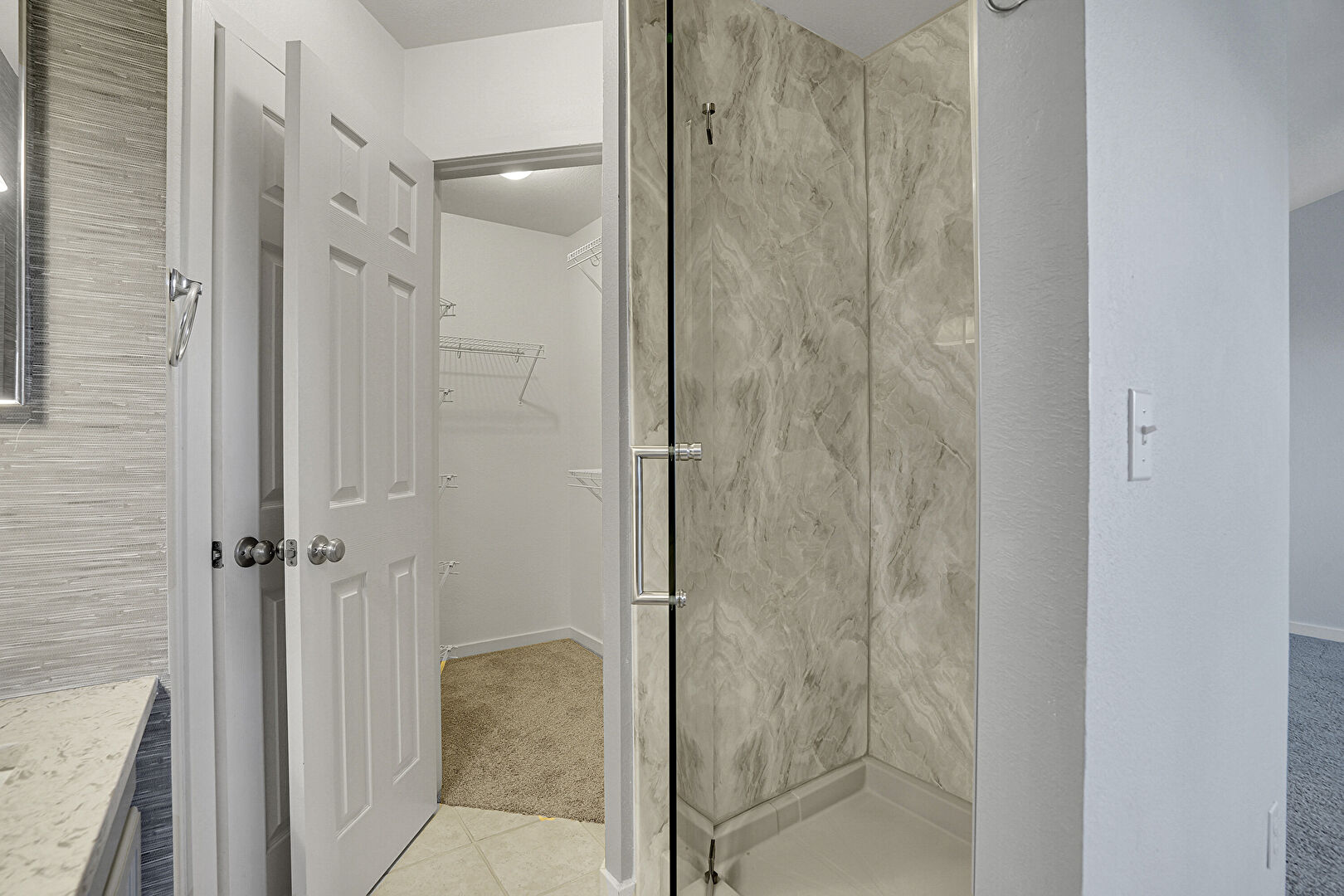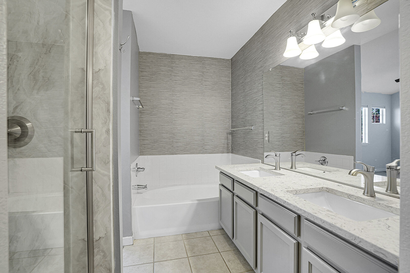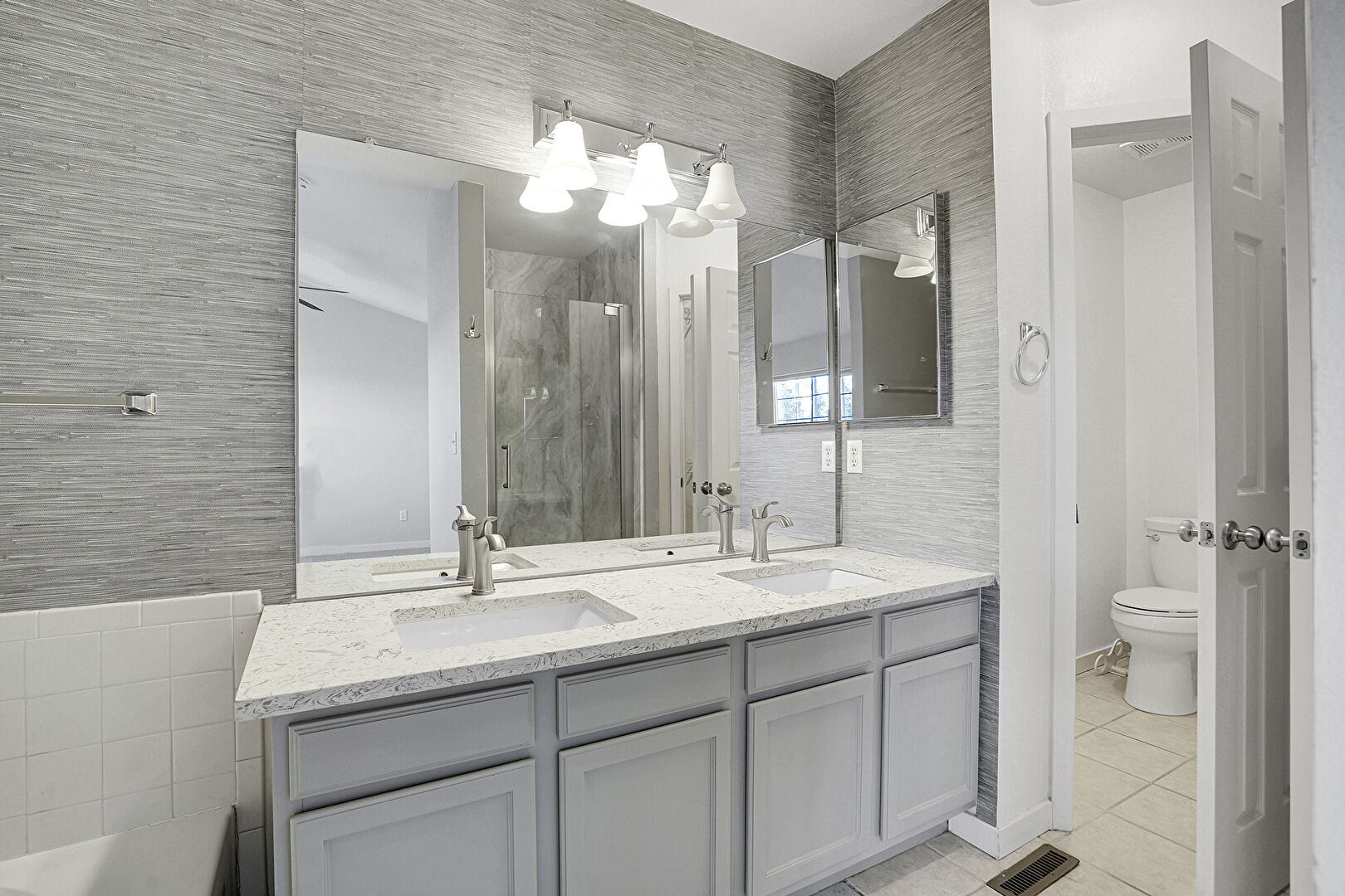 Baseboards Wall, Carpet, Double Vanity, Drywall, Full Bathroom, Notable Chandelier, Tile Floor, Tile Wall, Vanity, Vent, Walk In Closet, Water Closet, Double Vanity, Tile Floor, Tile Wall, Walk In Closet