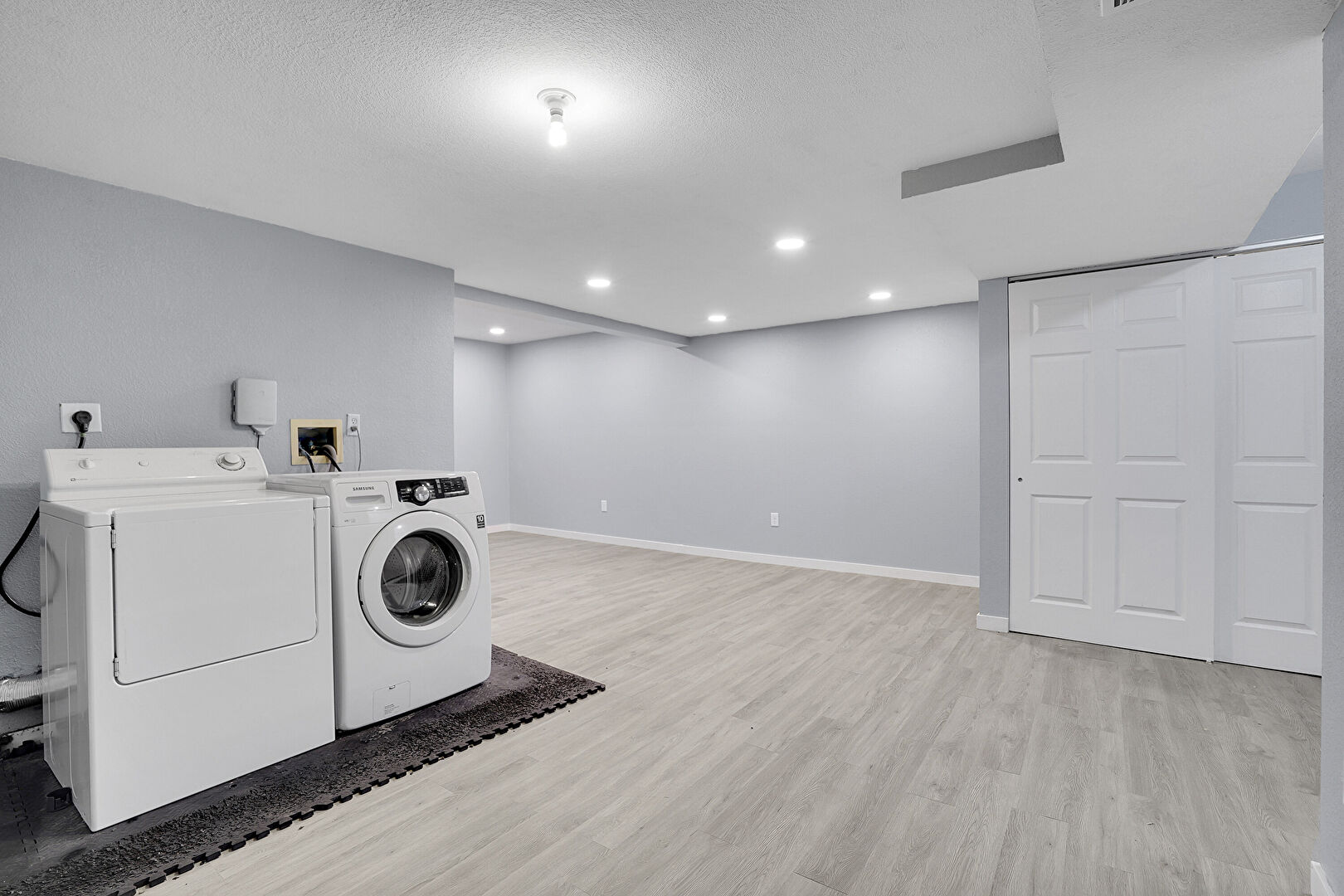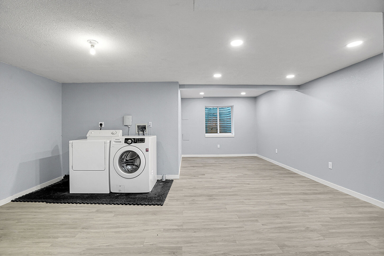 Baseboards Wall, Basement, Drywall, Electric Dryer Hookup, Laundry, Recessed Lighting, Textured Wall, Washer Dryer, Wood Finish Floor, Basement, Textured Wall, Washer Hookup