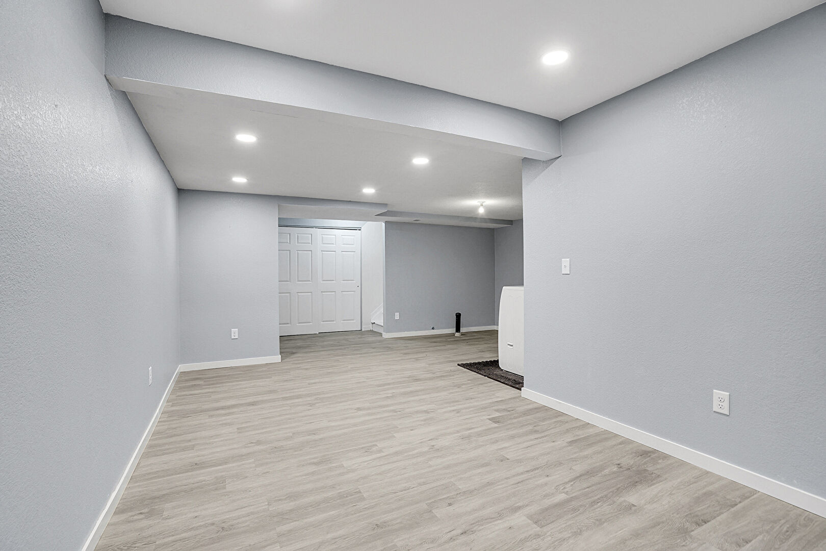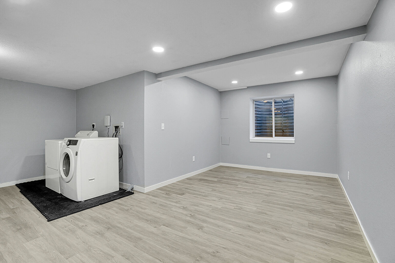 Baseboards Wall, Drywall, Recessed Lighting, Stairs, Washer Dryer, Wood Finish Floor, Basement