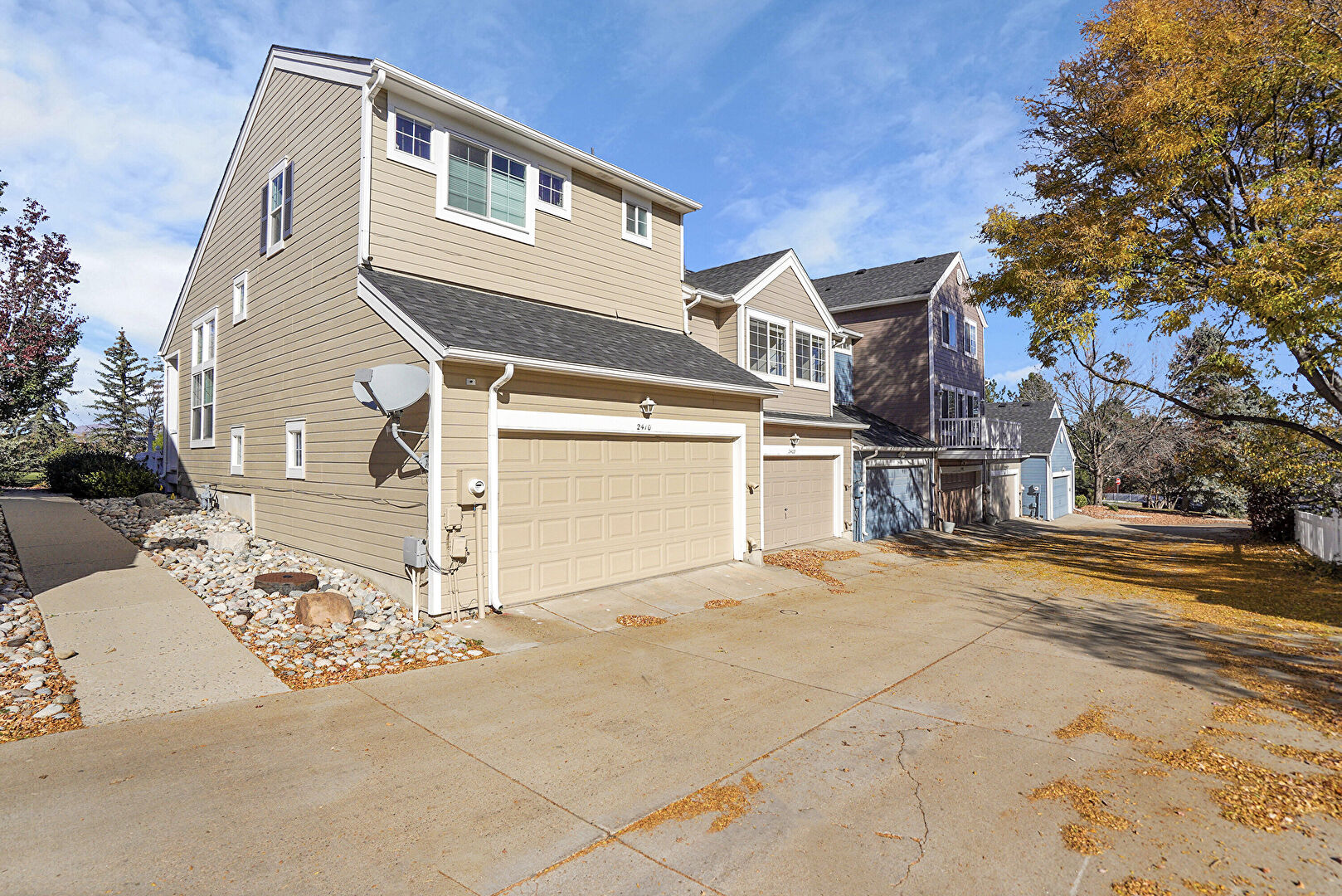 Built In Garage, Concrete Foundation, Downspout, Driveway, Electric Meter, Gutters, Horizontal Siding, Satellite Dish, Shingle Roof, Built In Garage, Shingle Roof
