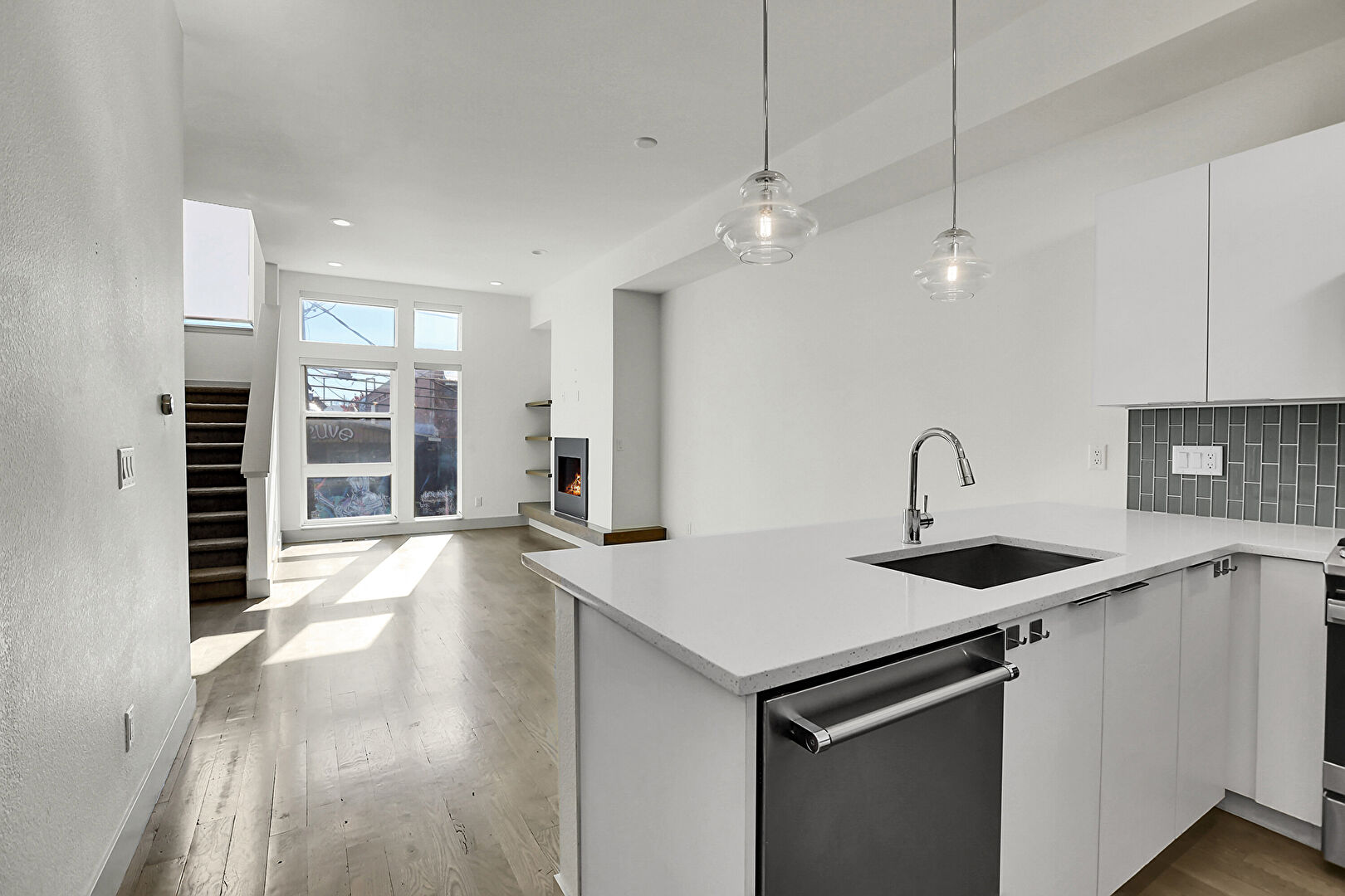 Baseboards Wall, Drywall, Fireplace, Flat Panel Cabinets, Kitchen Bar, Kitchen Peninsula, Natural Light, Opens To Living Area, Pendant Lighting, Recessed Lighting, Stone Countertops, Textured Wall, U Shaped Kitchen, Vent, Wood Finish Floor, Baseboards Wall, Flat Panel Cabinets, Kitchen Peninsula, Pendant Lighting, Recessed Lighting, Stone Countertops