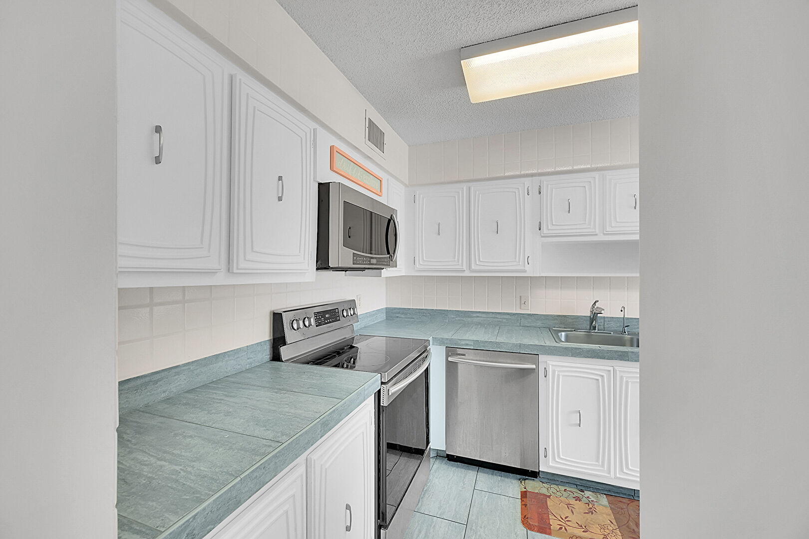 Baseboards Wall, Drywall, Laundry, Raised Cabinets, Shaker Cabinets, Textured Ceiling, Tile Wall, U Shaped Kitchen, Vent, Visible Hinge Cabinets, Wood Finish Floor, Textured Ceiling, Tile Floor, Vent