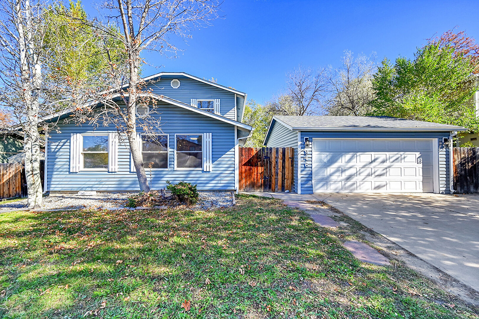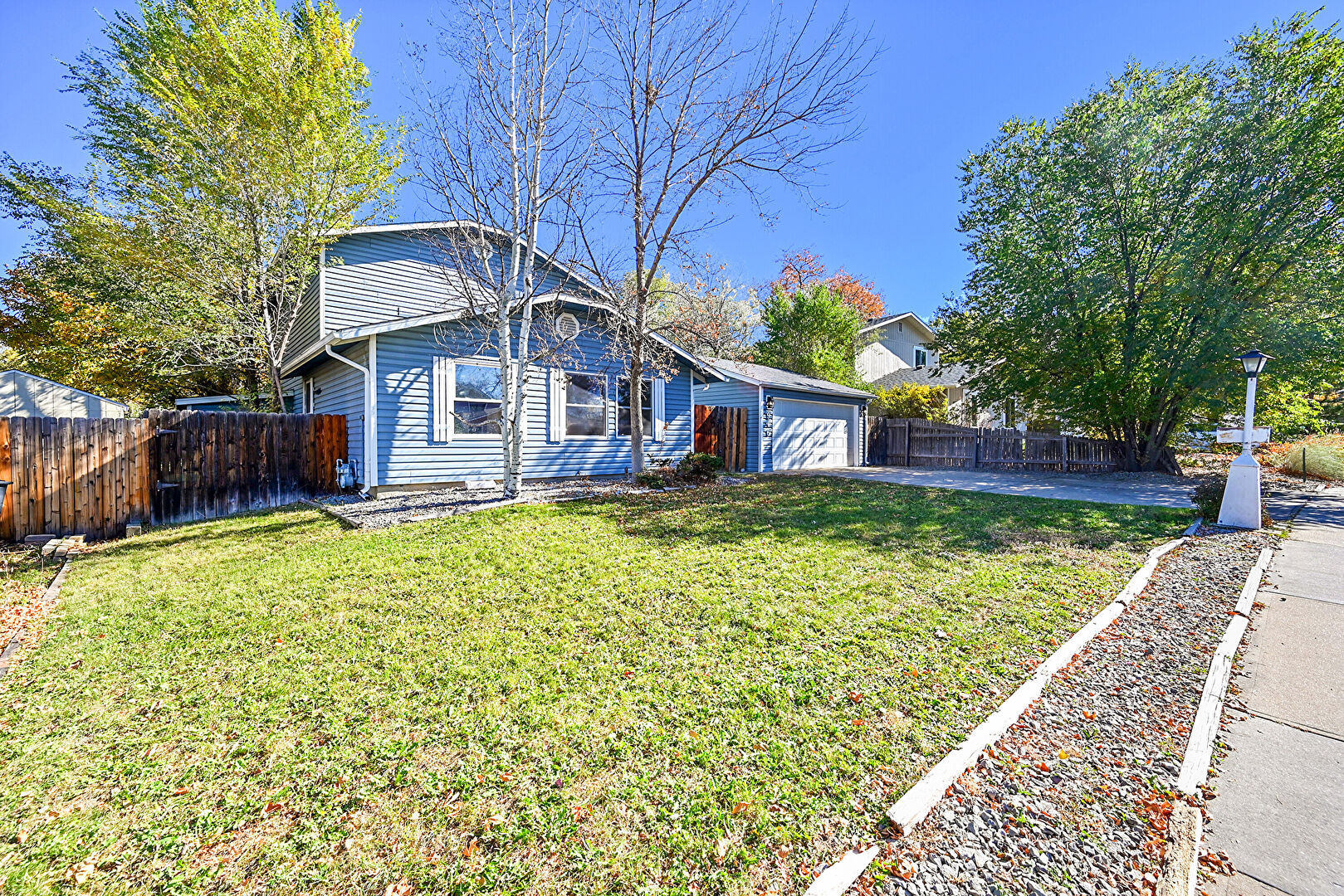 Concrete Foundation, Detached Garage, Downspout, Driveway, Fence, Gutters, Horizontal Siding, Lawn, Outdoor Structure, Driveway, Garage, Lawn, Outdoor Structure, Shingle Roof