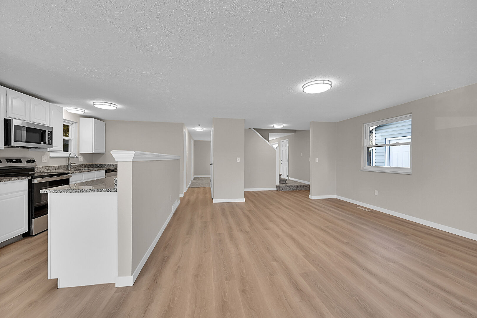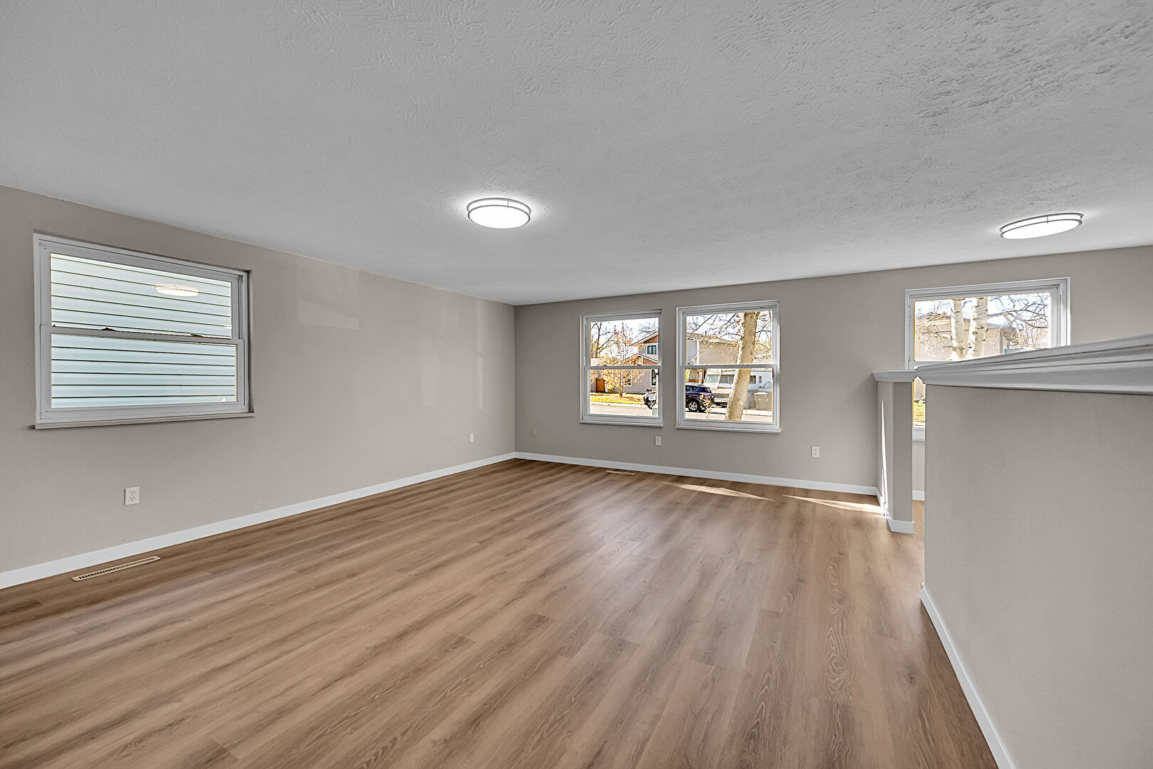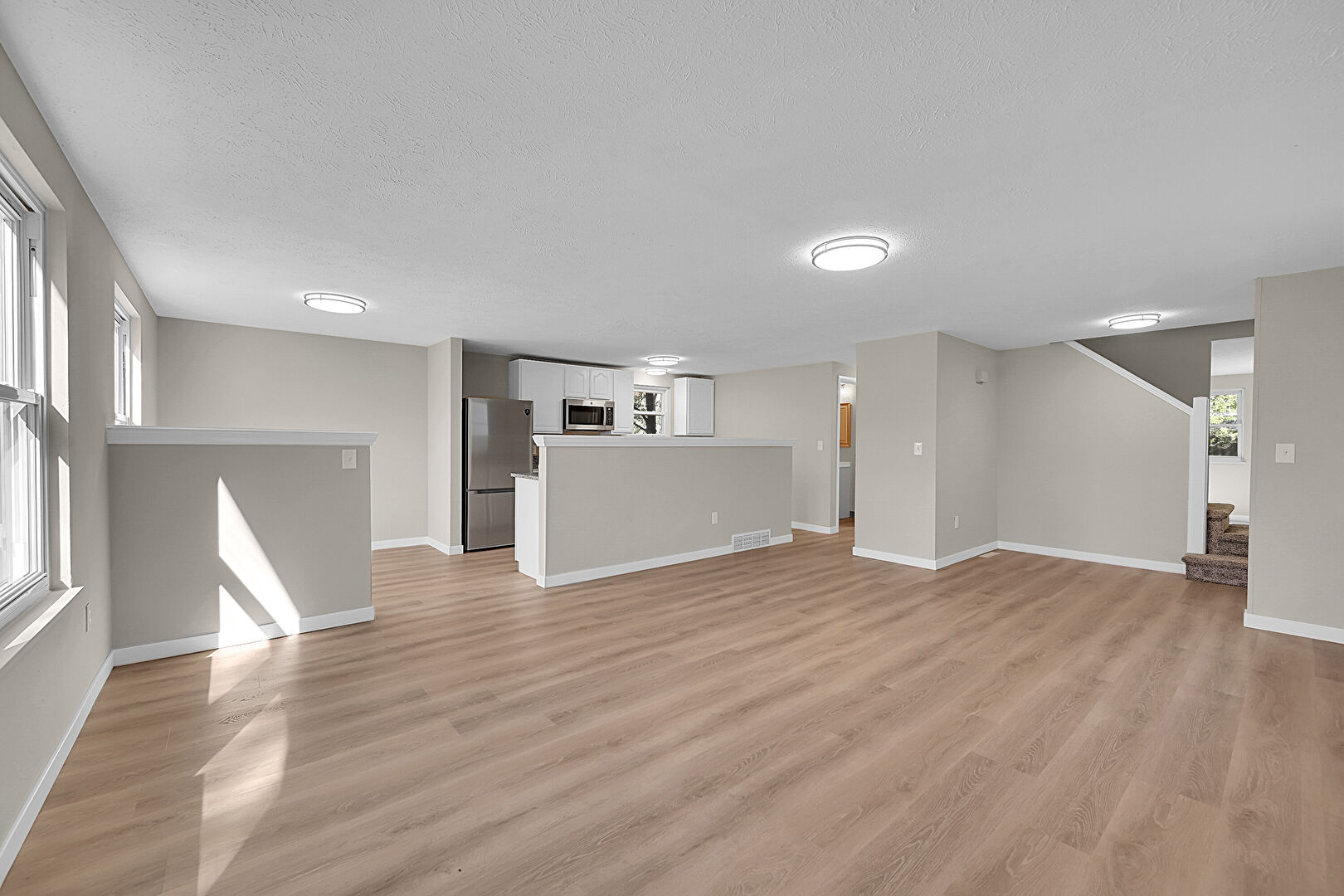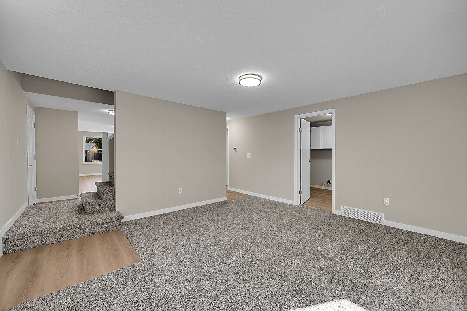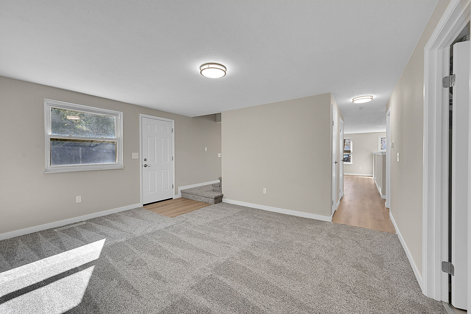 Baseboards Wall, Carpet, Drywall, Natural Light, Stairs, Textured Ceiling, Vent, Wood Finish Floor, Carpet, Drywall, Vent