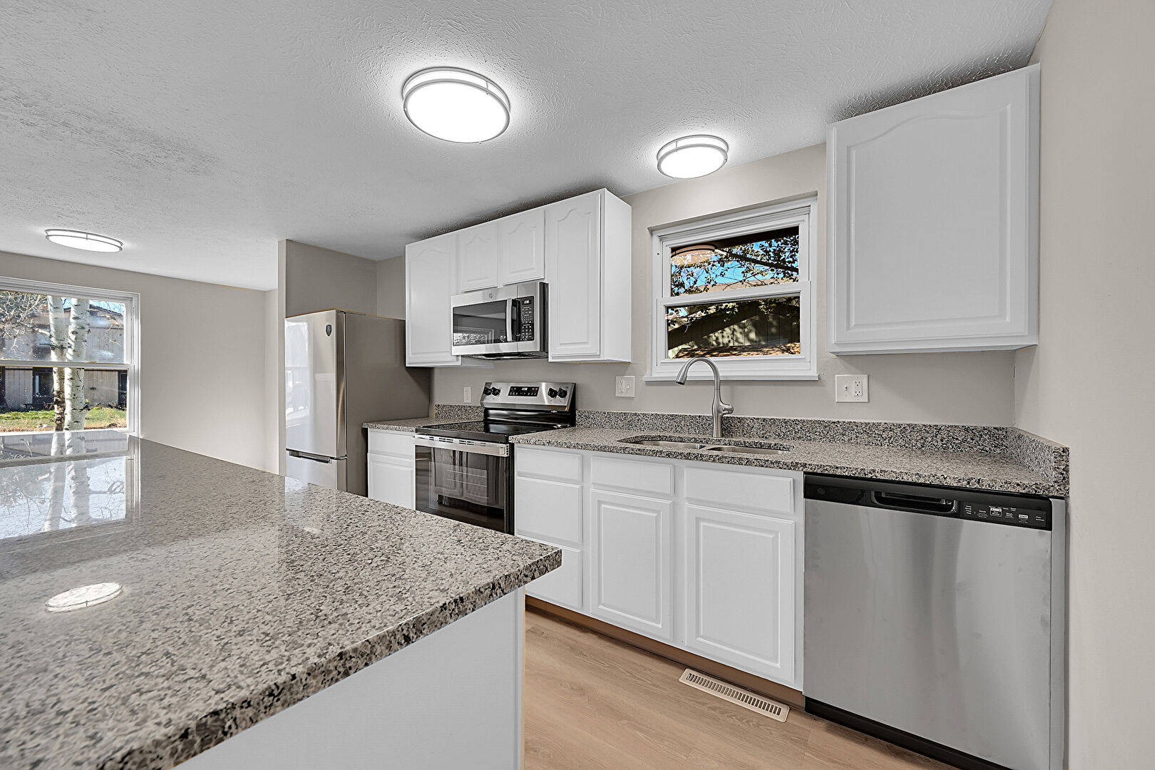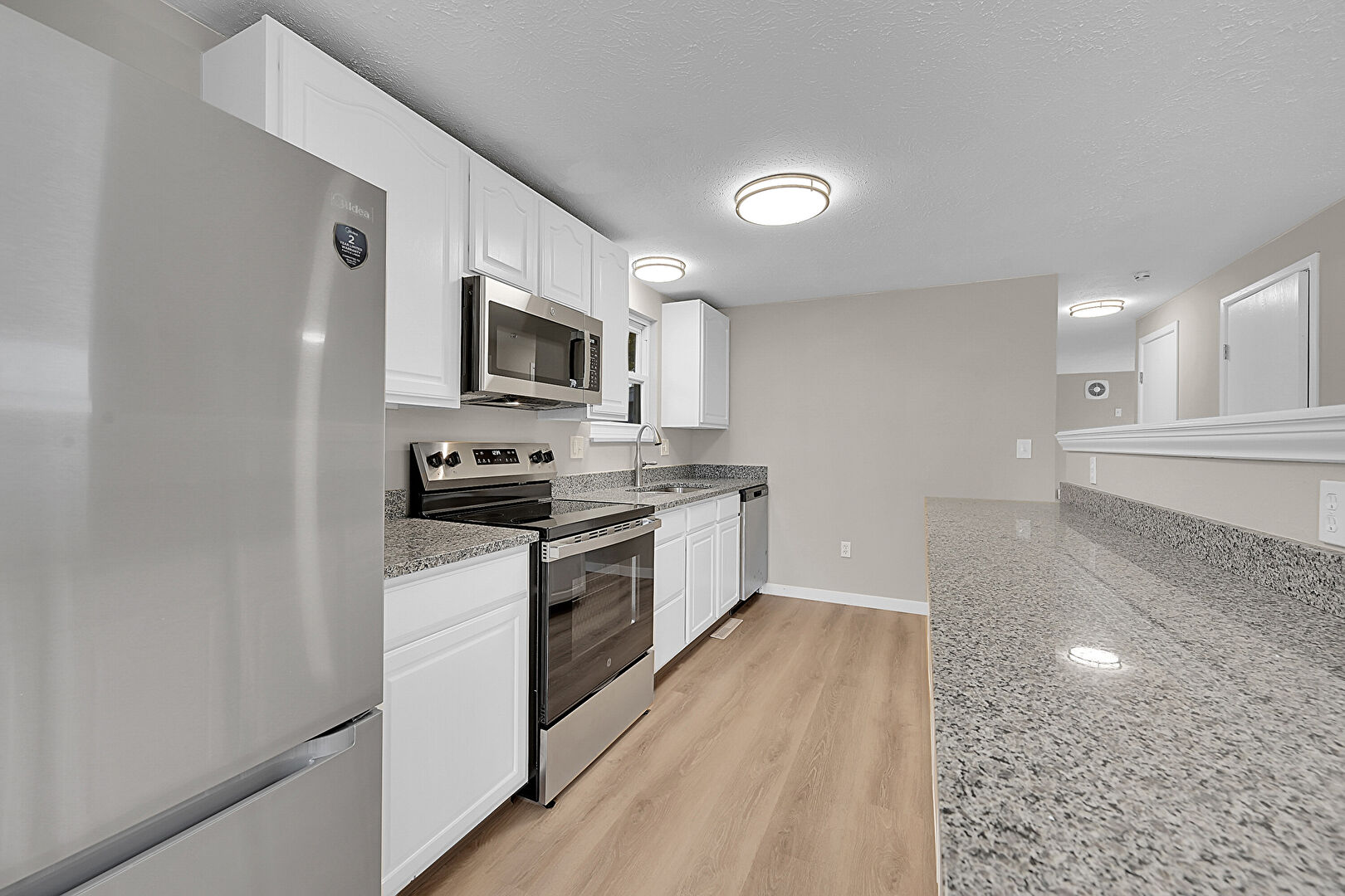 Arched Cabinets, Baseboards Wall, Drywall, Natural Light, One Wall Kitchen, Raised Cabinets, Stone Countertops, Textured Ceiling, Vent, Wood Finish Floor, Arched Cabinets, Wood Finish Floor
