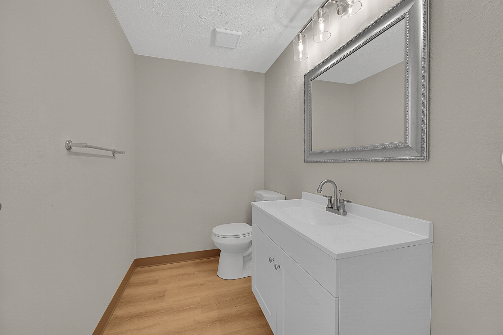 Baseboards Wall, Drywall, Half Bathroom, Textured Ceiling, Vanity, Wood Finish Floor, Vent