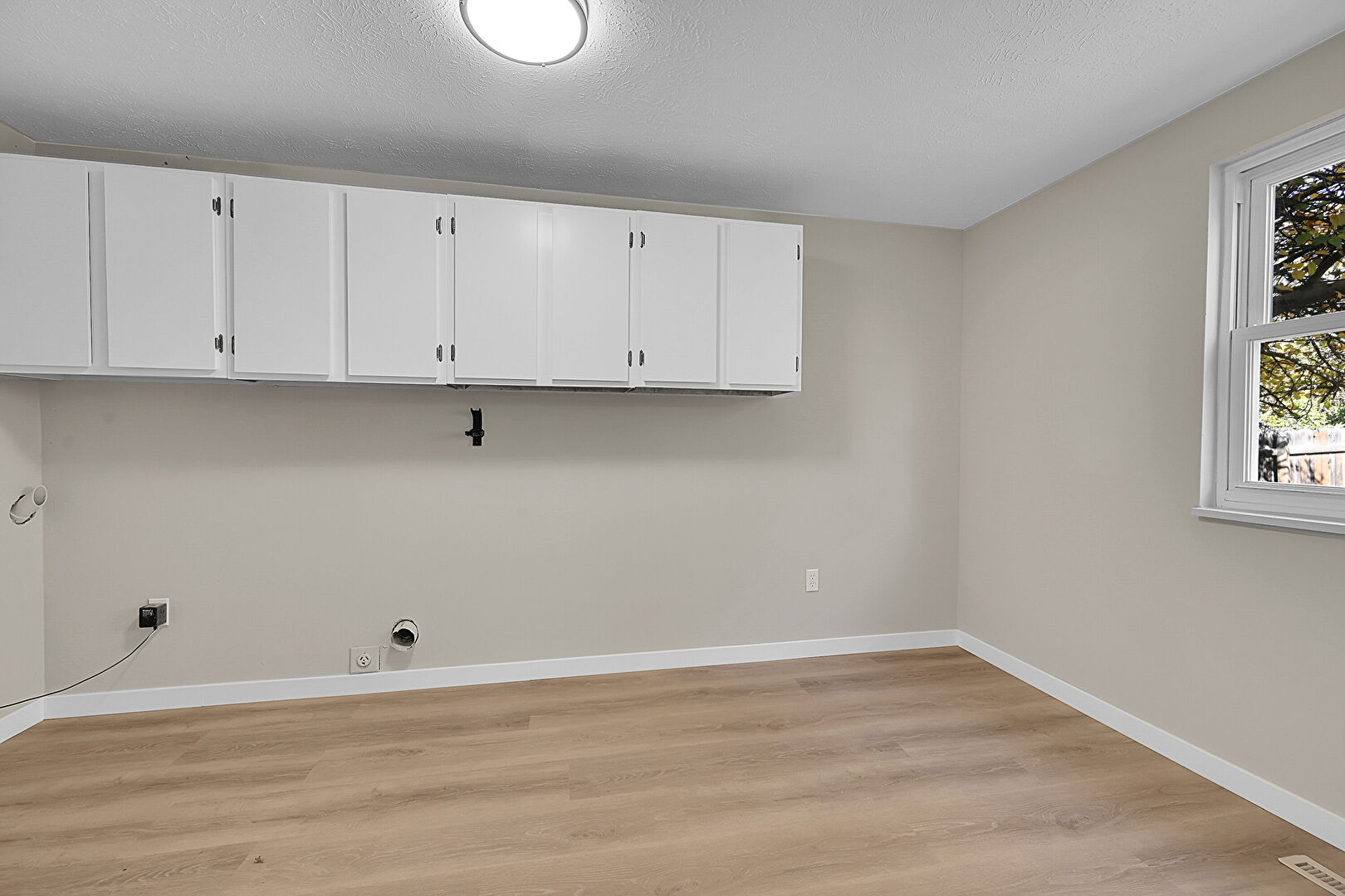 Baseboards Wall, Electric Dryer Hookup, Laundry, Natural Light, Textured Ceiling, Vent, Wood Finish Floor, Drywall