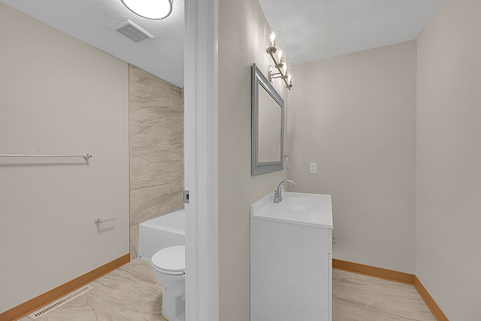 Baseboards Wall, Combined Bath Shower, Drywall, Full Bathroom, Vanity, Vent, Textured Ceiling
