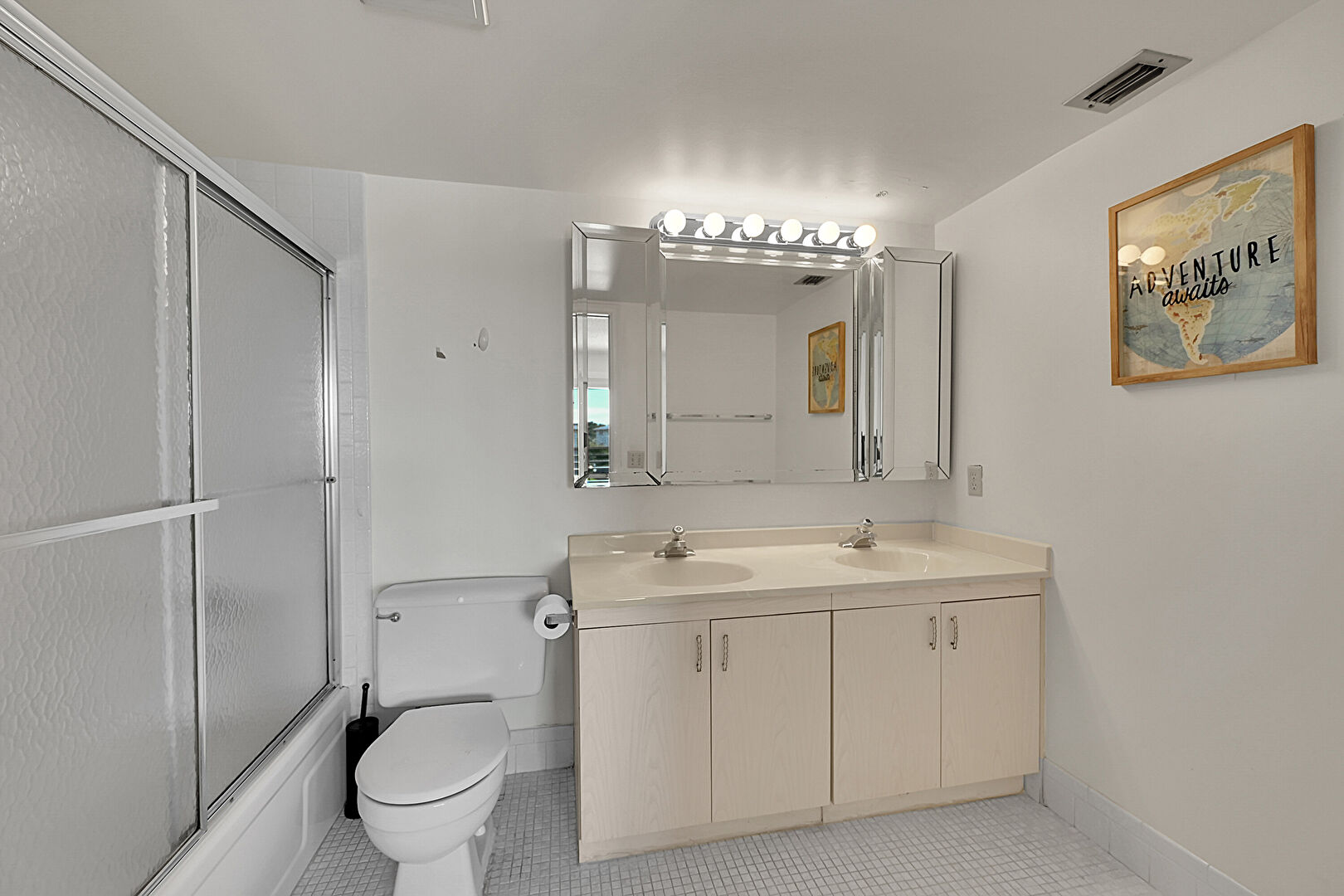 Baseboards Wall, Combined Bath Shower, Double Vanity, Drywall, Full Bathroom, Vent, Tile Floor
