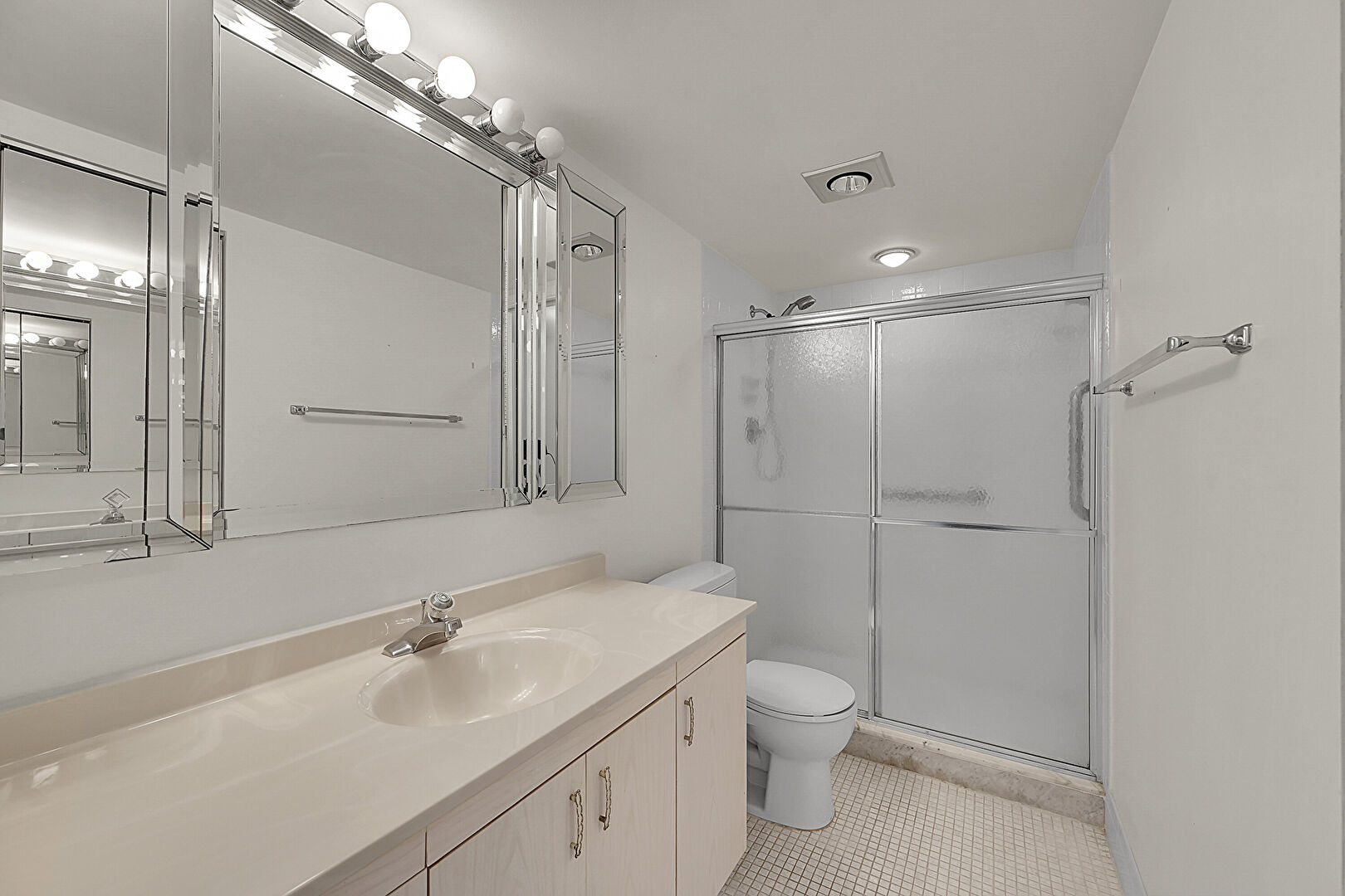 Drywall, Full Bathroom, Tile Floor, Vanity, Vent, Baseboards Wall