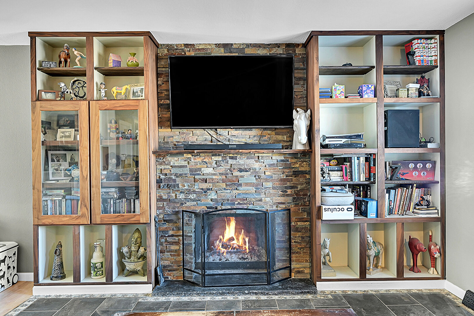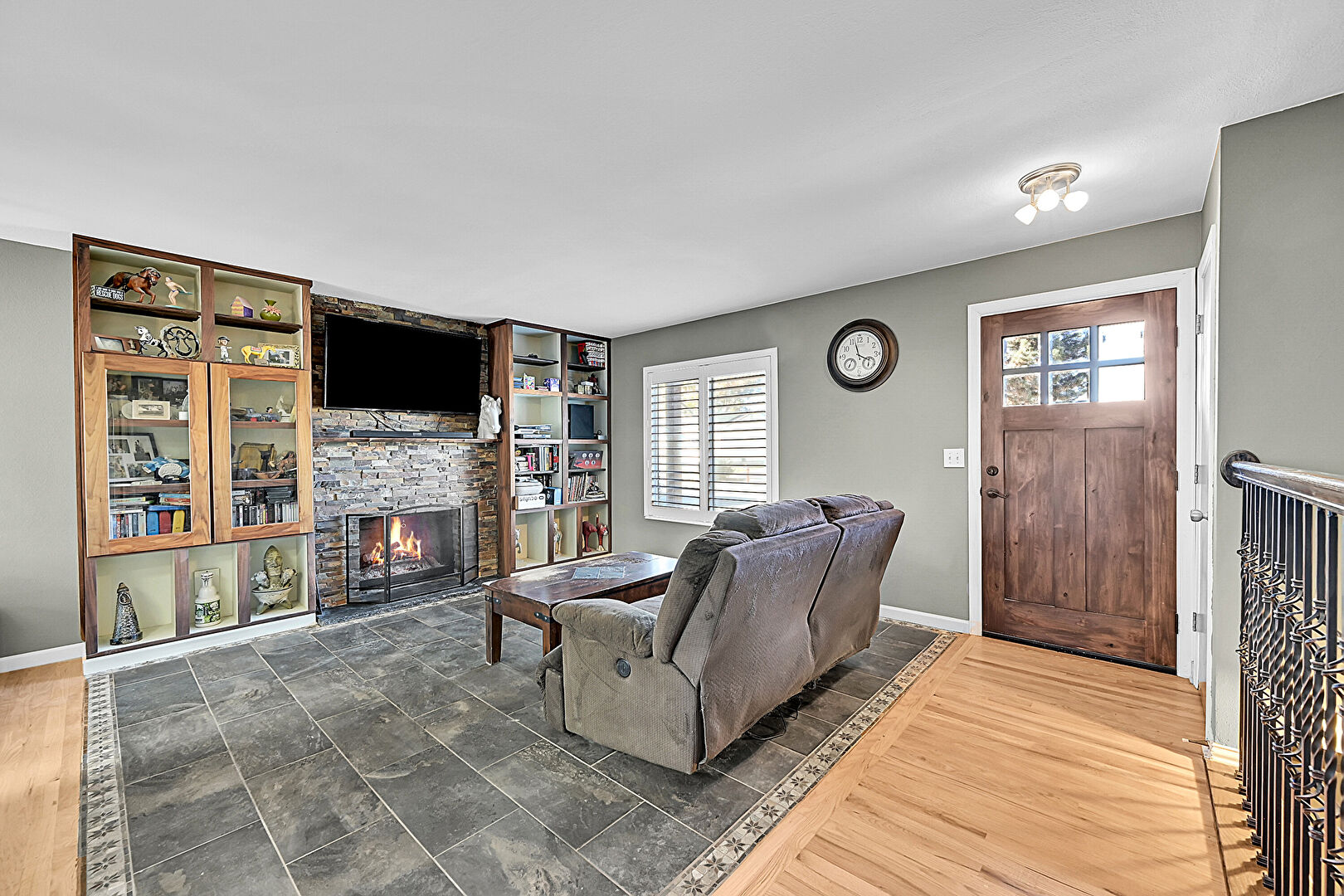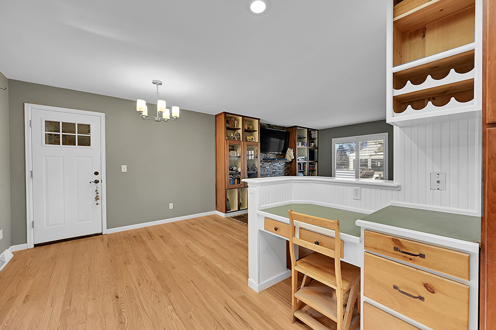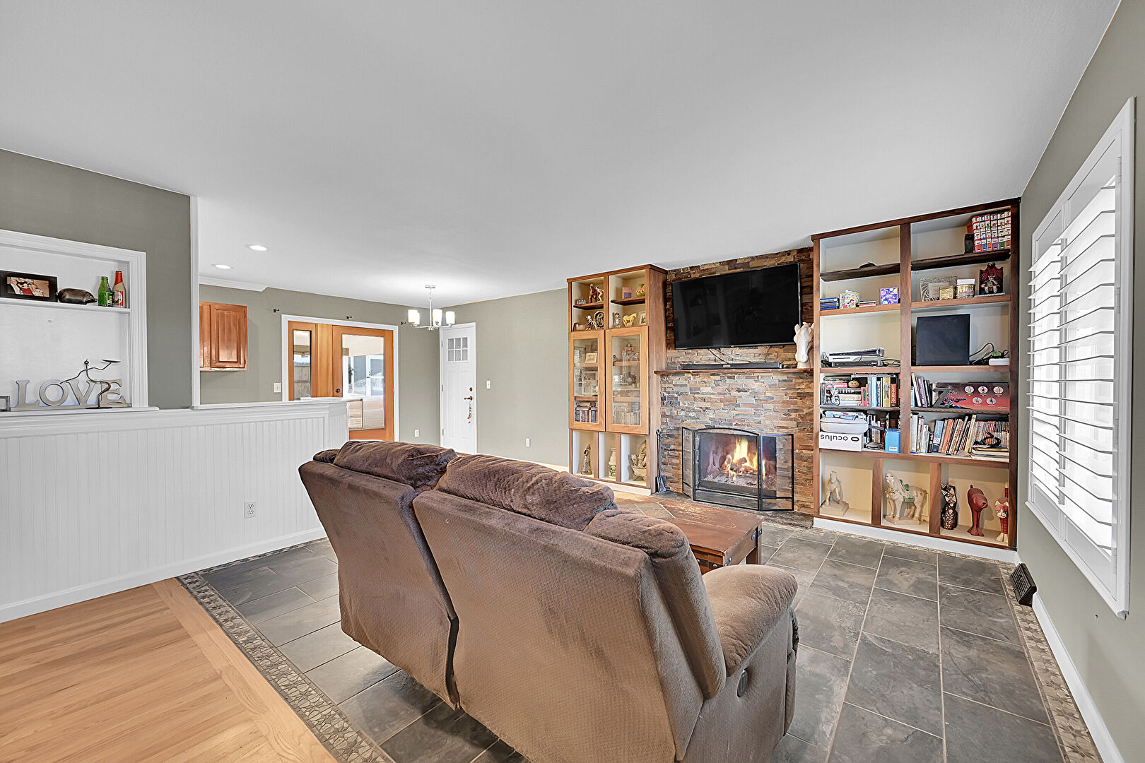 Baseboards Wall, Built In Shelves, Drywall, Natural Light, Notable Chandelier, Recessed Lighting, Tile Floor, Vent, Wood Finish Floor, Baseboards Wall, Fireplace, Natural Light