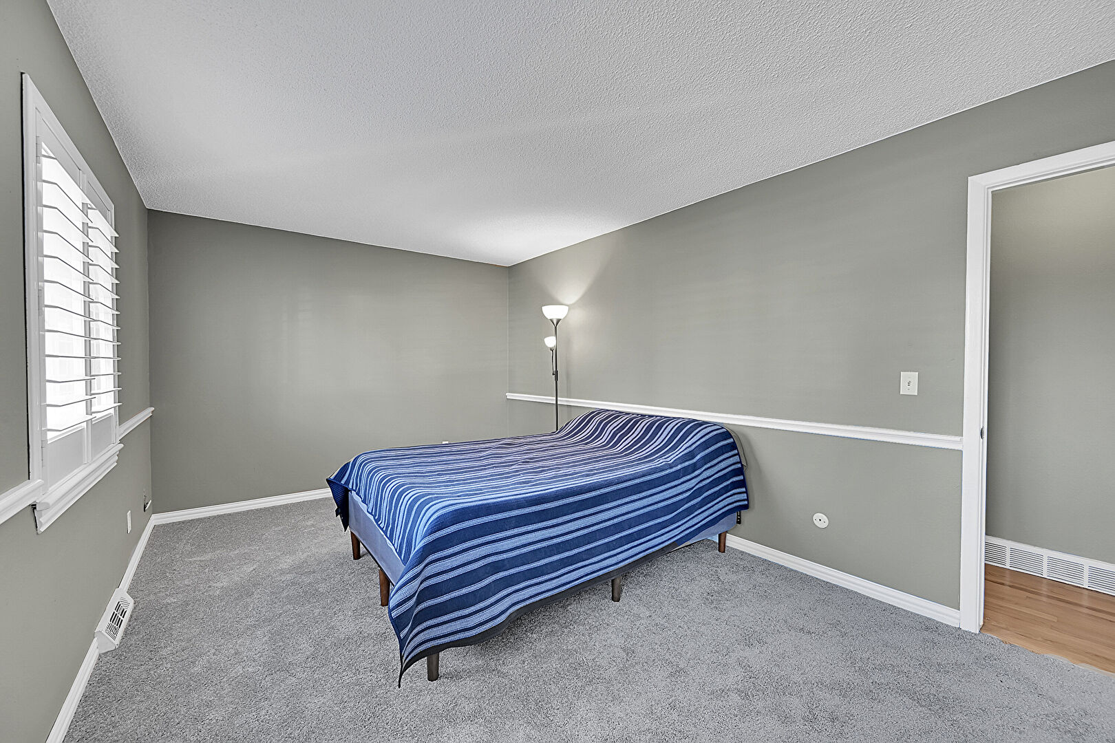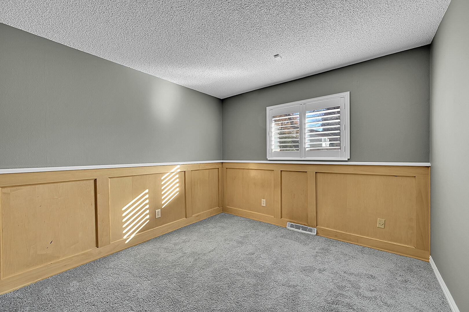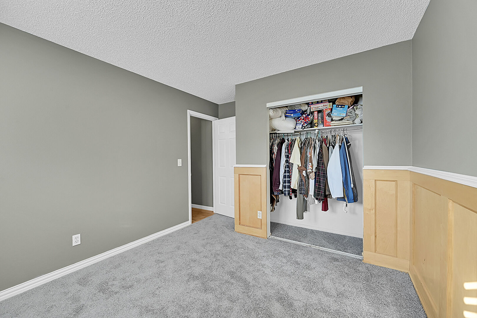 Baseboards Wall, Carpet, Closet, Drywall, Natural Light, Paneling Wall, Textured Ceiling, Vent, Wainscot Wall, Carpet, Textured Ceiling