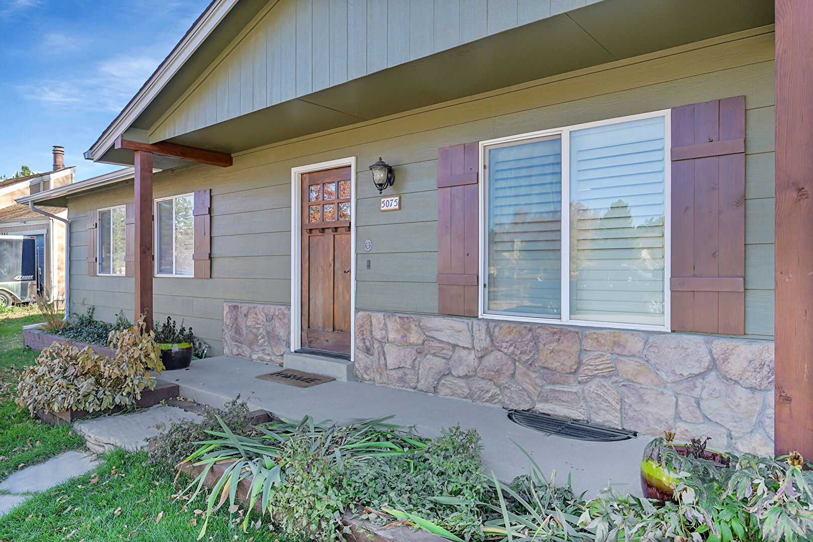Downspout, Driveway, Fence, Gutters, Horizontal Siding, Lawn, Shingle Roof, Stone Siding, Stoop, Vertical Siding, Driveway, Horizontal Siding