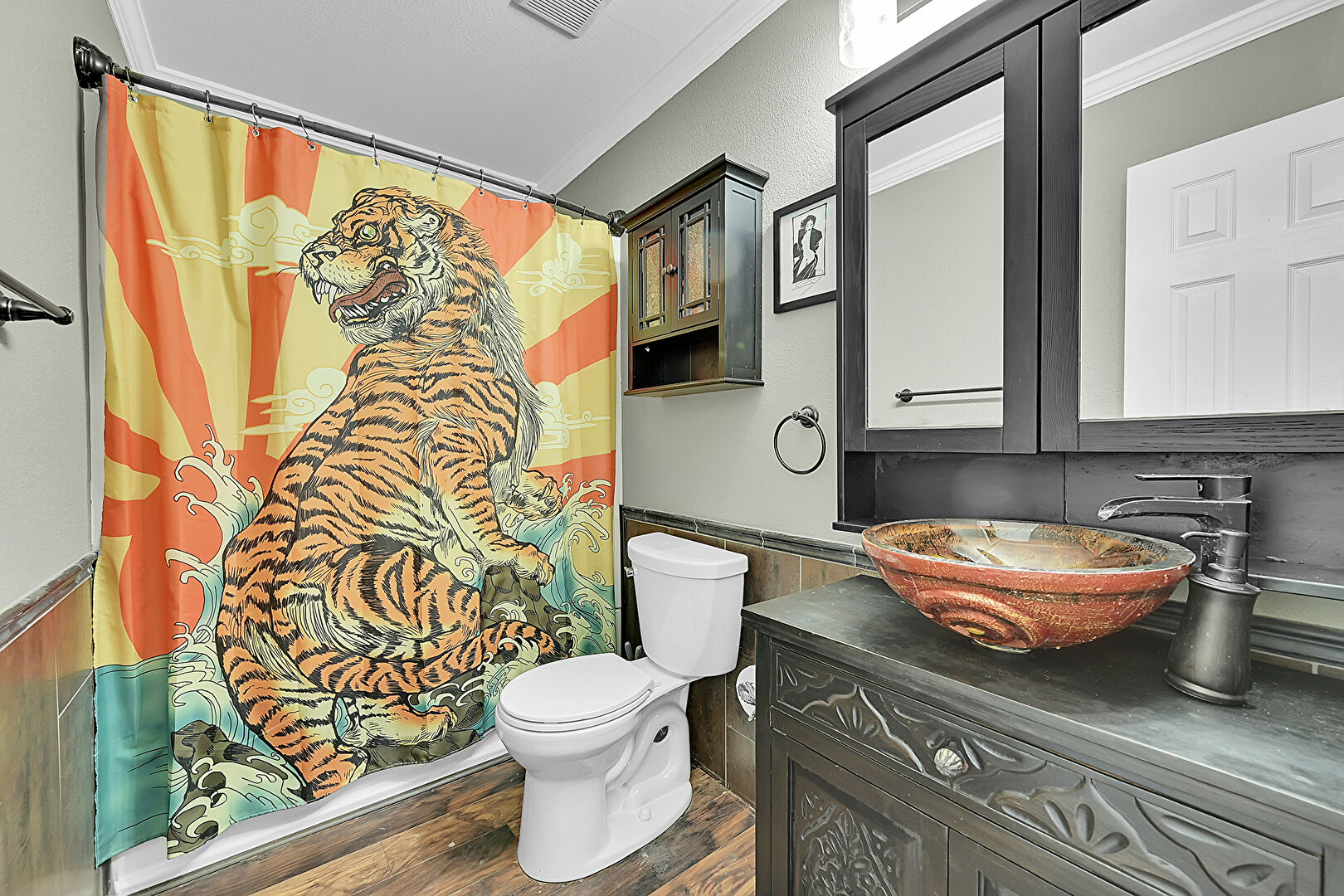 Crown Molding, Drywall, Full Bathroom, Tile Wall, Vanity, Wainscot Wall, Wood Finish Floor, Vent