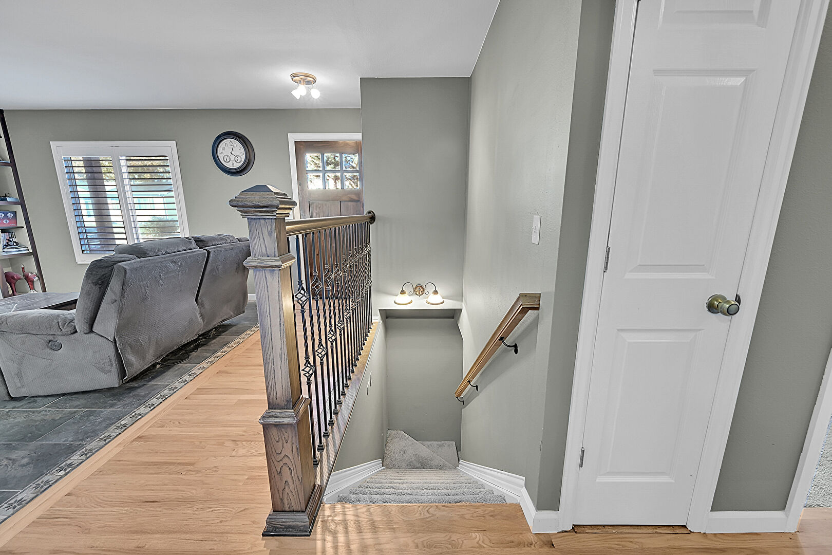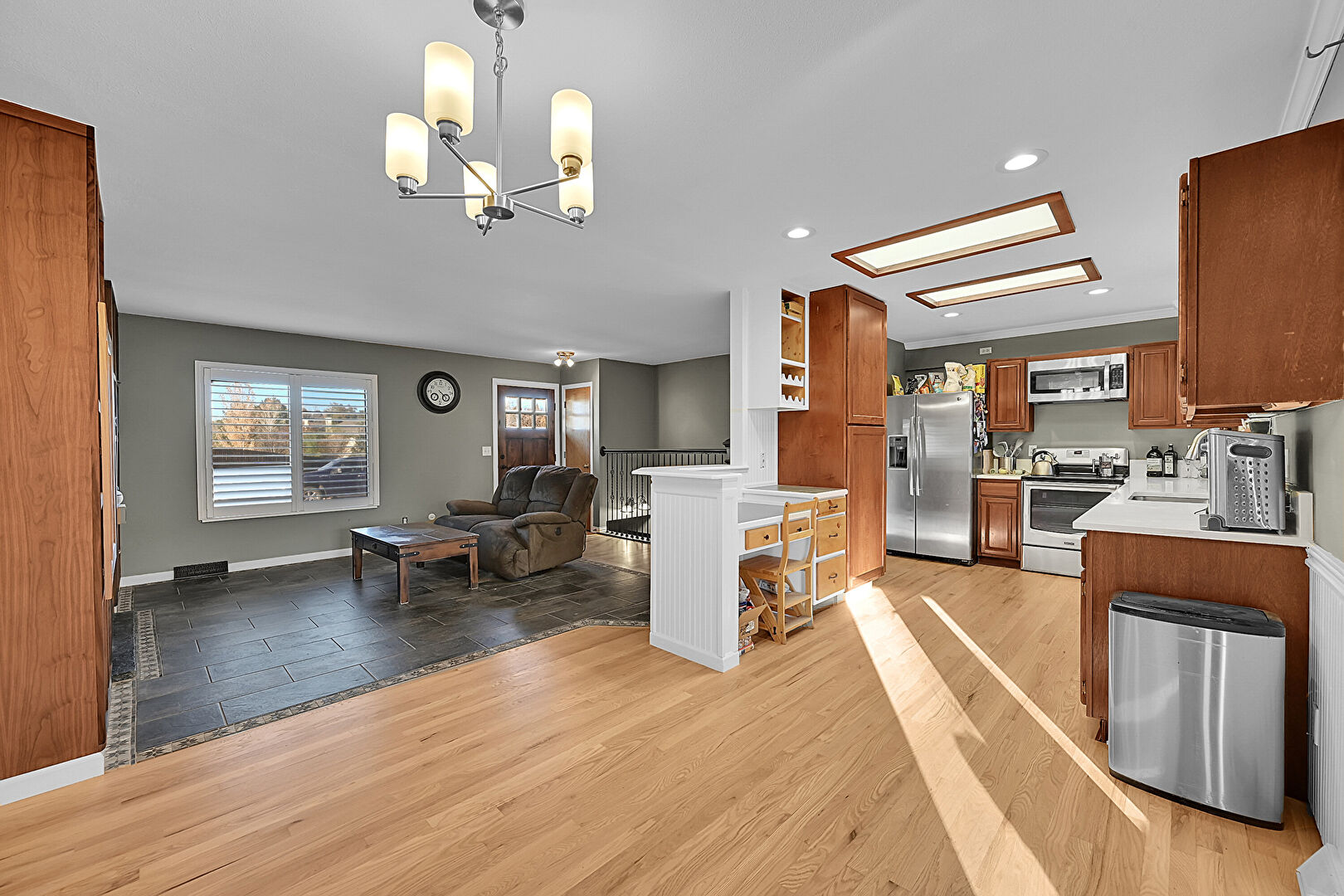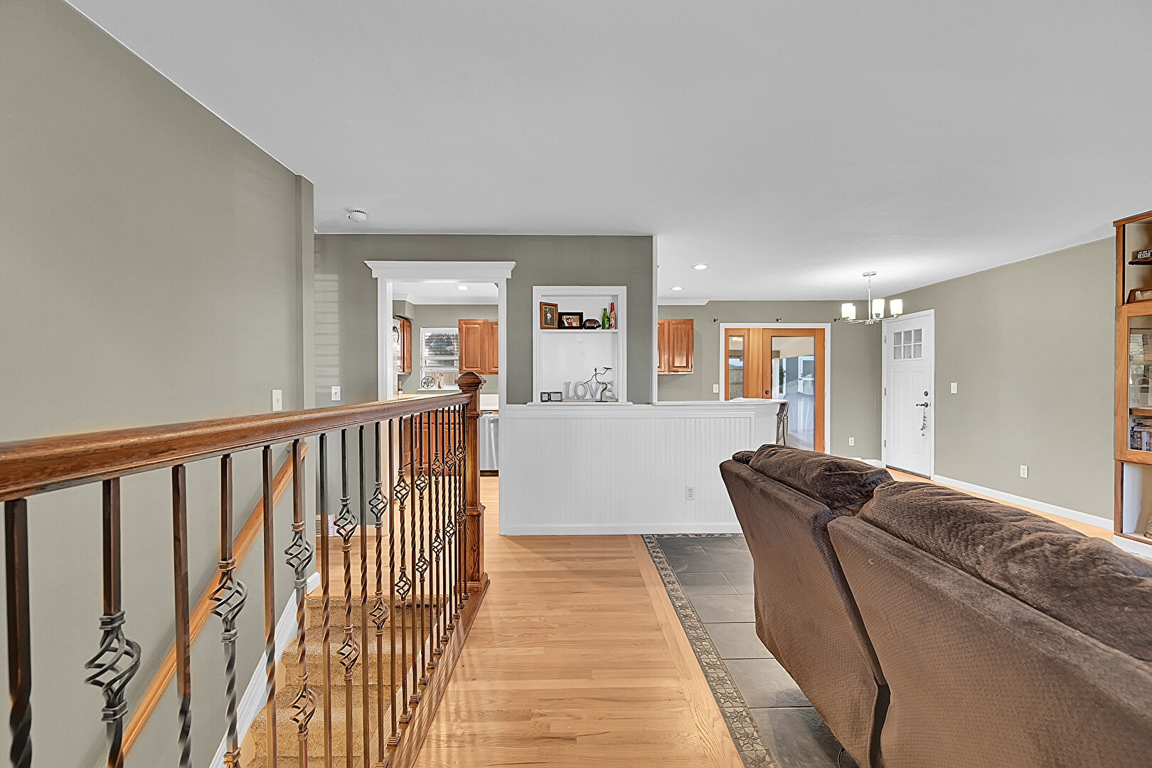 Baseboards Wall, Drywall, Inlaid Floor, Natural Light, Notable Chandelier, Recessed Lighting, Tile Floor, Wood Finish Floor, Upstairs Landing