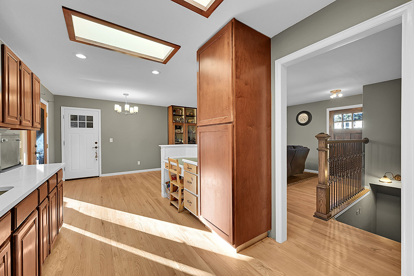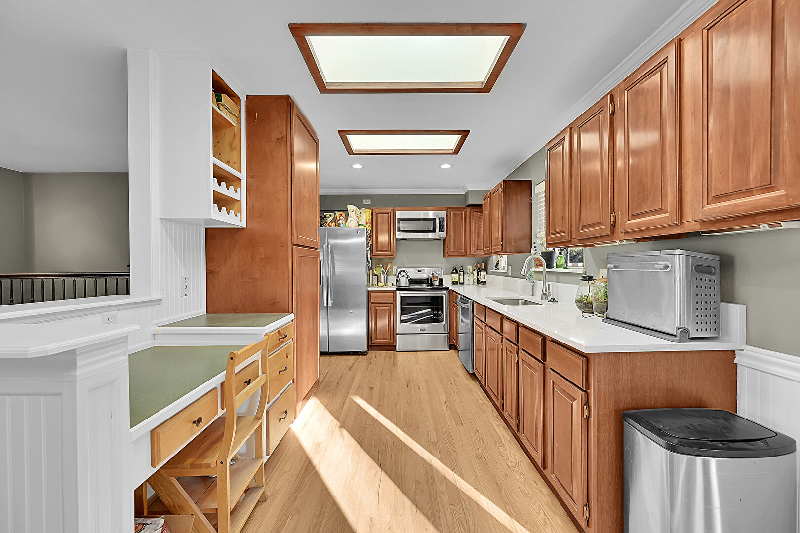 Baseboards Wall, Crown Molding, Drywall, Medium Brown Cabinets, Natural Light, Notable Chandelier, Open Shelves, Pendant Lighting, Raised Cabinets, Recessed Lighting, Skylight, Stone Countertops, Toaster, U Shaped Kitchen, Visible Hinge Cabinets, Wainscot Wall, Wood Finish Floor, Wood Wall, Medium Brown Cabinets, Paneling Wall, Recessed Lighting, Vent