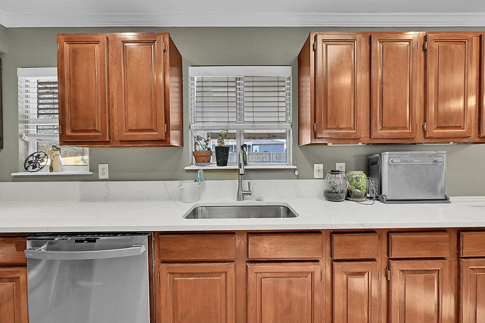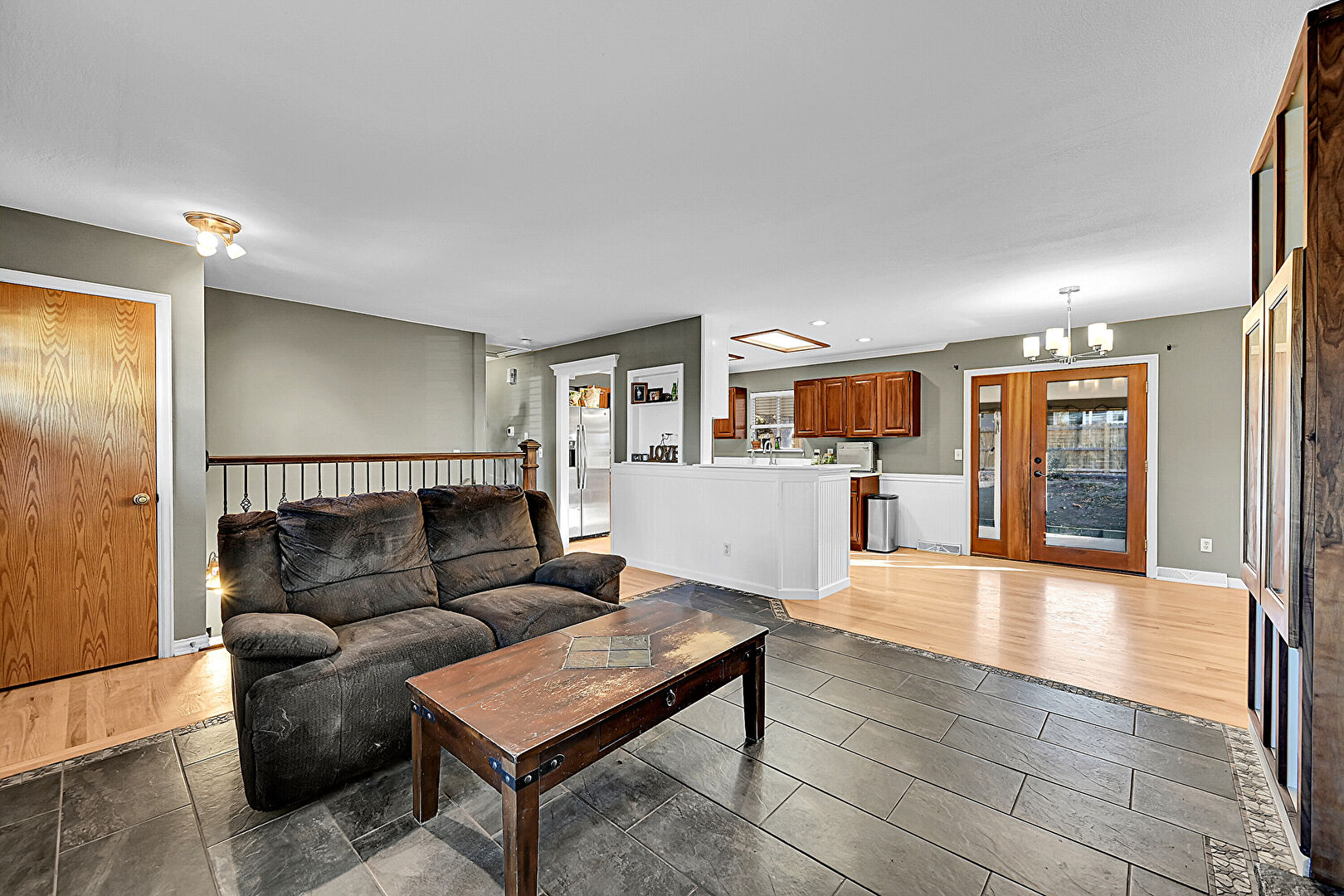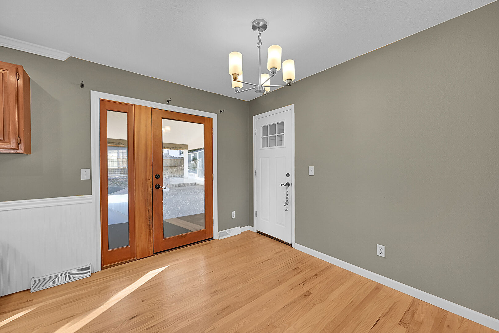 Baseboards Wall, Crown Molding, Dehumidifier, Drywall, French Doors, Medium Brown Cabinets, Natural Light, Notable Chandelier, Open Shelves, Opens To Living Area, Pendant Lighting, Recessed Lighting, Shaker Cabinets, U Shaped Kitchen, Vent, Wainscot Wall, Wood Finish Floor, Natural Light, Notable Chandelier