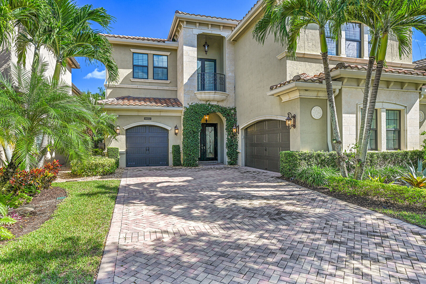 Balcony, Built In Garage, Downspout, Driveway, Gutters, Lawn, Stucco Siding, Tile Roof, Balcony, Downspout, Driveway, Stucco Siding, Tile Roof