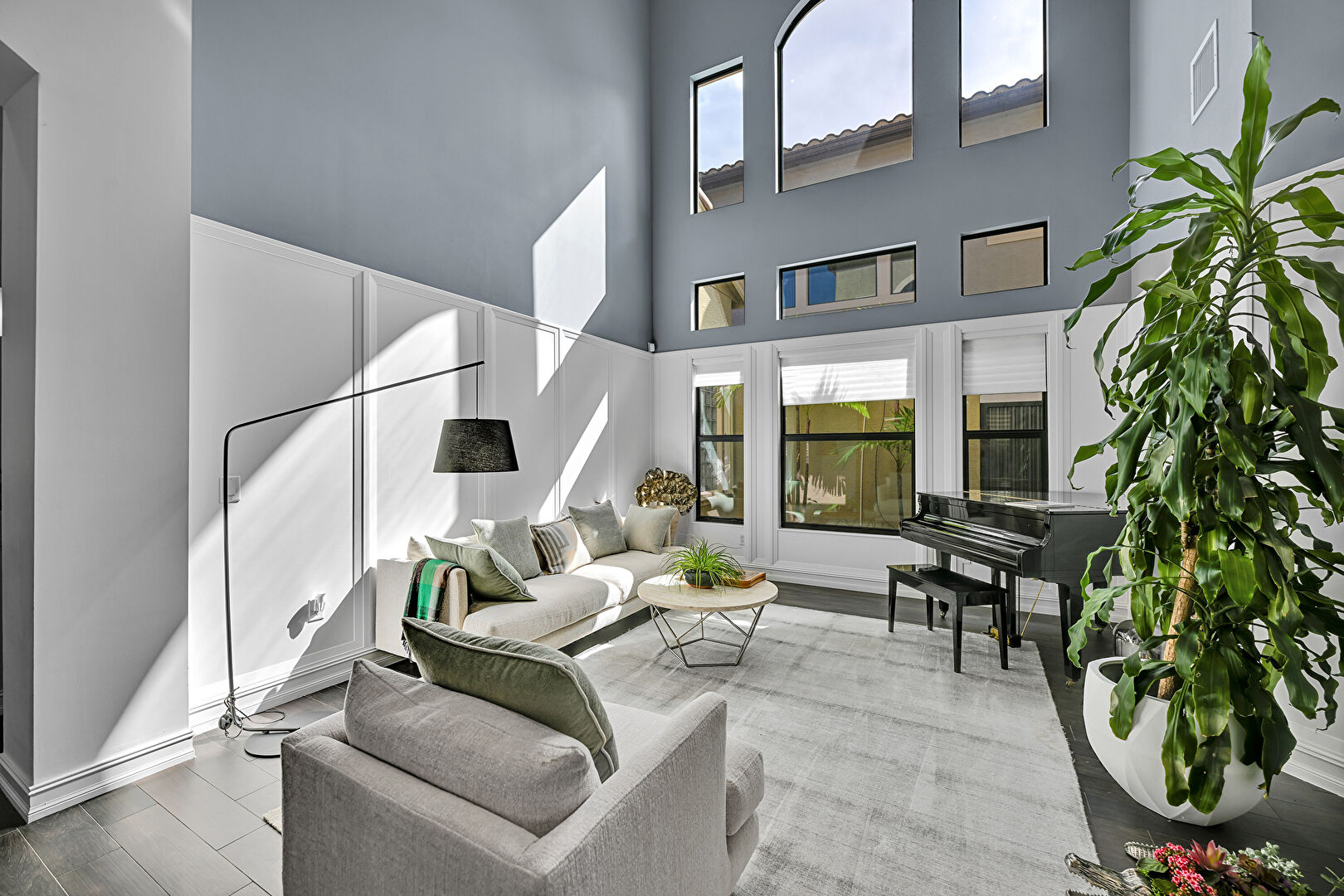 Arched Walkways, Baseboards Wall, Drywall, French Doors, High Ceiling, Natural Light, Recessed Lighting, Stairs, Wood Finish Floor, Drywall, Stairs