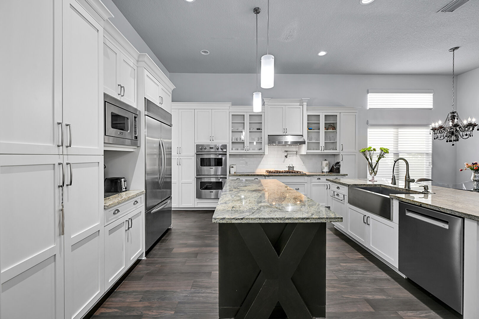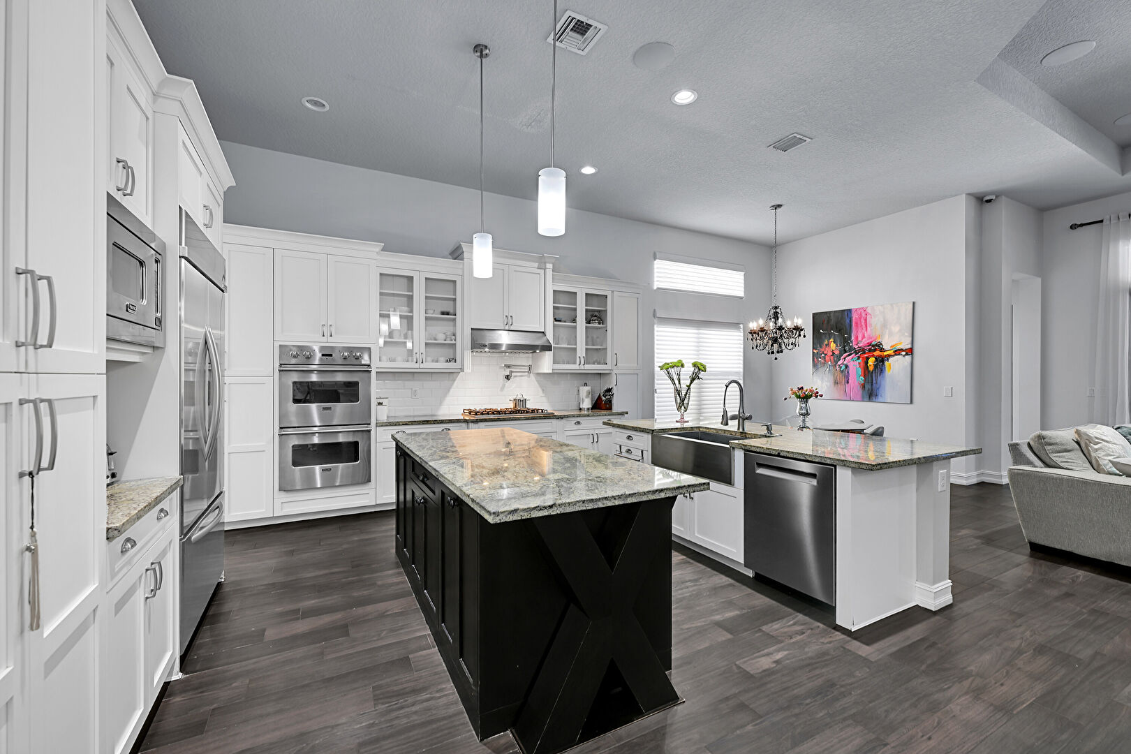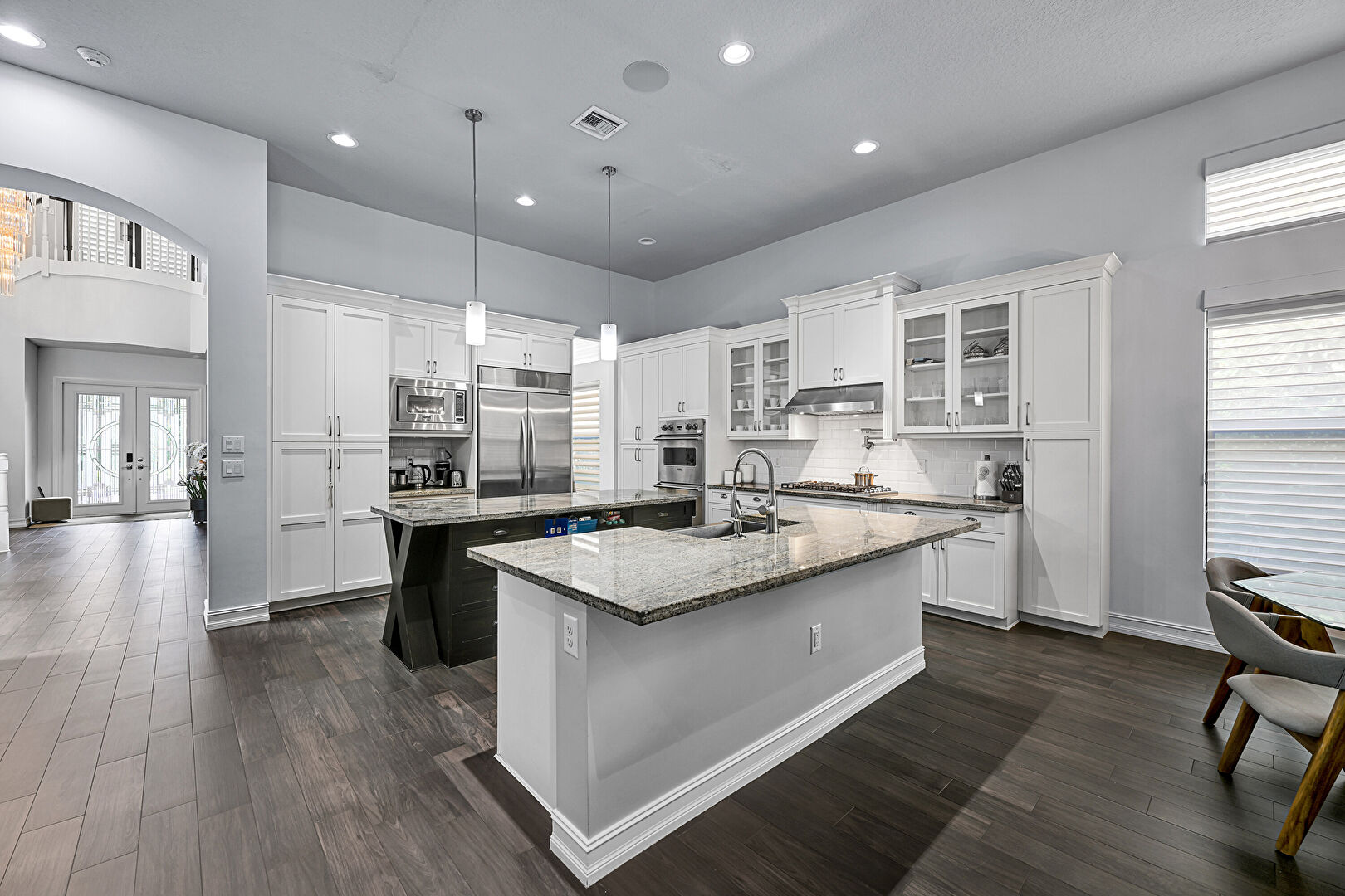 Arched Walkways, Baseboards Wall, Black Cabinets, Ceiling Fan, Crown Molding Cabinets, Double Oven, Drywall, French Doors, Glass Insert Cabinets, High Ceiling, Kitchen Bar, Kitchen Island, L Shaped Kitchen, Multiple Kitchen Islands, Natural Light, Notable Chandelier, Open Shelves, Opens To Living Area, Pendant Lighting, Pot Filler, Recessed Lighting, Shaker Cabinets, Stone Countertops, Textured Ceiling, Tray Ceiling, U Shaped Kitchen, Vent, Wood Finish Floor, Baseboards Wall, Double Oven, Glass Insert Cabinets, Notable Chandelier, Opens To Living Area, Stone Countertops, Vent