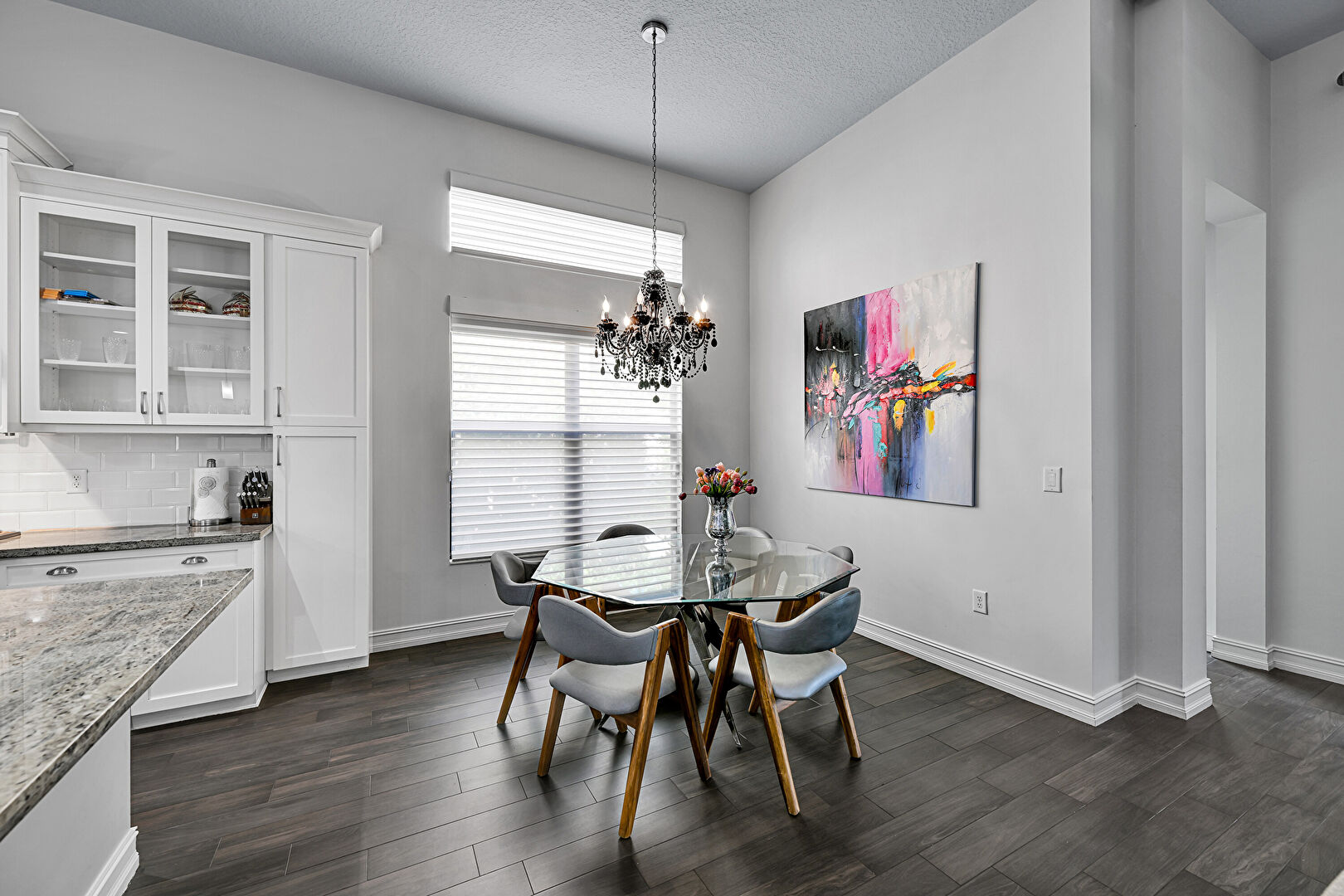Baseboards Wall, Ceiling Fan, Drywall, High Ceiling, L Shaped Kitchen, Natural Light, Notable Chandelier, Recessed Lighting, Stairs, Tray Ceiling, Vent, Wood Finish Floor, Drywall, Textured Ceiling, Tray Ceiling, Vent, Wood Finish Floor