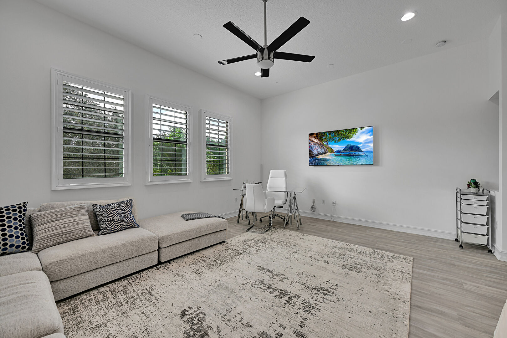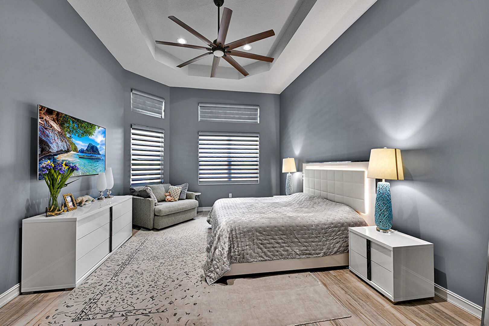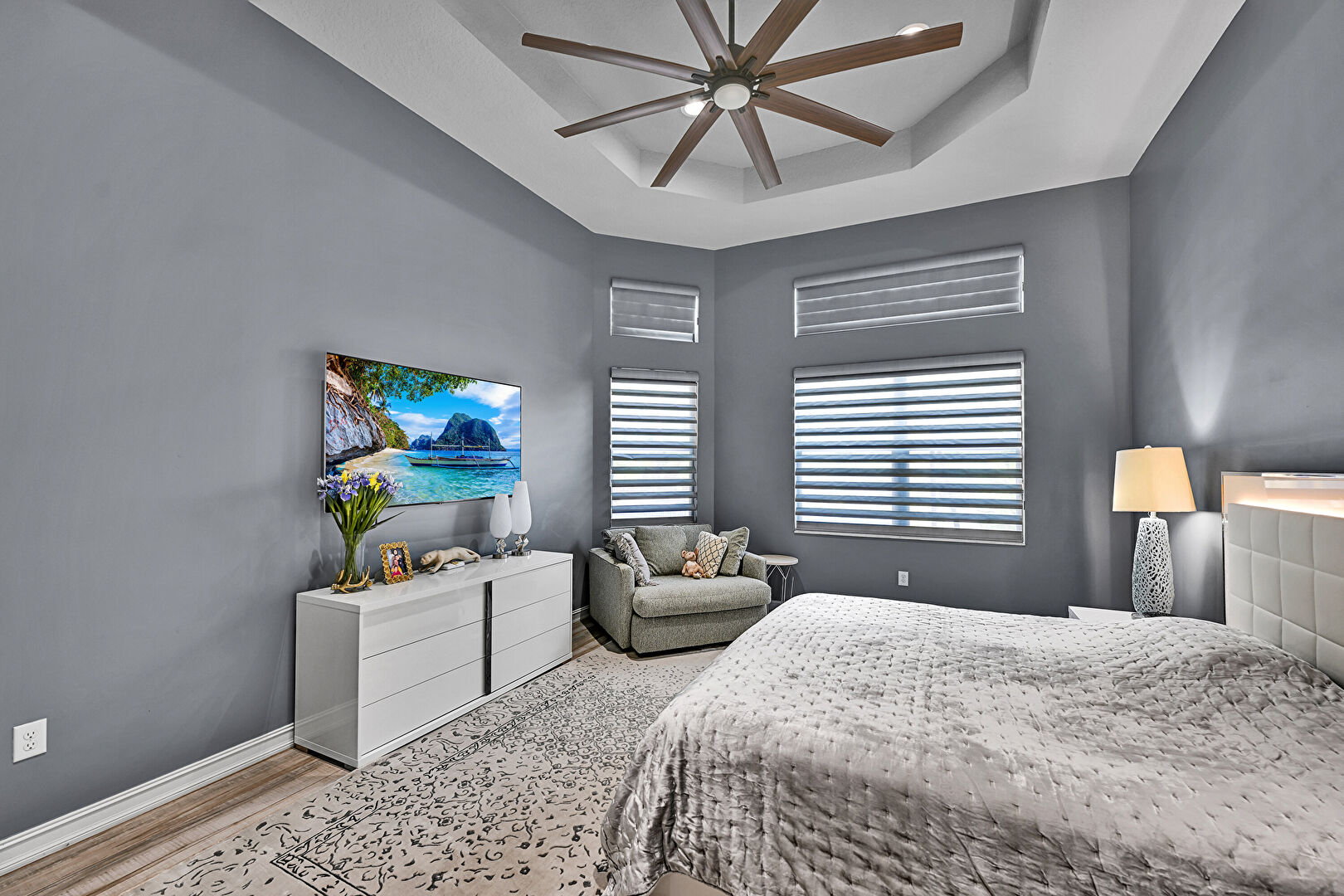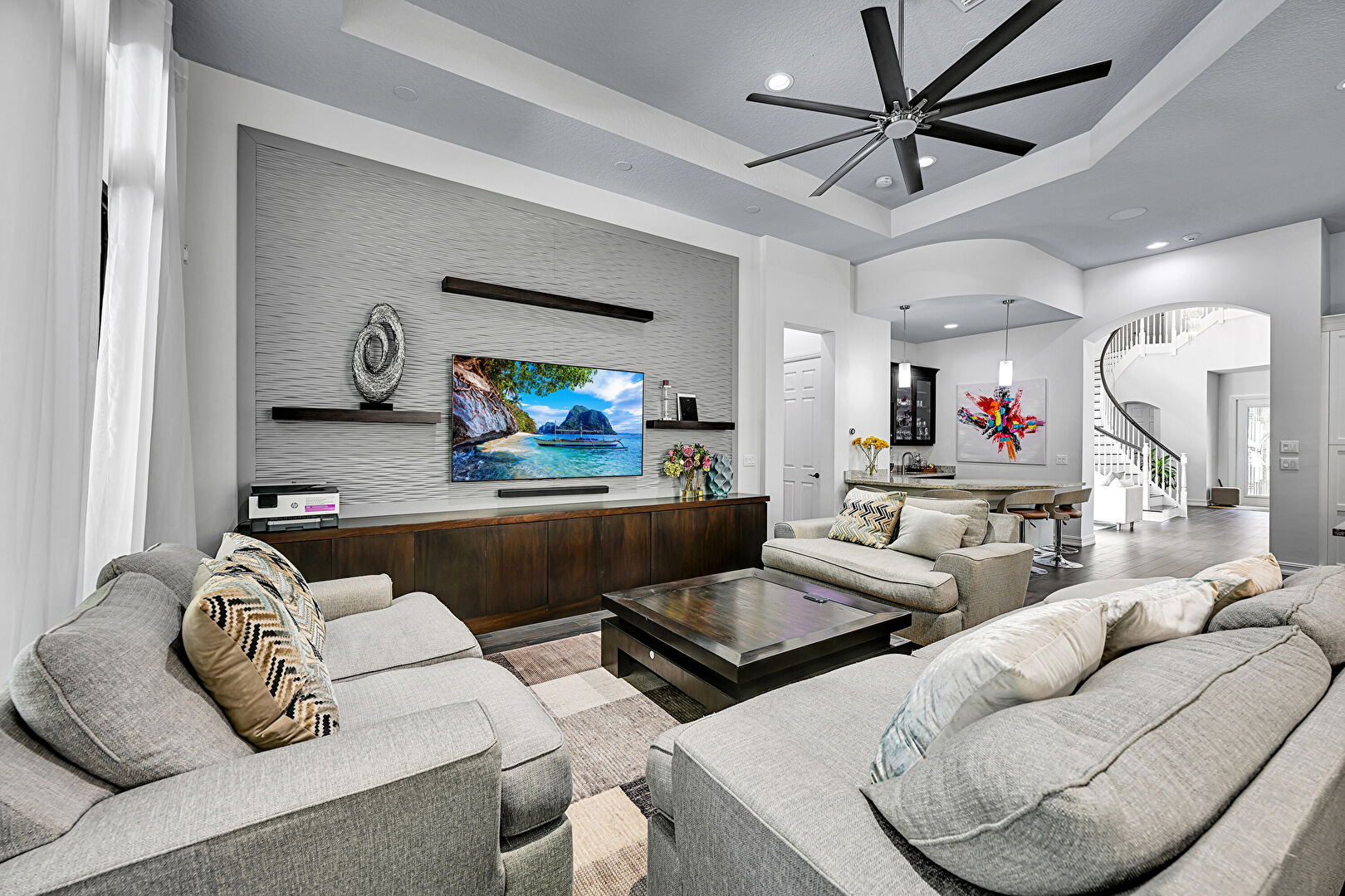 Ceiling Fan, Drywall, Natural Light, Recessed Lighting, Stairs, Tray Ceiling, Wood Finish Floor, Baseboards Wall, Tray Ceiling