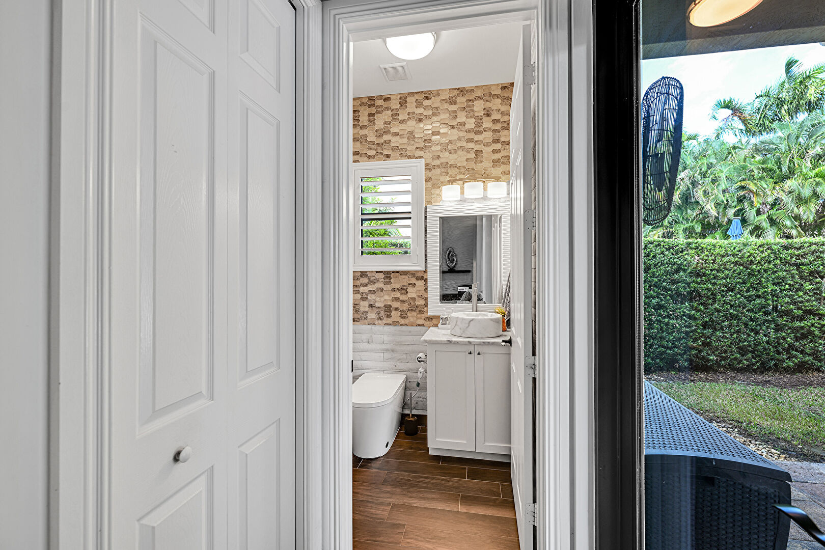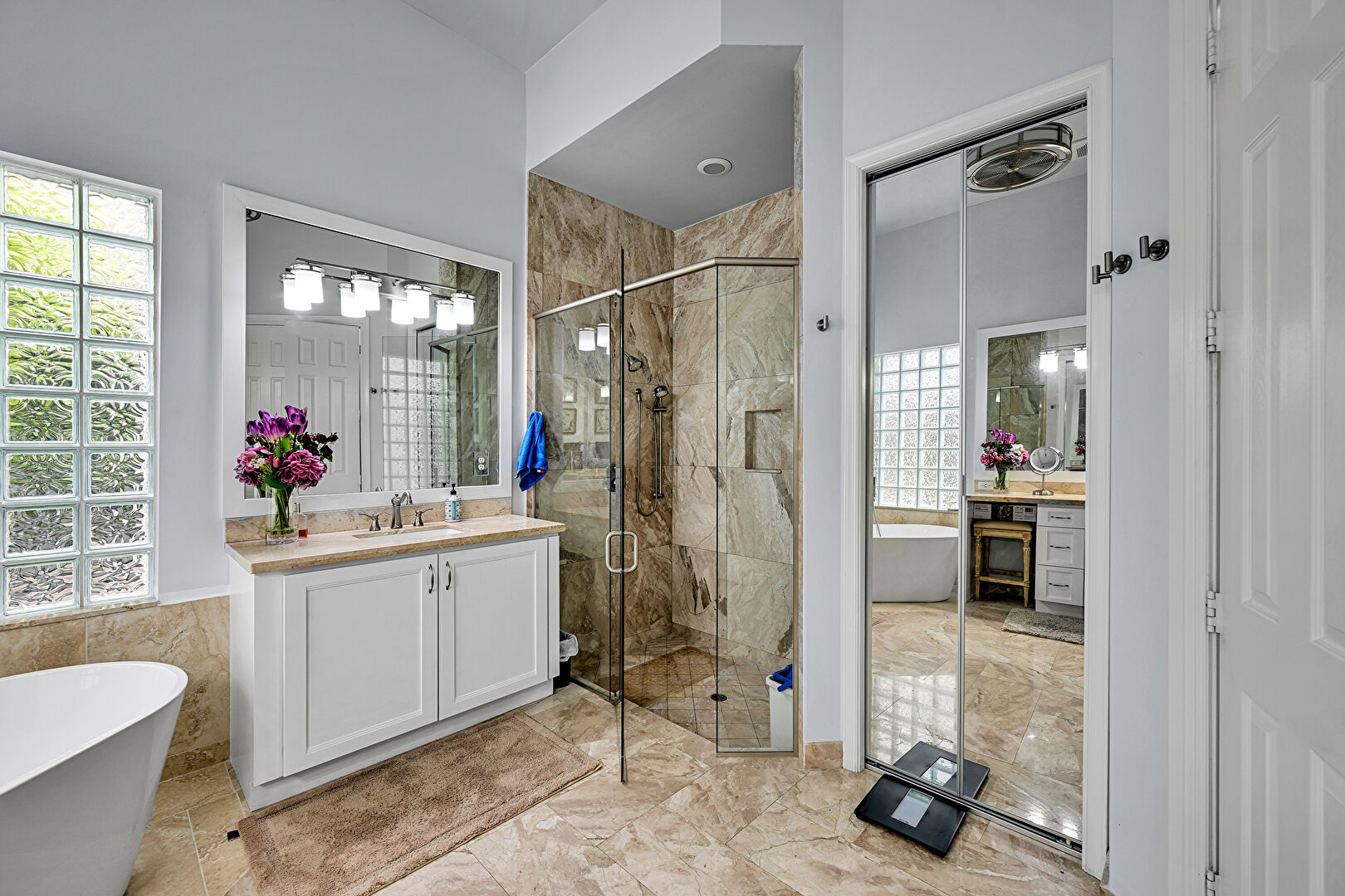 Baseboards Wall, Bidet, Ceiling Fan, Drywall, Ensuite Bathroom, Full Bathroom, Marble Finish Floor, Natural Light, Recessed Lighting, Tile Wall, Two Single Vanities, Vanity, Wainscot Wall, Water Closet, Wood Finish Floor, Baseboards Wall, Drywall, Full Bathroom, Natural Light, Vanity