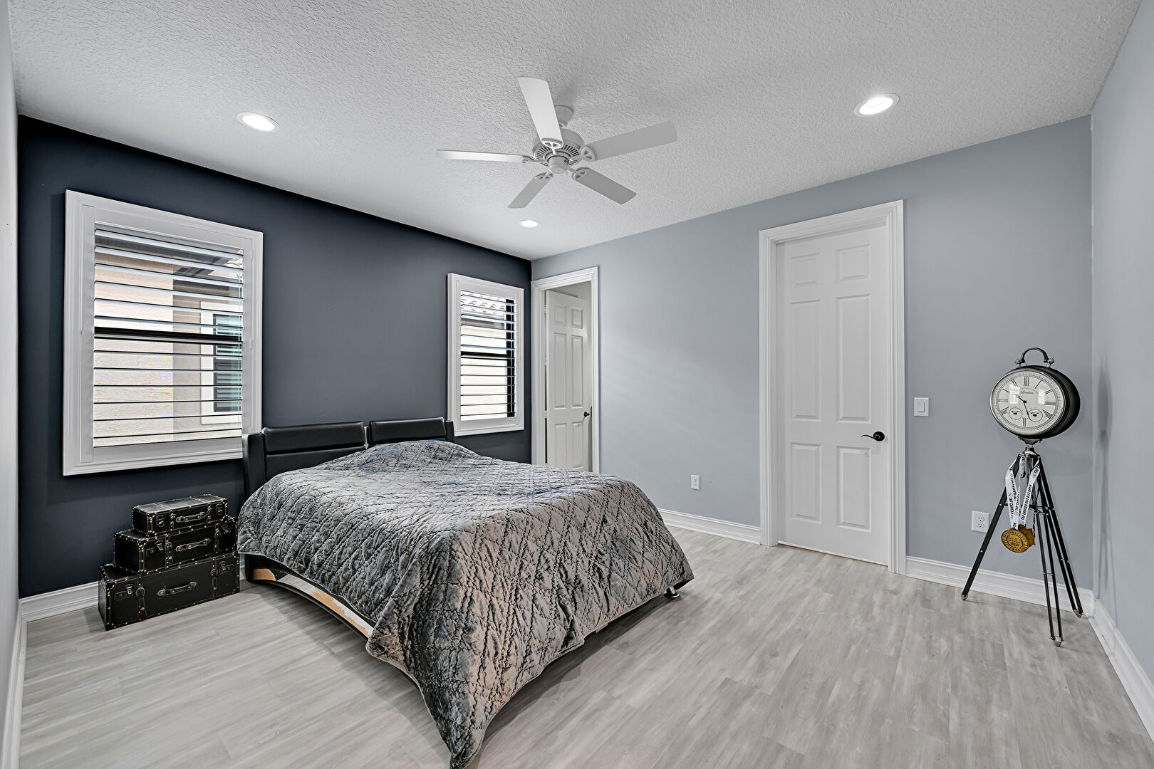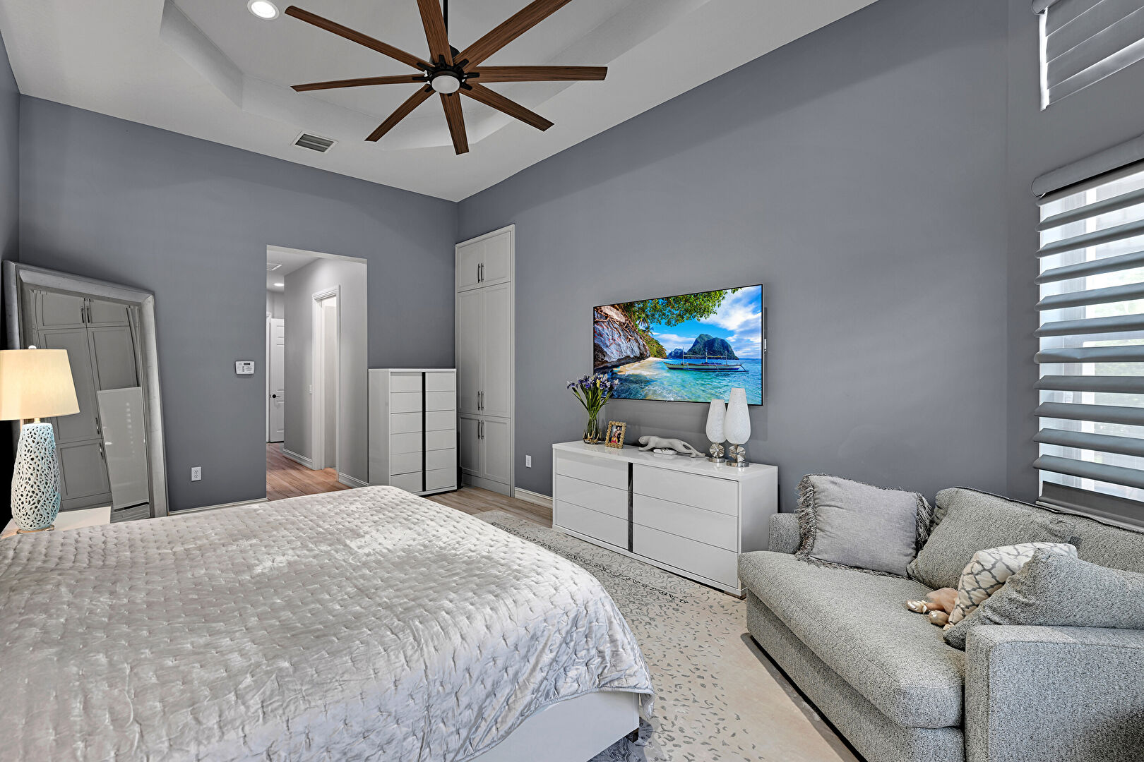 Access To Exterior, Baseboards Wall, Ceiling Fan, Drywall, Natural Light, Recessed Lighting, Smoke Carbon Monoxide Detector, Textured Ceiling, Tray Ceiling, Vent, Wood Finish Floor, Ceiling Fan, Drywall, Recessed Lighting, Wood Finish Floor