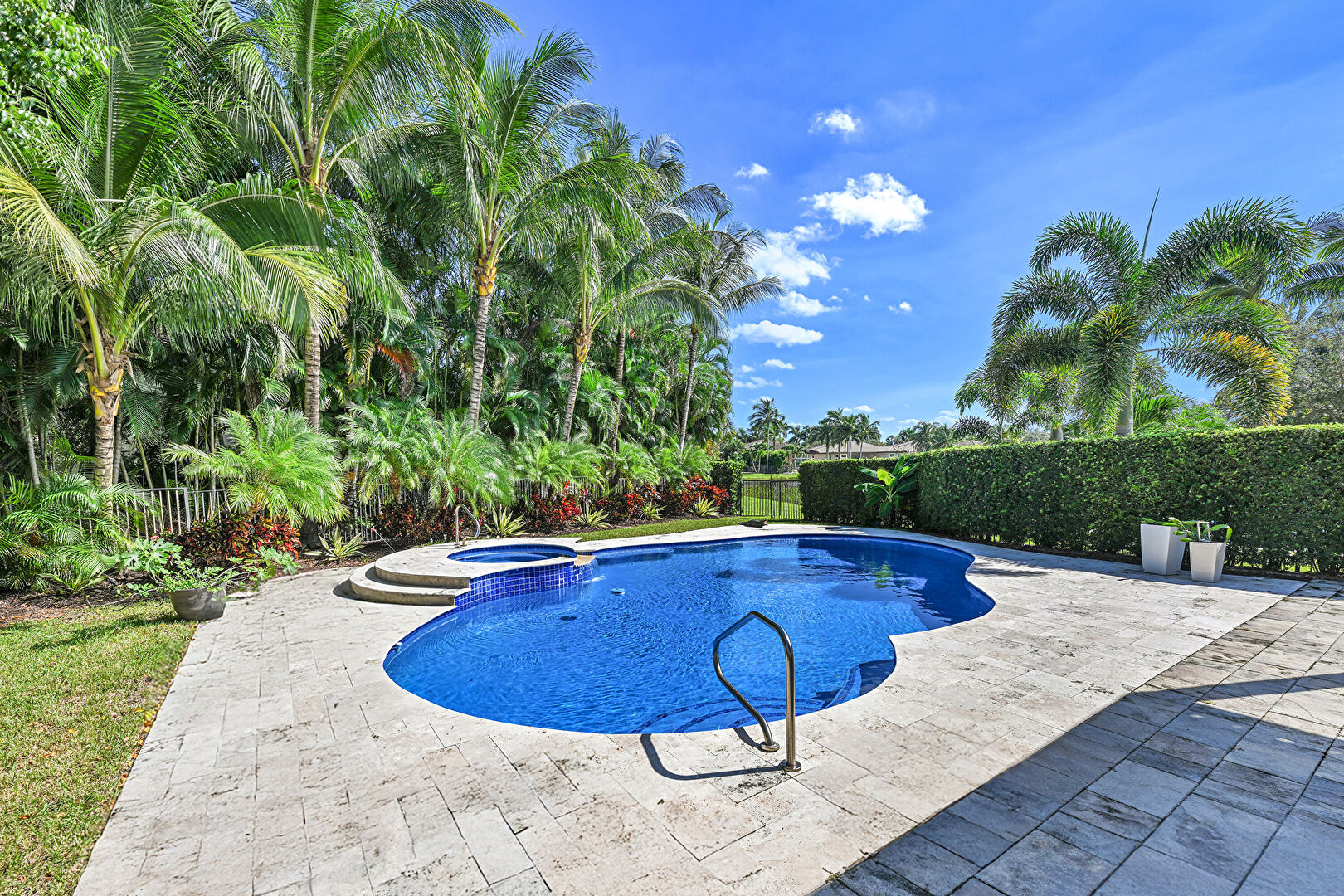 Ceiling Fan, Fence, Handrail, Hot Tub, Lawn, Outdoor Living Space, Patio, Pool, Pool Hot Tub Combo, Residential View, Woods View, Fence, Handrail, Hot Tub, Pool, Pool Hot Tub Combo