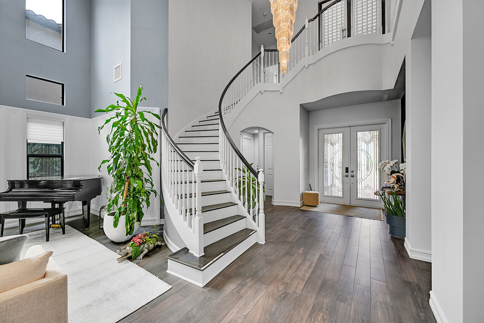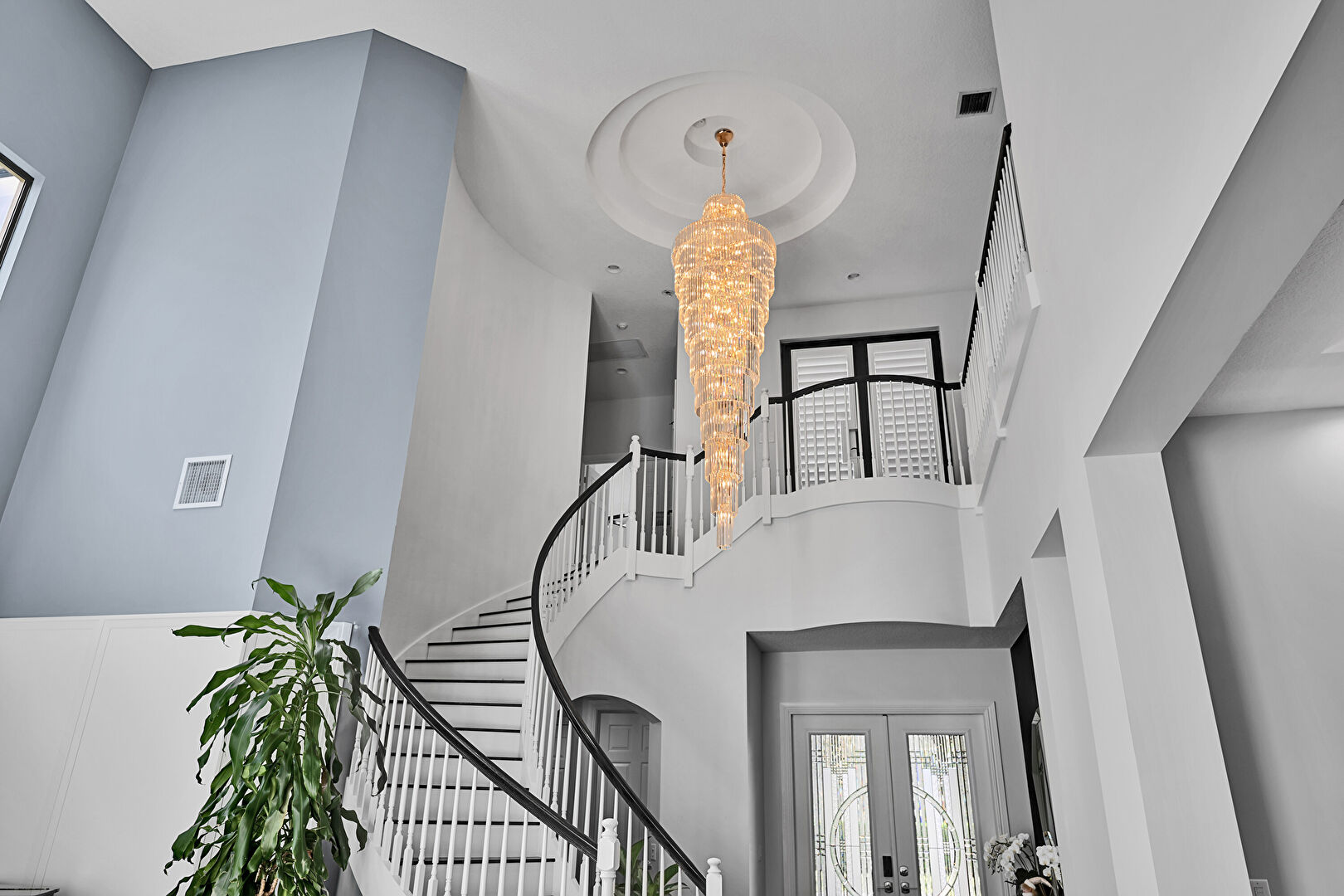 Drywall, French Doors, Natural Light, Notable Chandelier, Stairs, Vent, High Ceiling