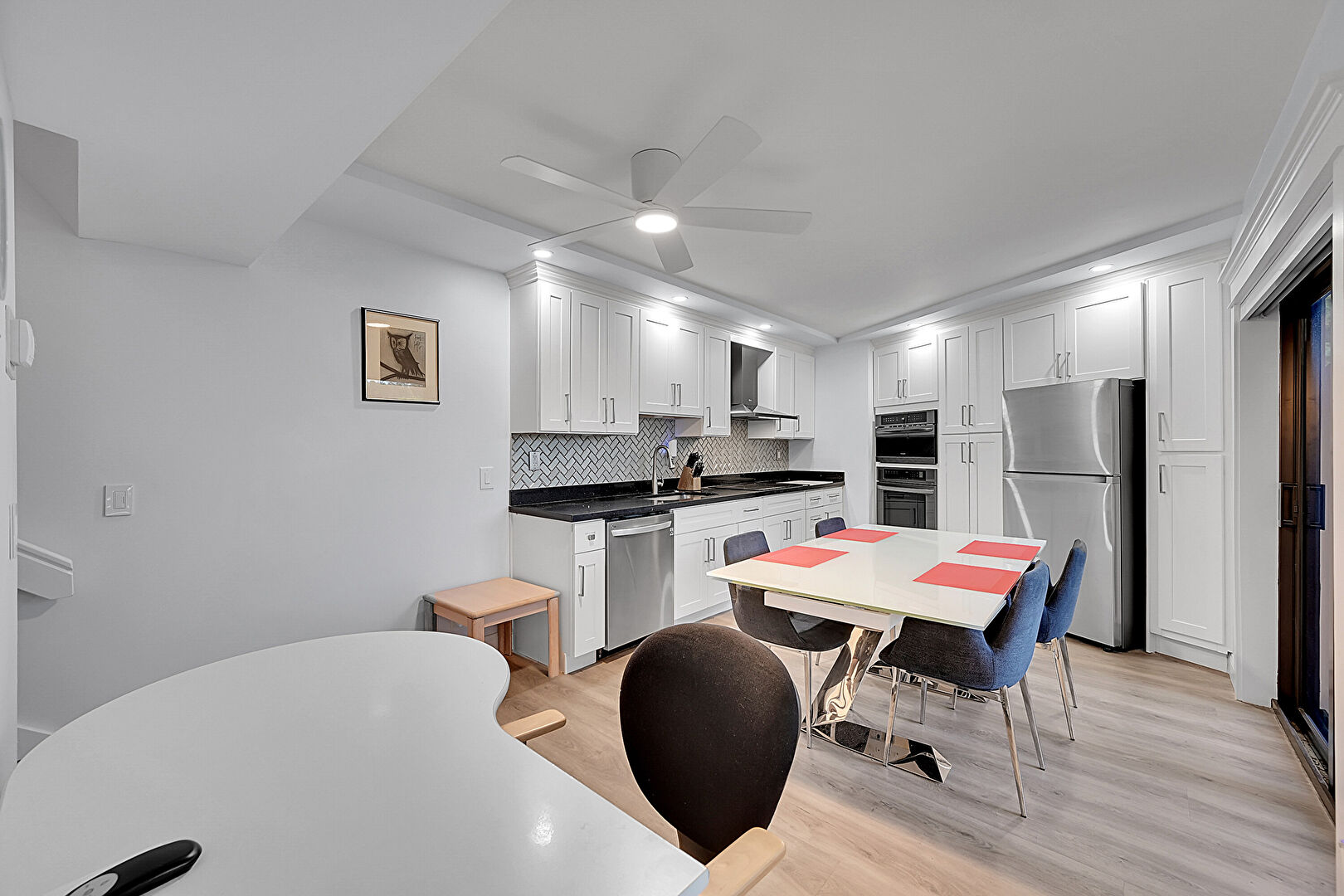 Baseboards Wall, Double Oven, Drywall, L Shaped Kitchen, Natural Light, Recessed Lighting, Wood Finish Floor, Ceiling Fan
