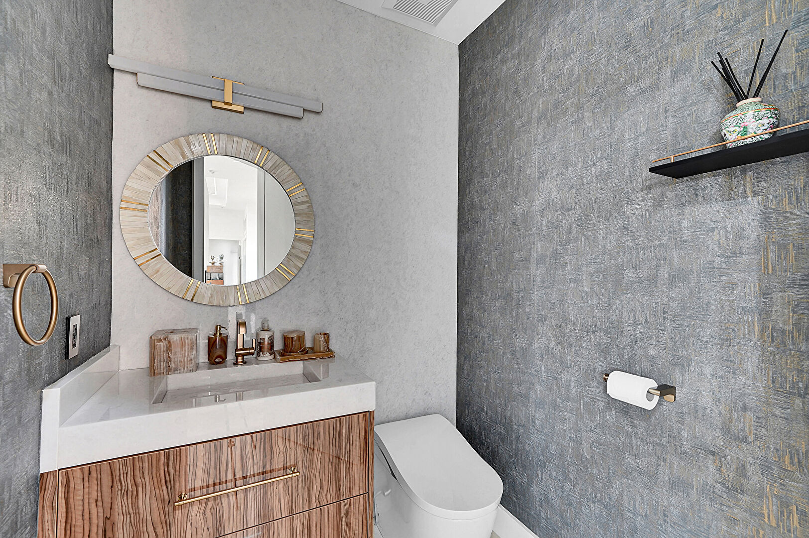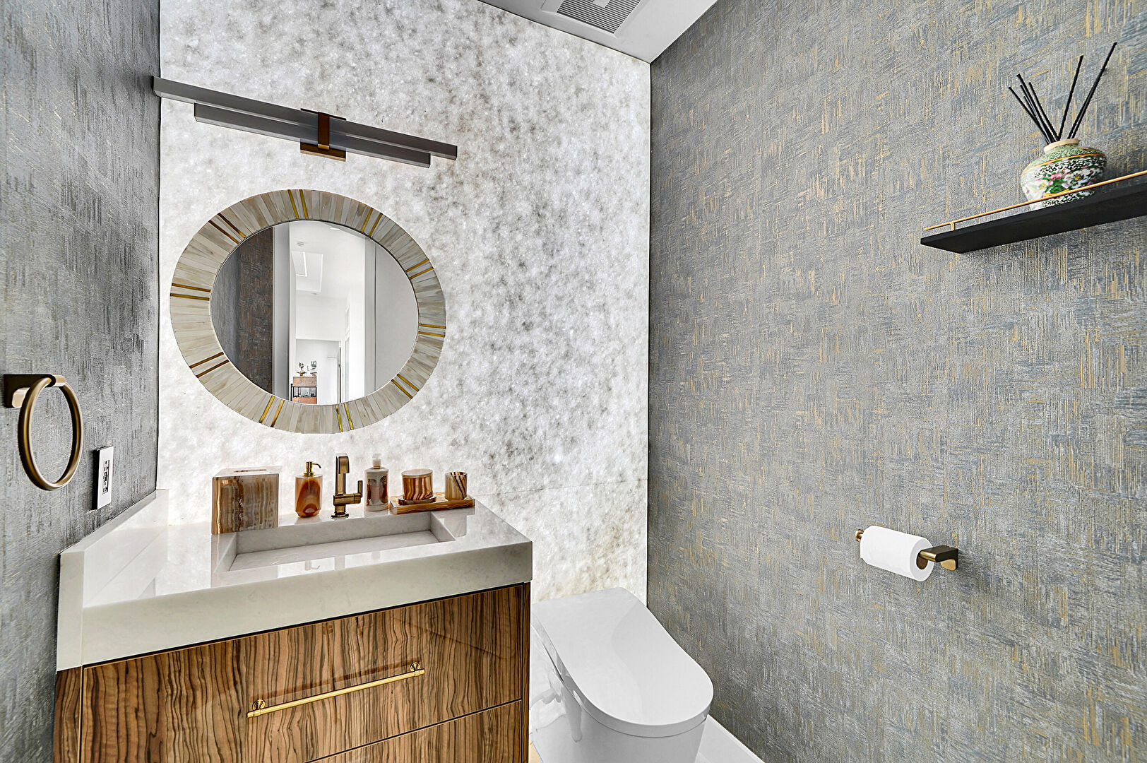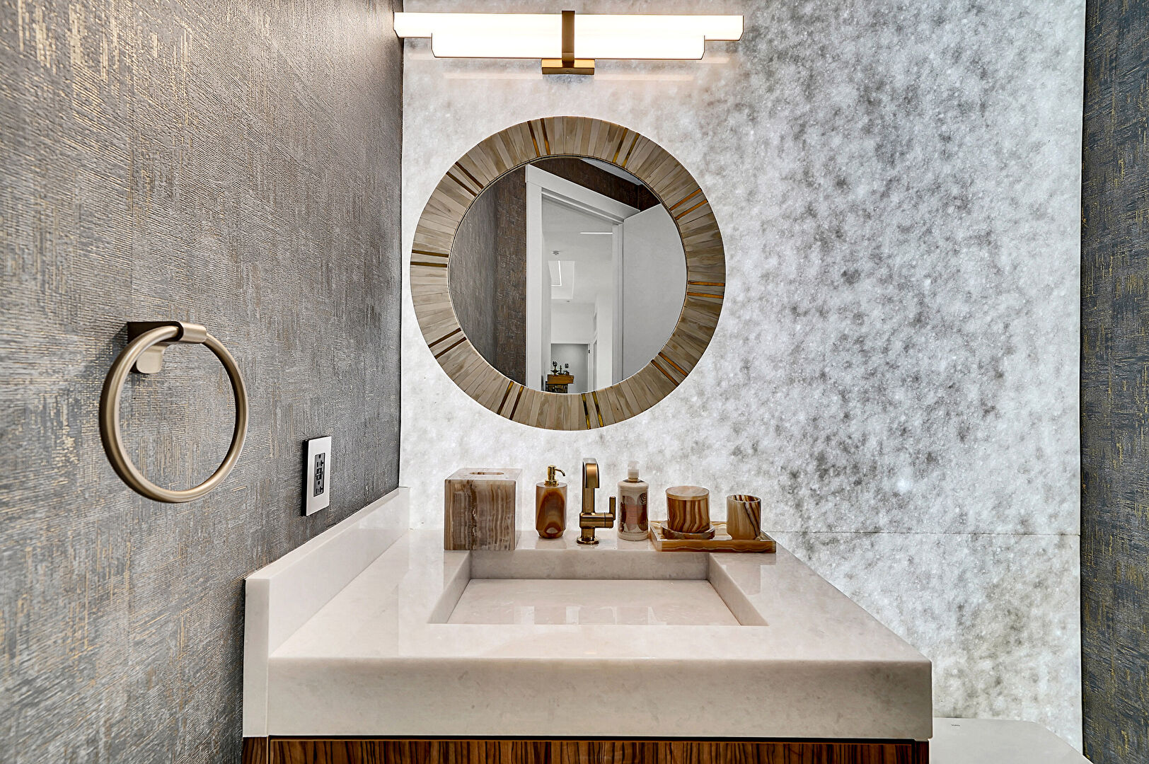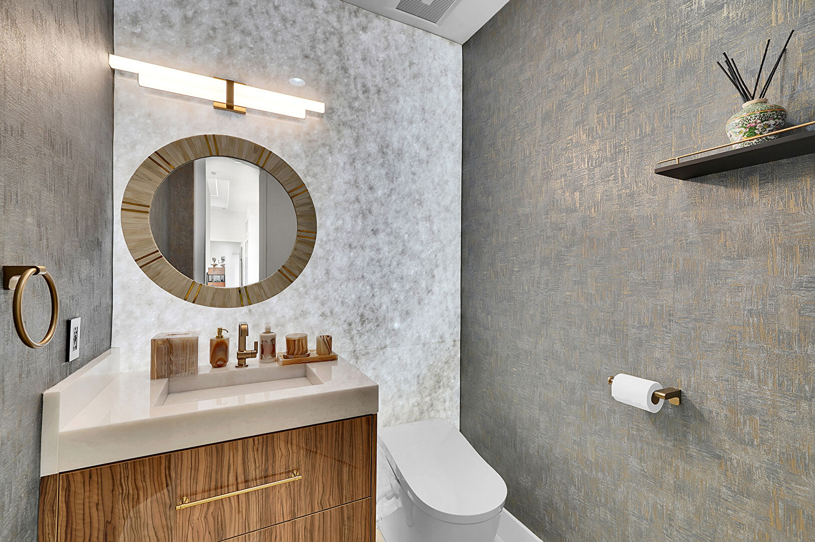 Baseboards Wall, Drywall, Full Bathroom, Half Bathroom, Marble Finish Floor, Marble Wall, Natural Light, Notable Chandelier, Recessed Lighting, Textured Wall, Tile Wall, Vanity, Vent, Wallpaper Wall, Baseboards Wall, Full Bathroom, Half Bathroom, High Ceiling, Natural Light, Tile Wall, Vanity, Vent
