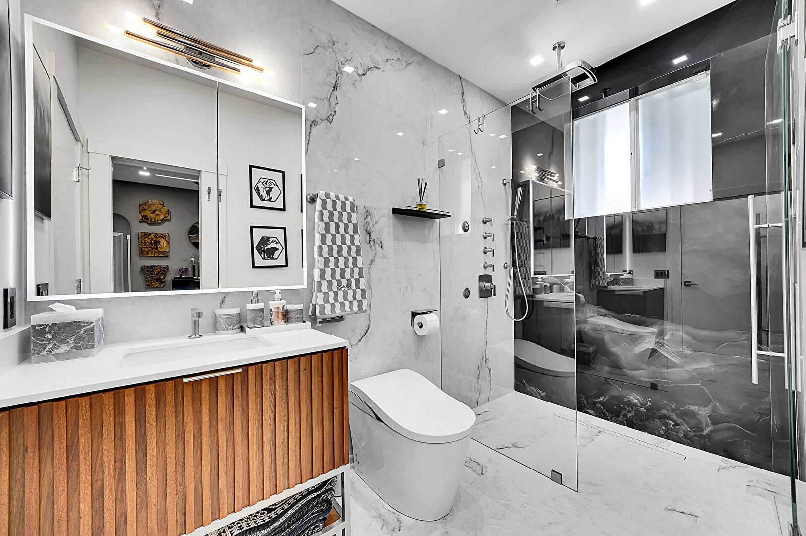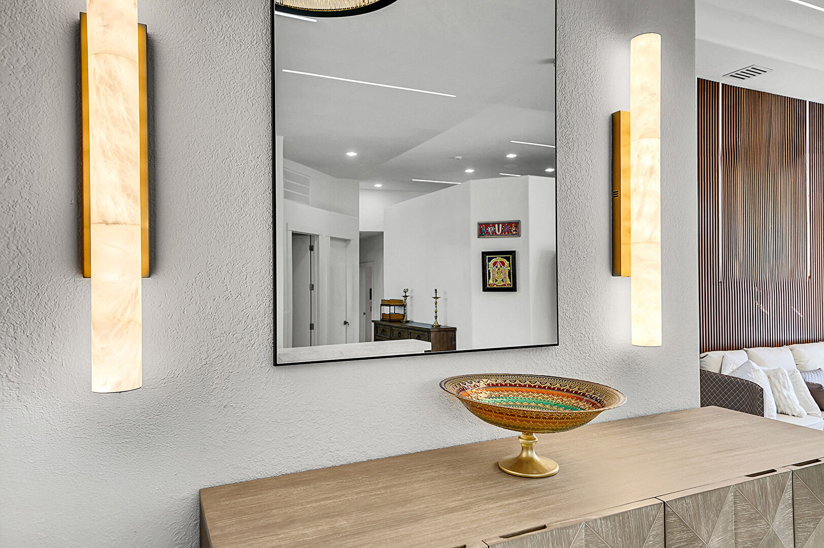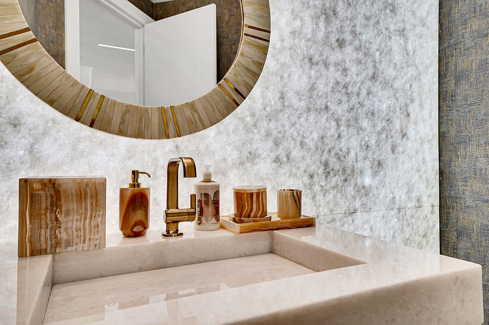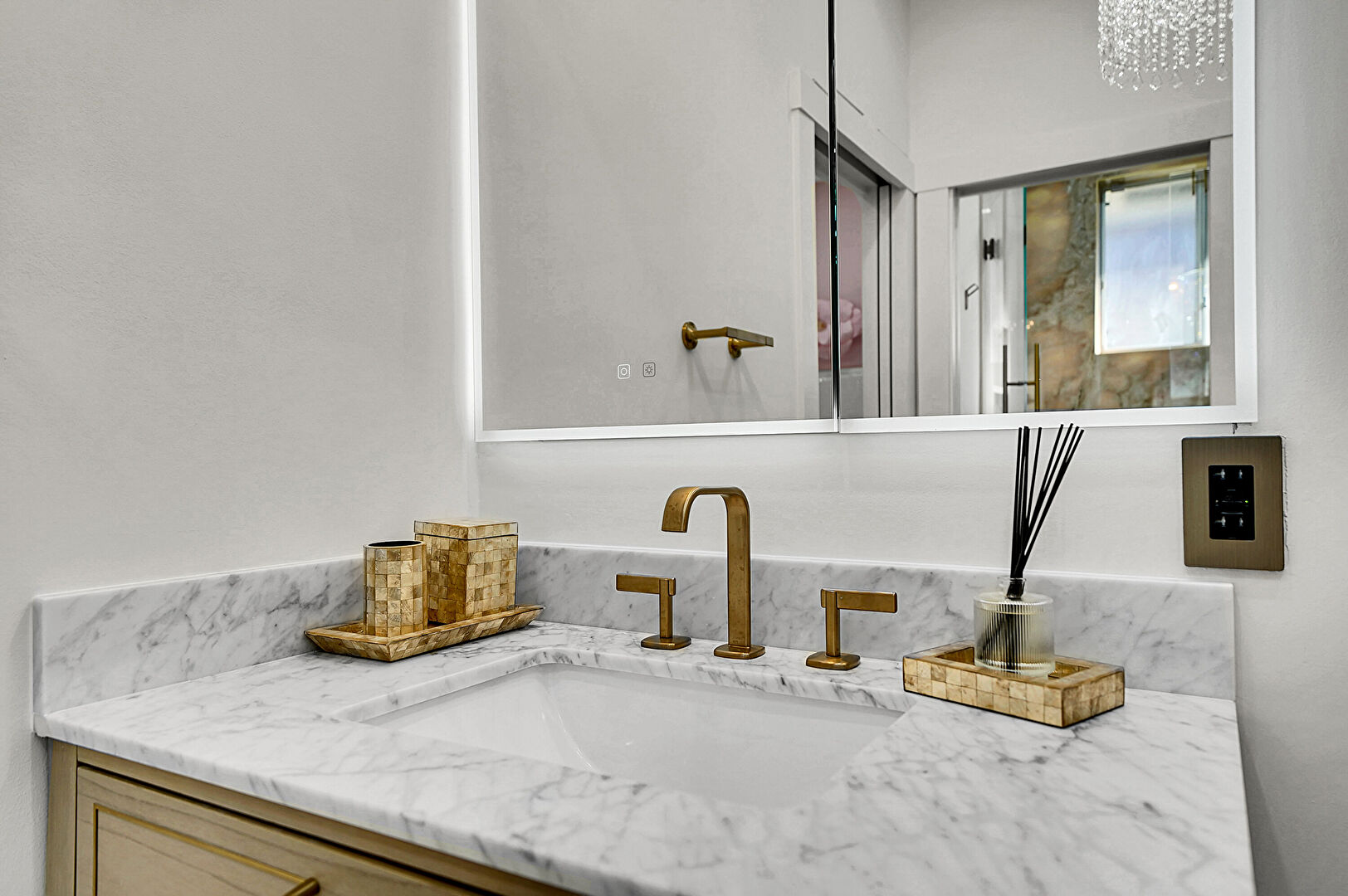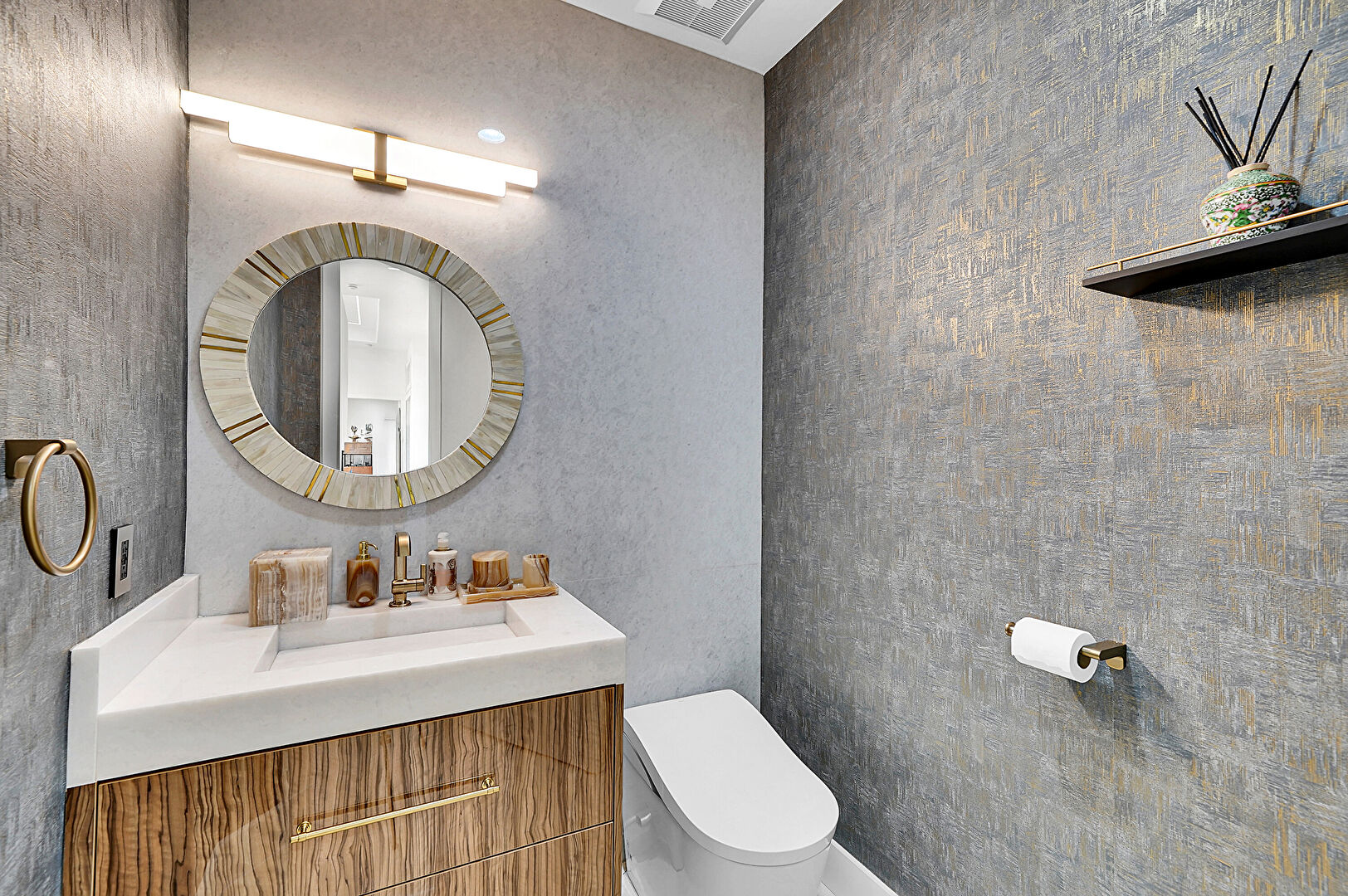 Baseboards Wall, Drywall, Full Bathroom, Half Bathroom, Marble Finish Floor, Marble Wall, Natural Light, Notable Chandelier, Recessed Lighting, Textured Wall, Tile Wall, Vanity, Vent, Wallpaper Wall, Baseboards Wall, Full Bathroom, Half Bathroom, High Ceiling, Natural Light, Tile Wall, Vanity, Vent
