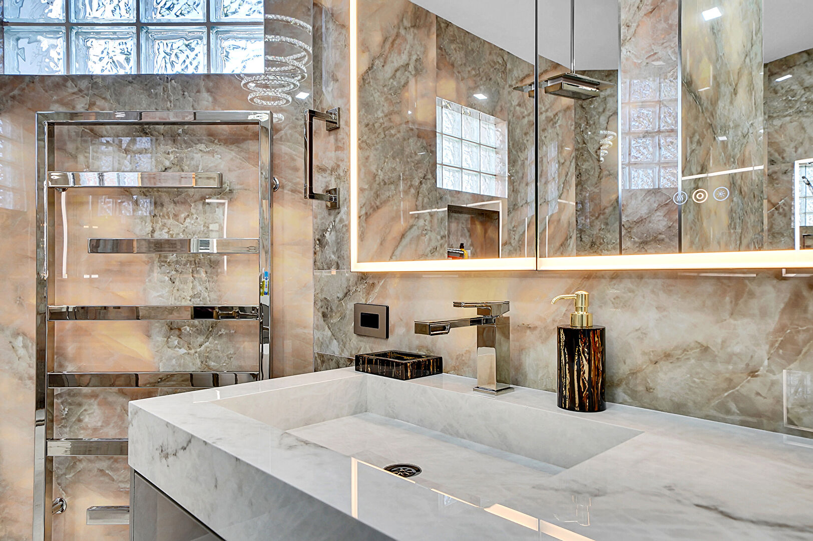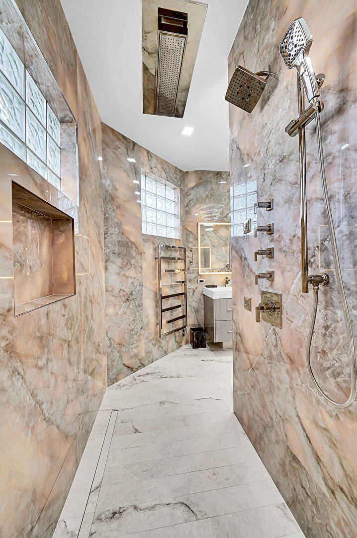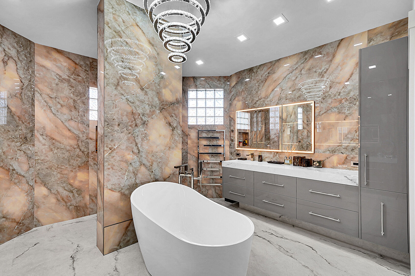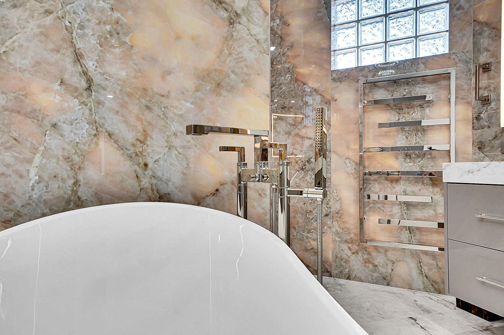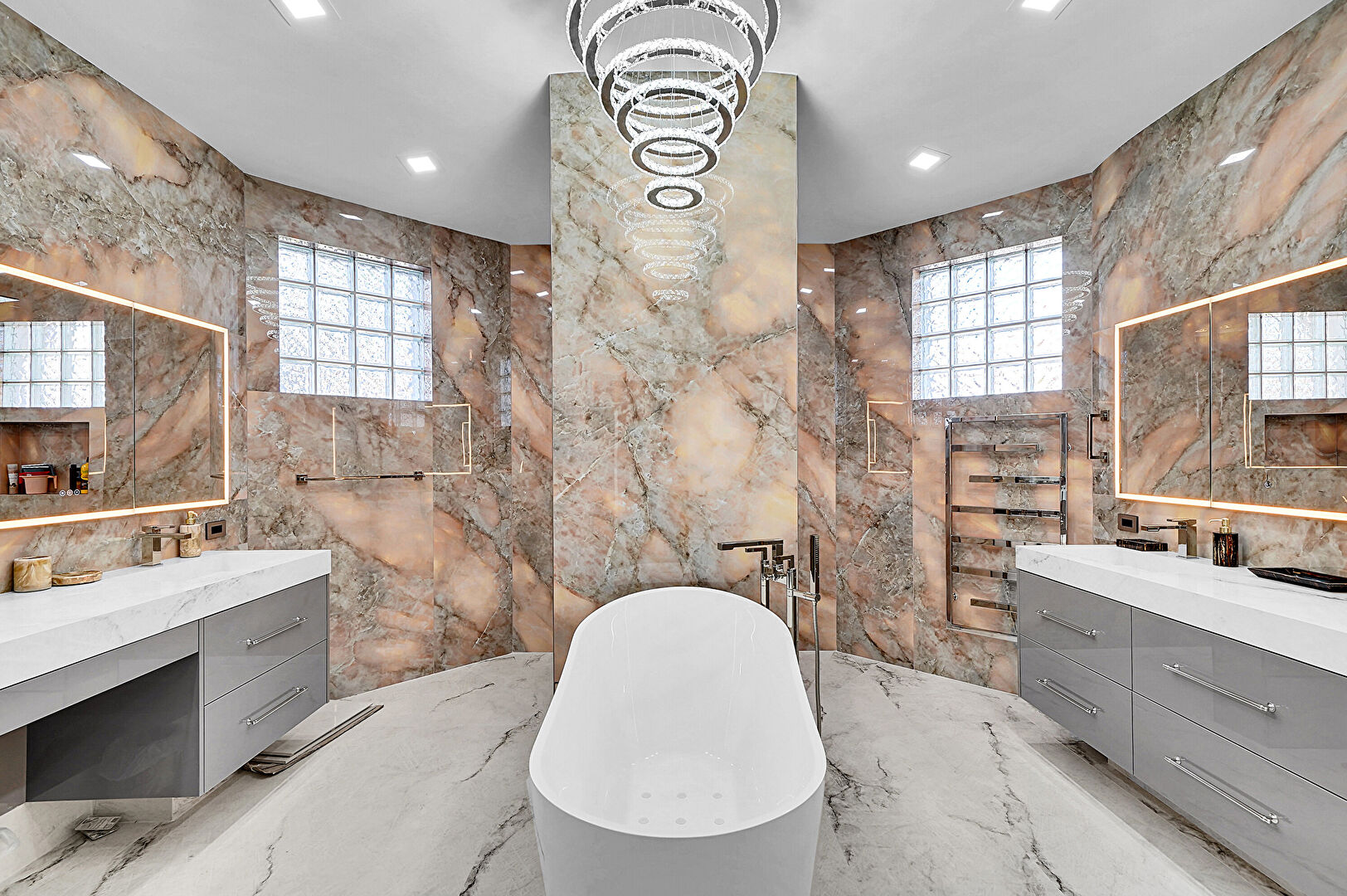 Double Vanity, Full Bathroom, Marble Finish Floor, Marble Wall, Natural Light, Notable Chandelier, Recessed Lighting, Tile Wall, Towel Warmer, Two Single Vanities, Vanity, Vent, Double Vanity, Marble Finish Floor, Natural Light, Notable Chandelier, Tile Wall, Towel Warmer, Vanity