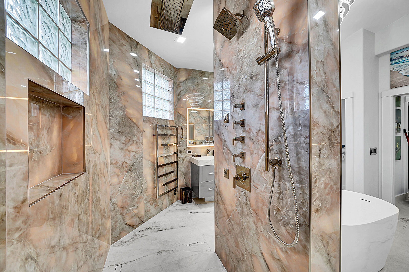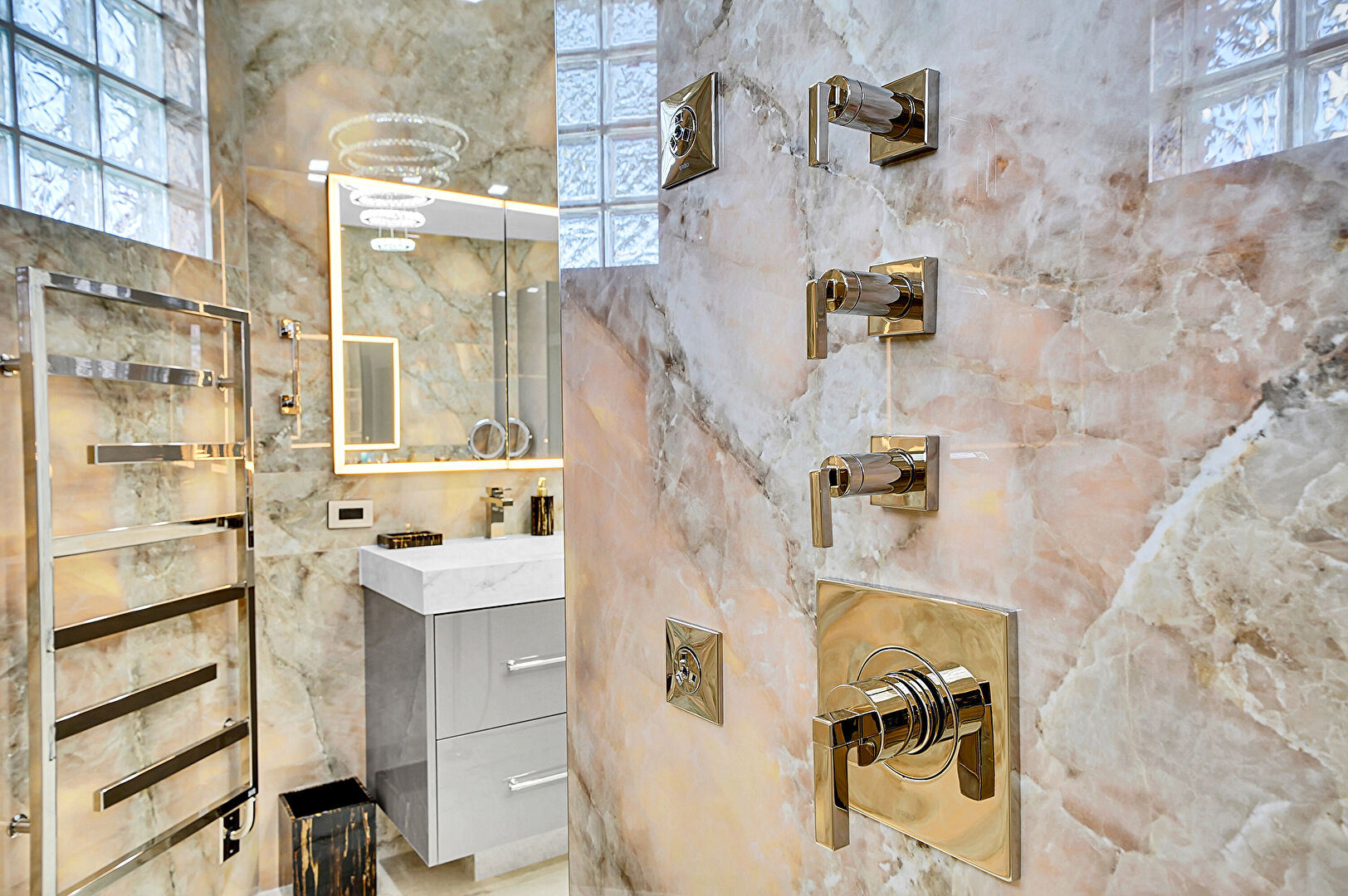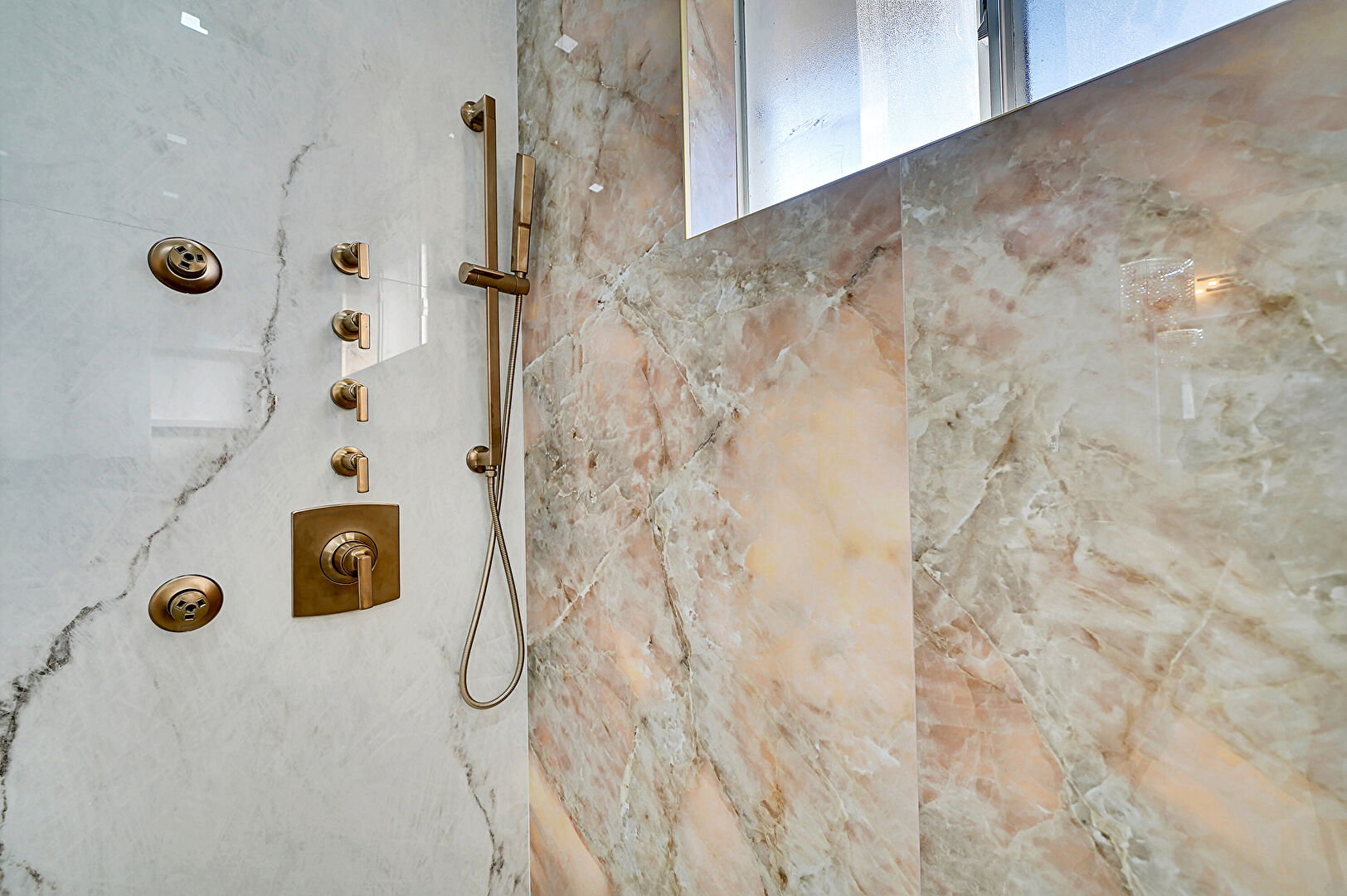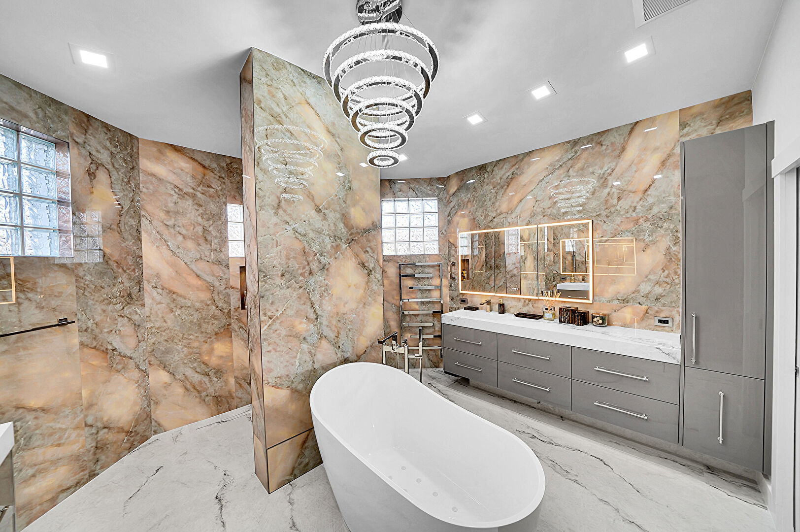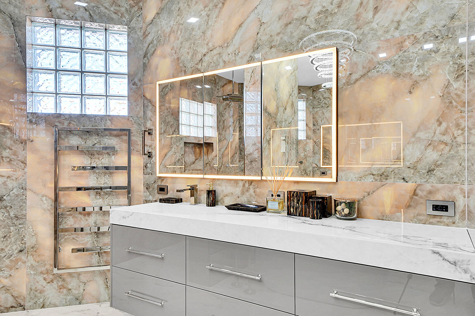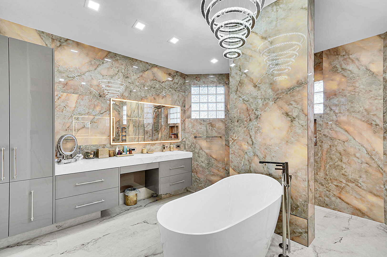Double Vanity, Full Bathroom, Marble Finish Floor, Marble Wall, Natural Light, Notable Chandelier, Recessed Lighting, Tile Wall, Towel Warmer, Two Single Vanities, Vanity, Vent, Double Vanity, Marble Finish Floor, Natural Light, Notable Chandelier, Tile Wall, Towel Warmer, Vanity