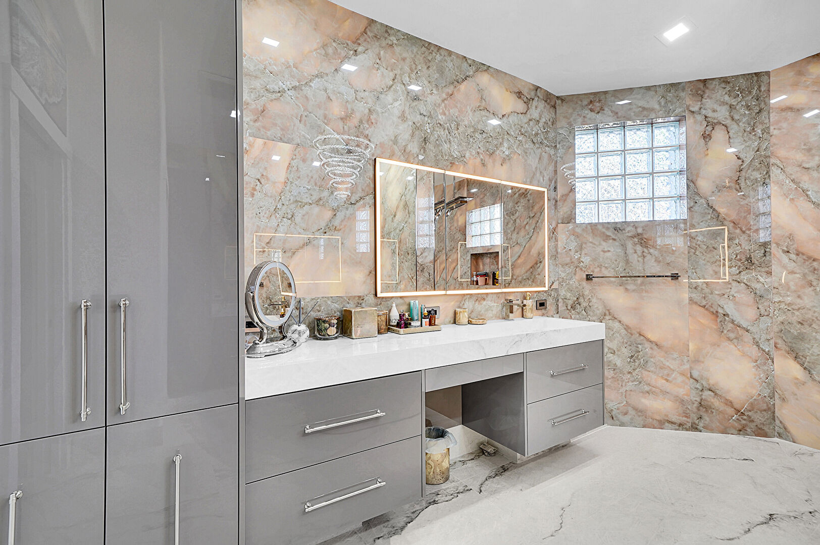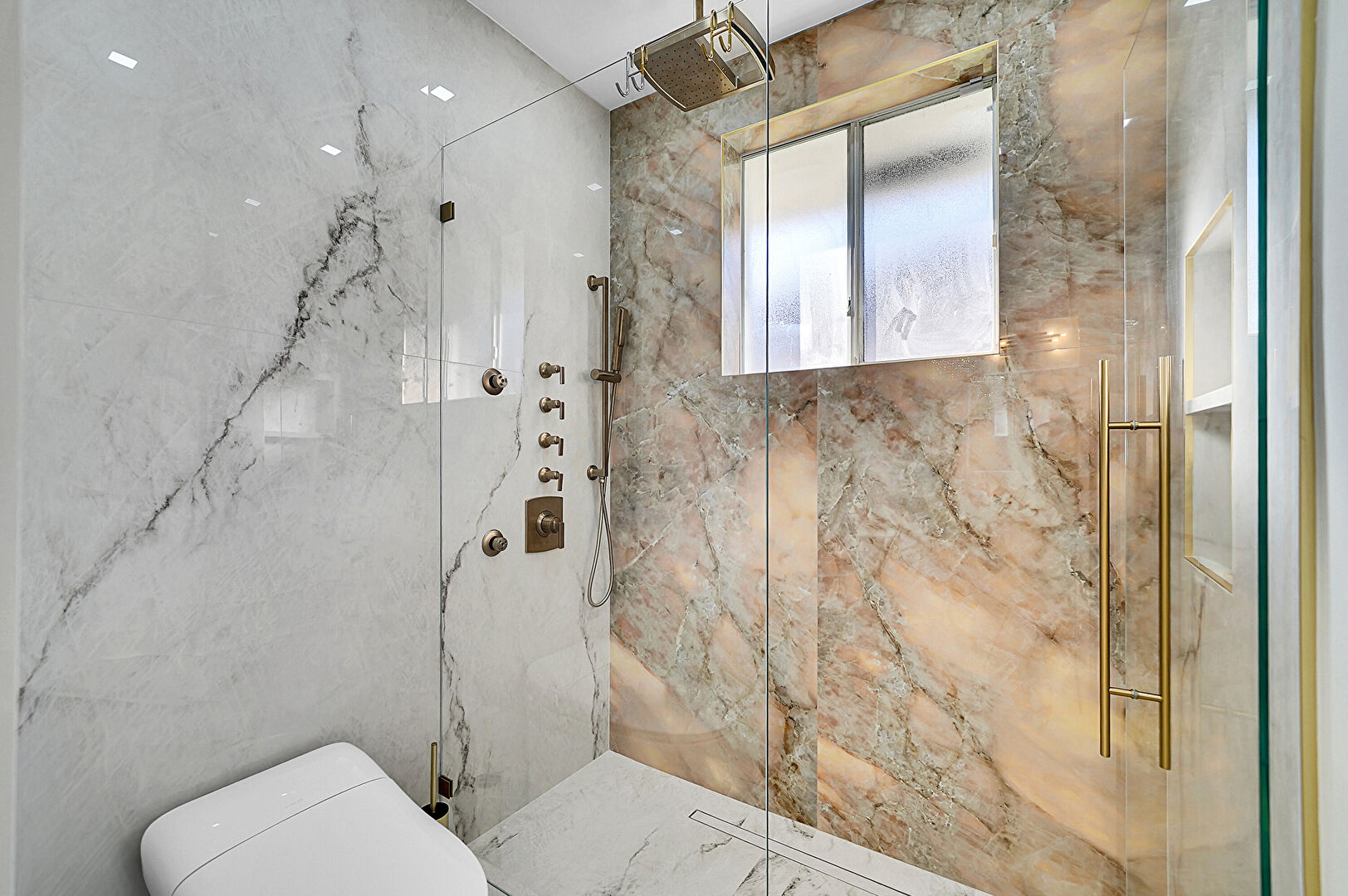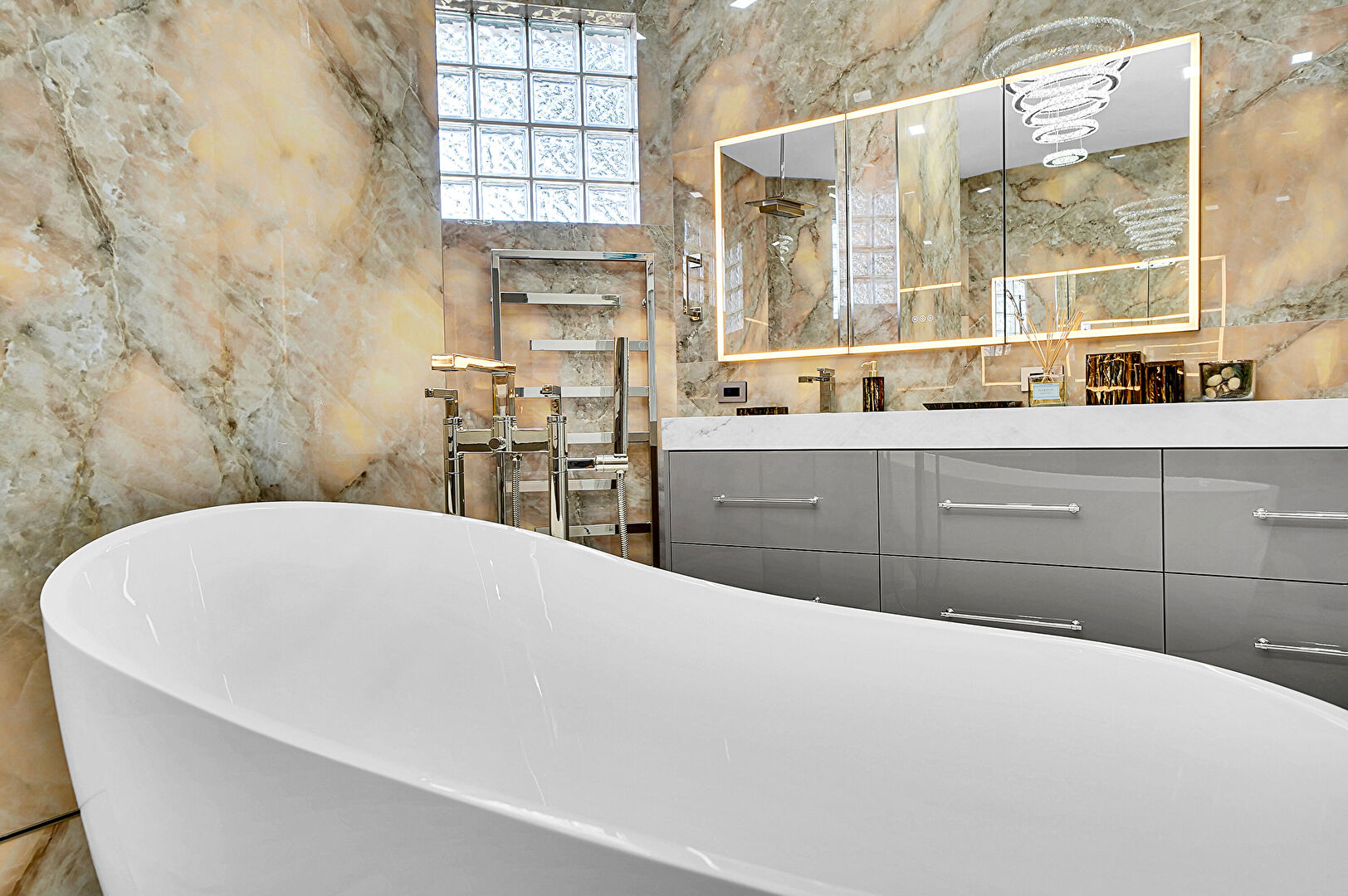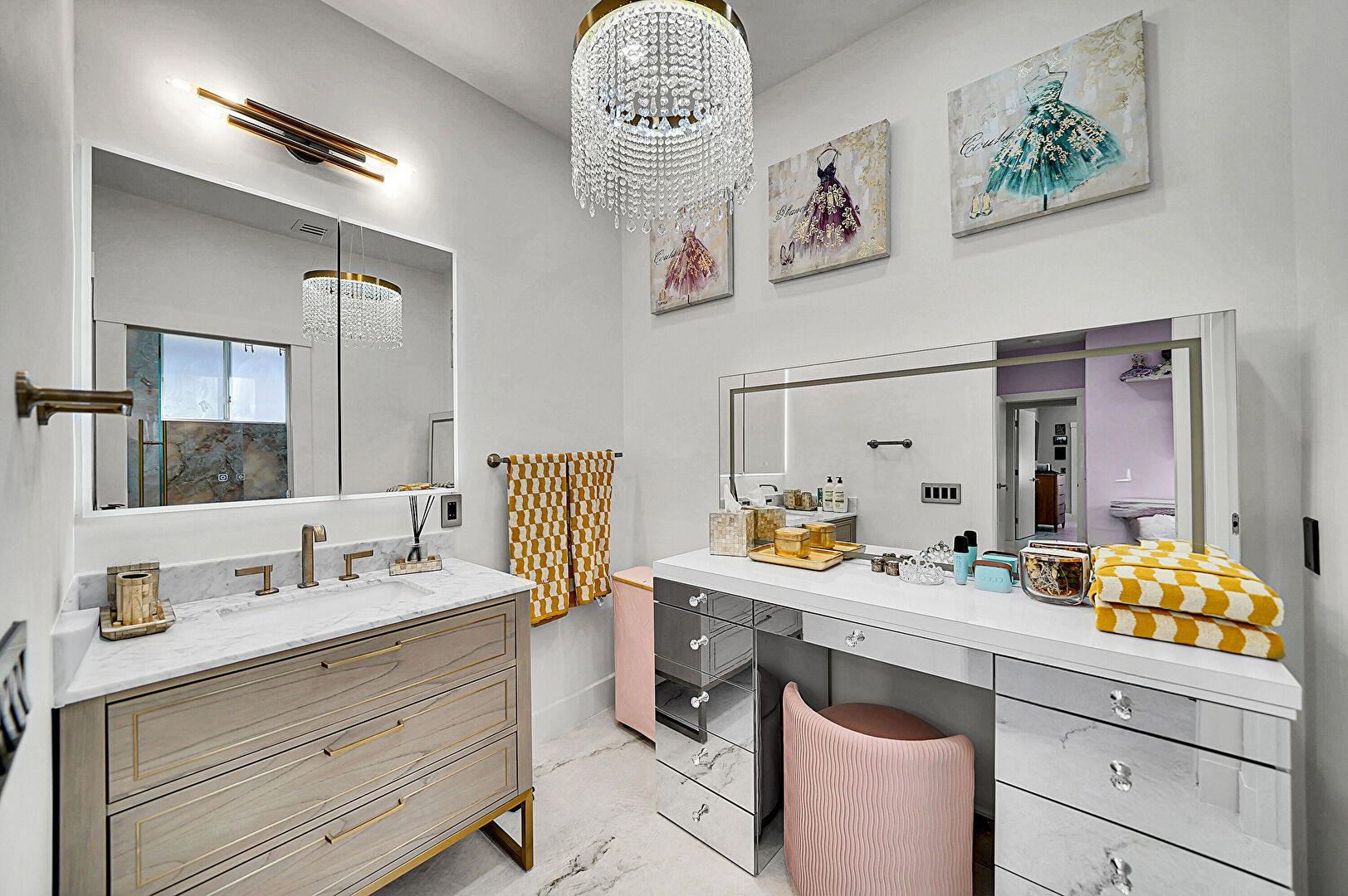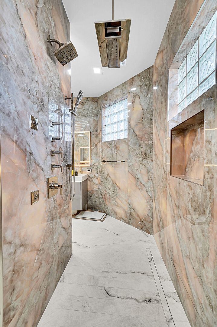 Double Vanity, Full Bathroom, Marble Finish Floor, Marble Wall, Natural Light, Notable Chandelier, Recessed Lighting, Tile Wall, Towel Warmer, Two Single Vanities, Vanity, Vent, Double Vanity, Marble Finish Floor, Natural Light, Notable Chandelier, Tile Wall, Towel Warmer, Vanity