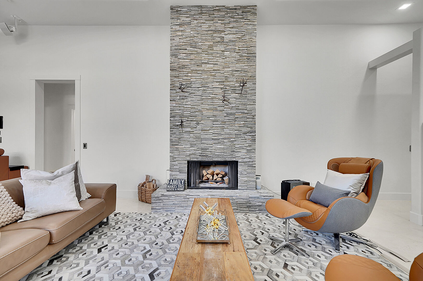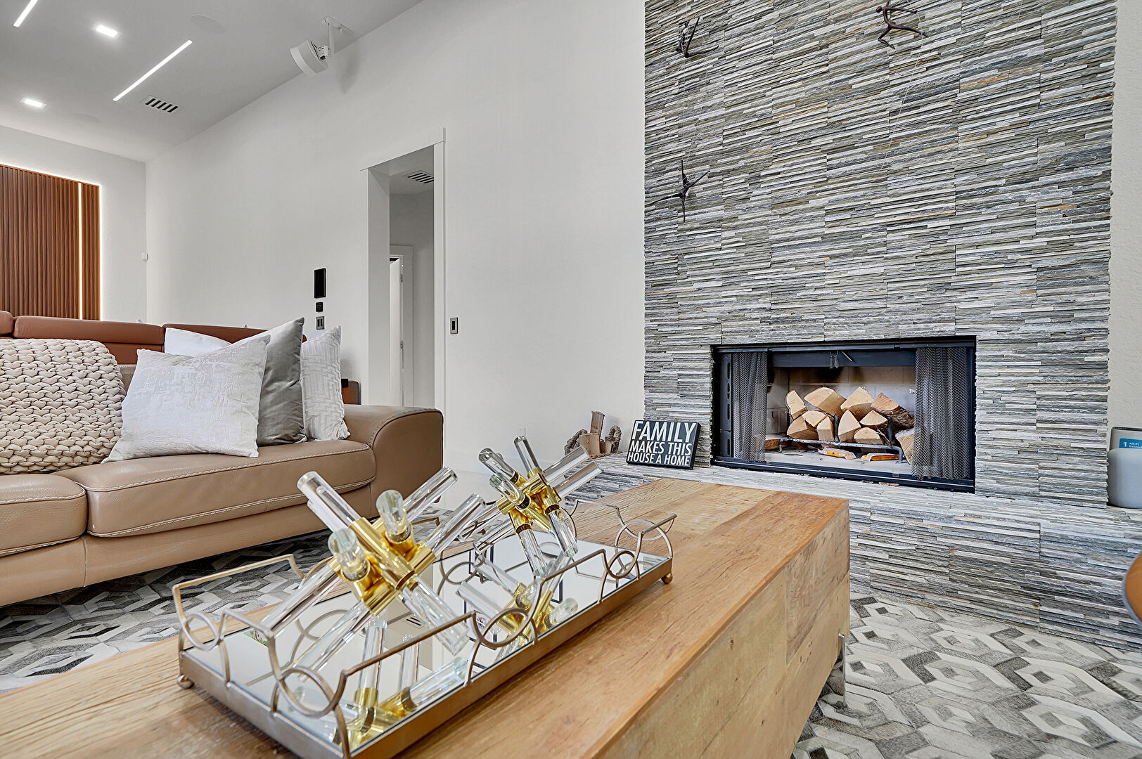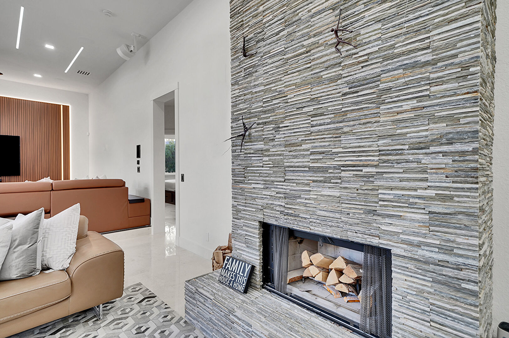 Baseboards Wall, Ceiling Fan, Double Oven, Drywall, Fireplace, French Doors, High Ceiling, Natural Light, Recessed Lighting, Stone Wall, Tile Floor, Vent, Baseboards Wall, Ceiling Fan, Drywall, Fireplace, French Doors, Recessed Lighting, Smoke Carbon Monoxide Detector