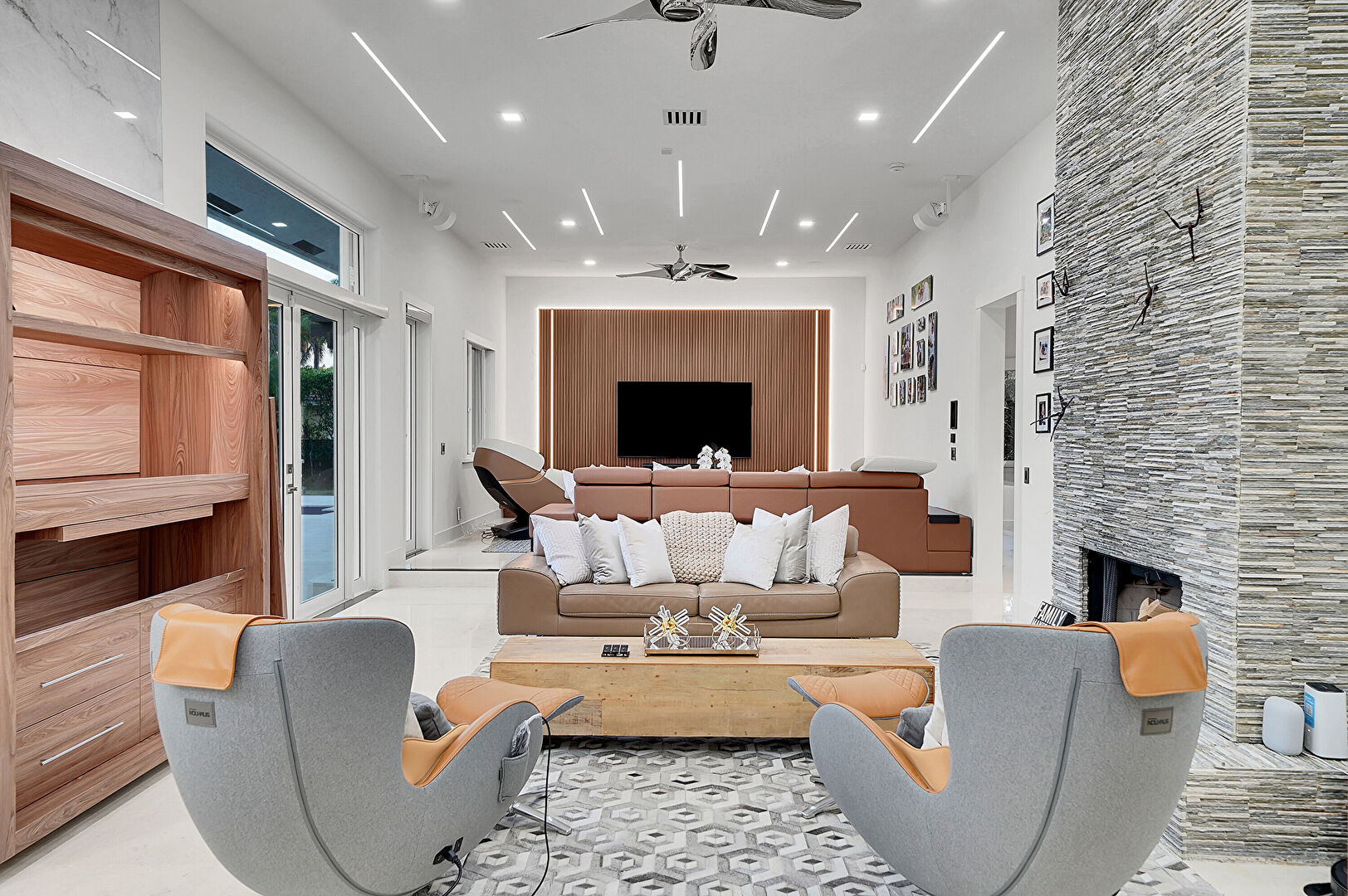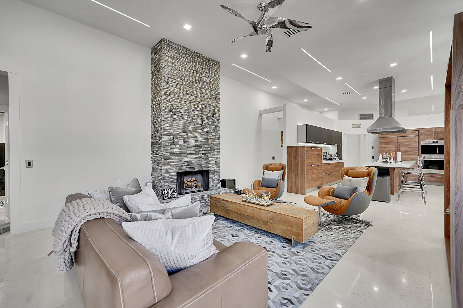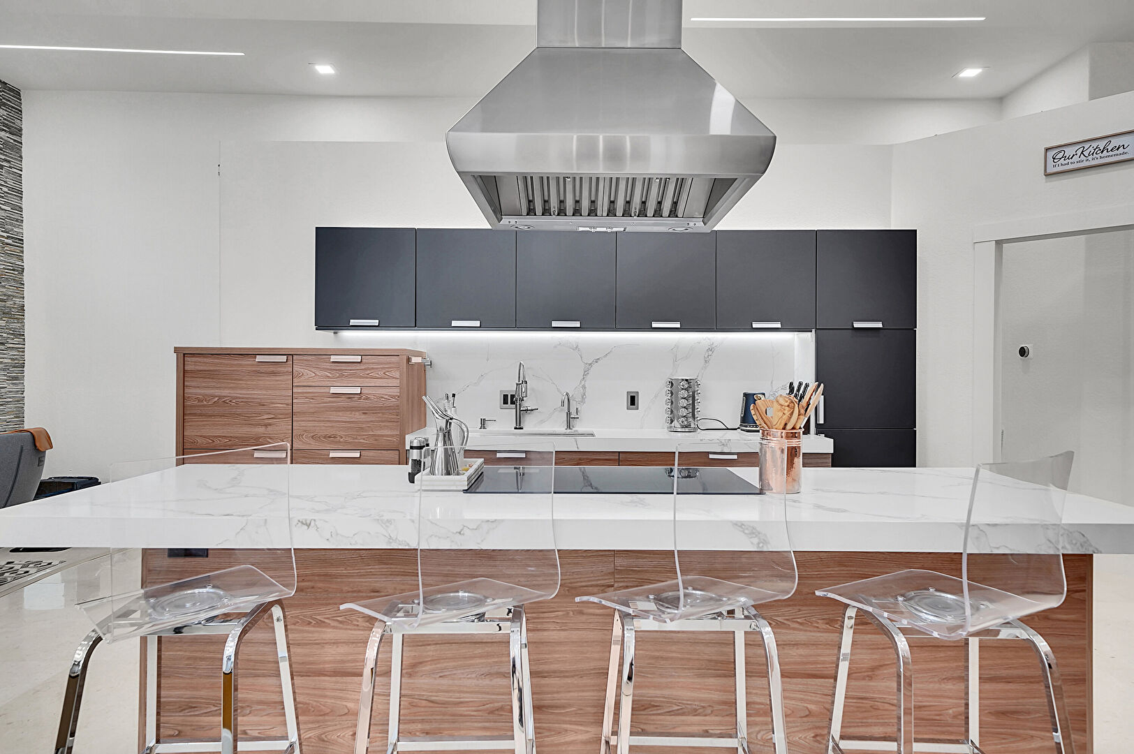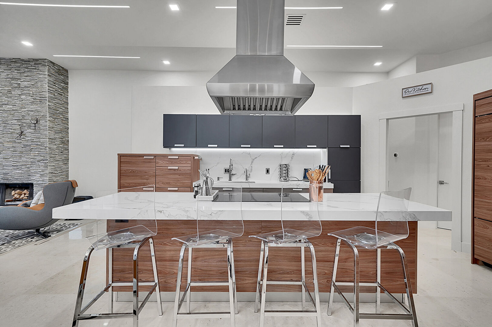 Black Cabinets, Ceiling Fan, Concrete Floor, Double Oven, Drywall, Flat Panel Cabinets, Gray Cabinets, Kitchen Bar, Kitchen Island, Medium Brown Cabinets, Notable Chandelier, Office Area, One Wall Kitchen, Opens To Living Area, Pendant Lighting, Recessed Lighting, Stone Countertops, Stone Wall, Vent, Drywall, Fireplace, Kitchen Bar, Medium Brown Cabinets, Natural Light, Notable Chandelier, Recessed Lighting
