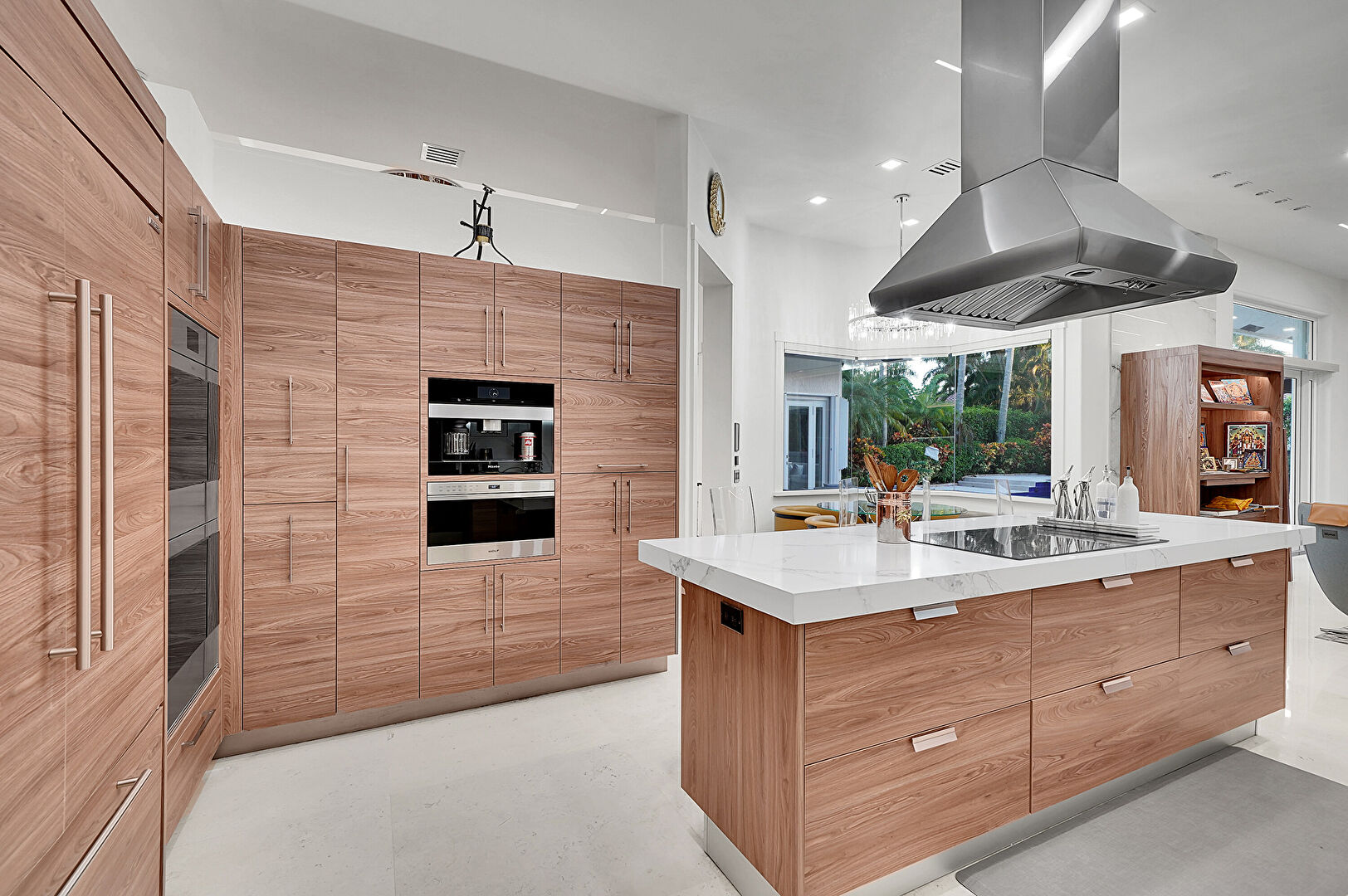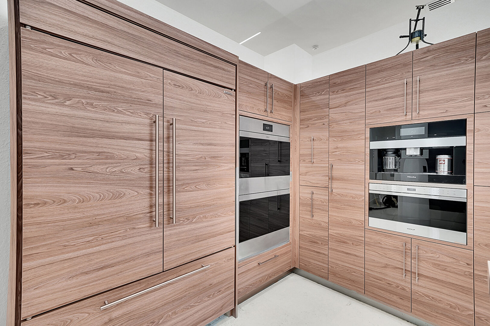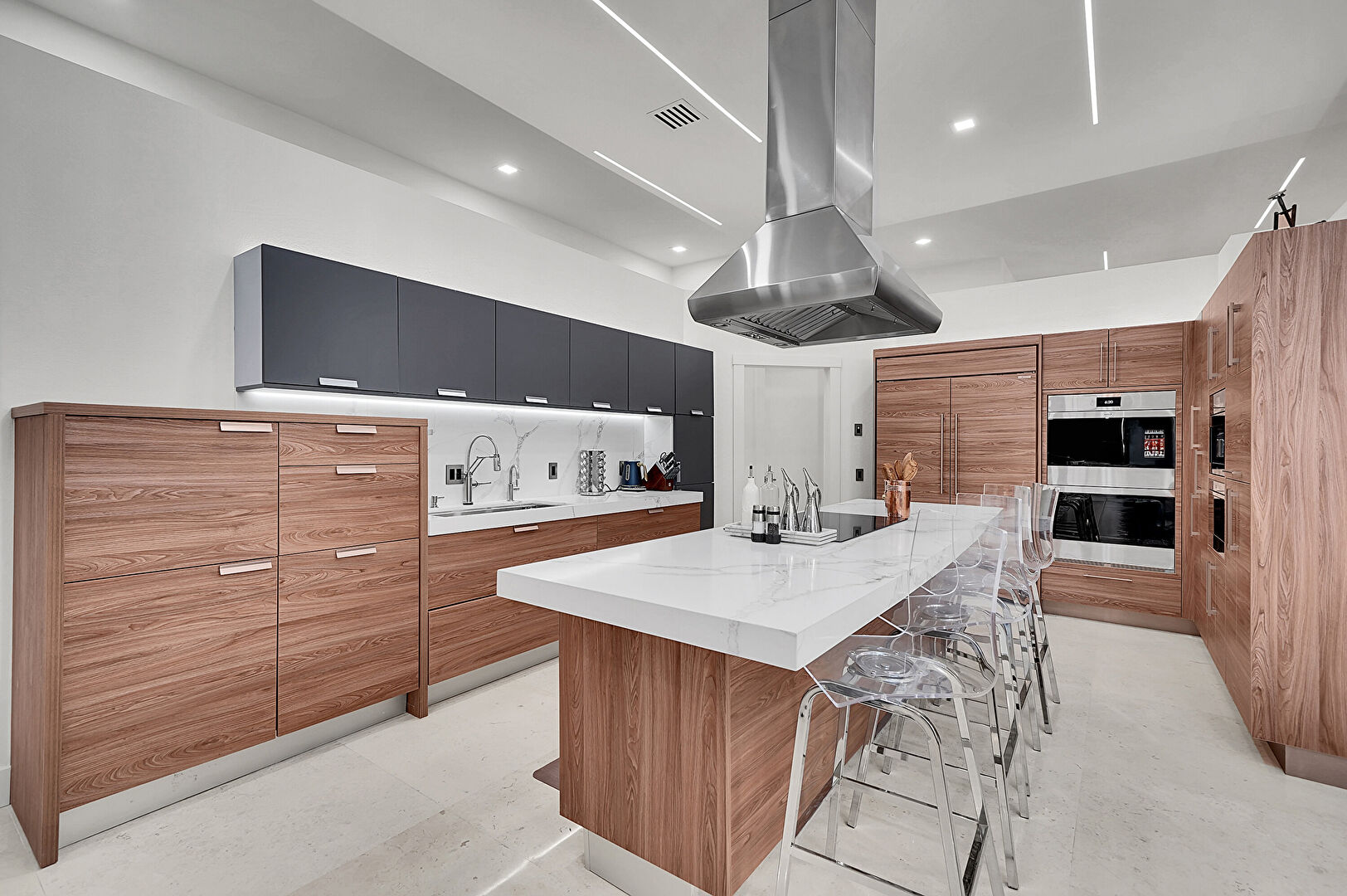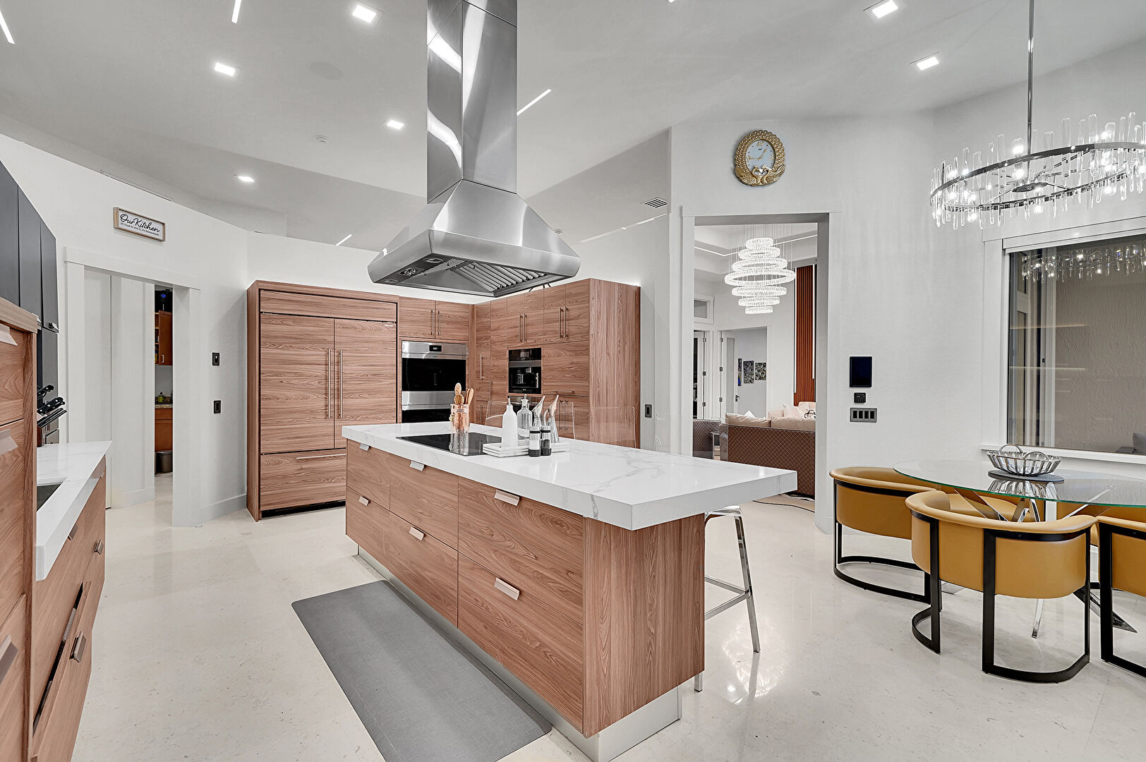 Black Cabinets, Ceiling Fan, Concrete Floor, Double Oven, Drywall, Flat Panel Cabinets, Gray Cabinets, Kitchen Bar, Kitchen Island, Medium Brown Cabinets, Notable Chandelier, Office Area, One Wall Kitchen, Opens To Living Area, Pendant Lighting, Recessed Lighting, Stone Countertops, Stone Wall, Vent, Drywall, Fireplace, Kitchen Bar, Medium Brown Cabinets, Natural Light, Notable Chandelier, Recessed Lighting