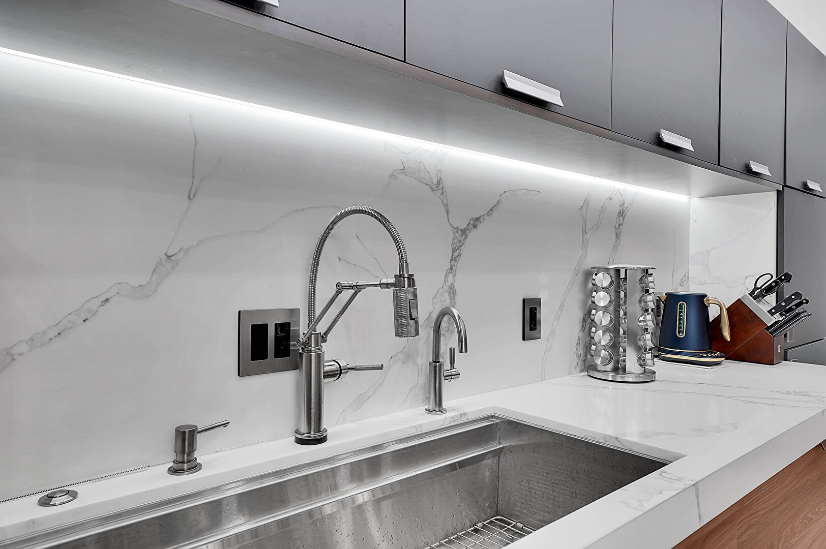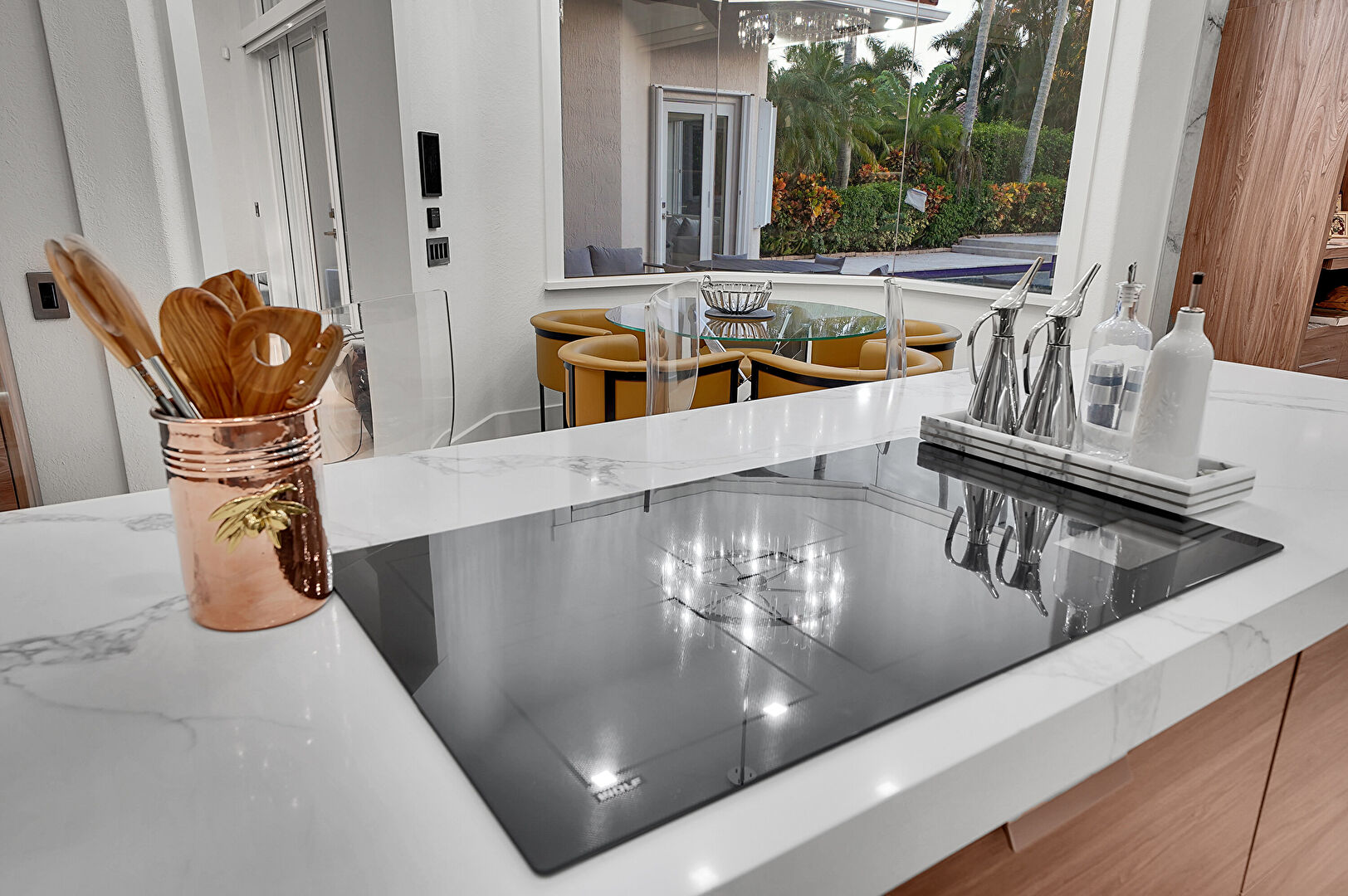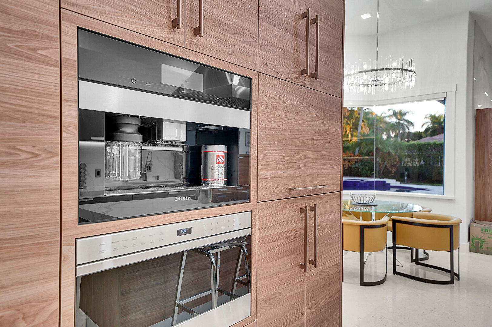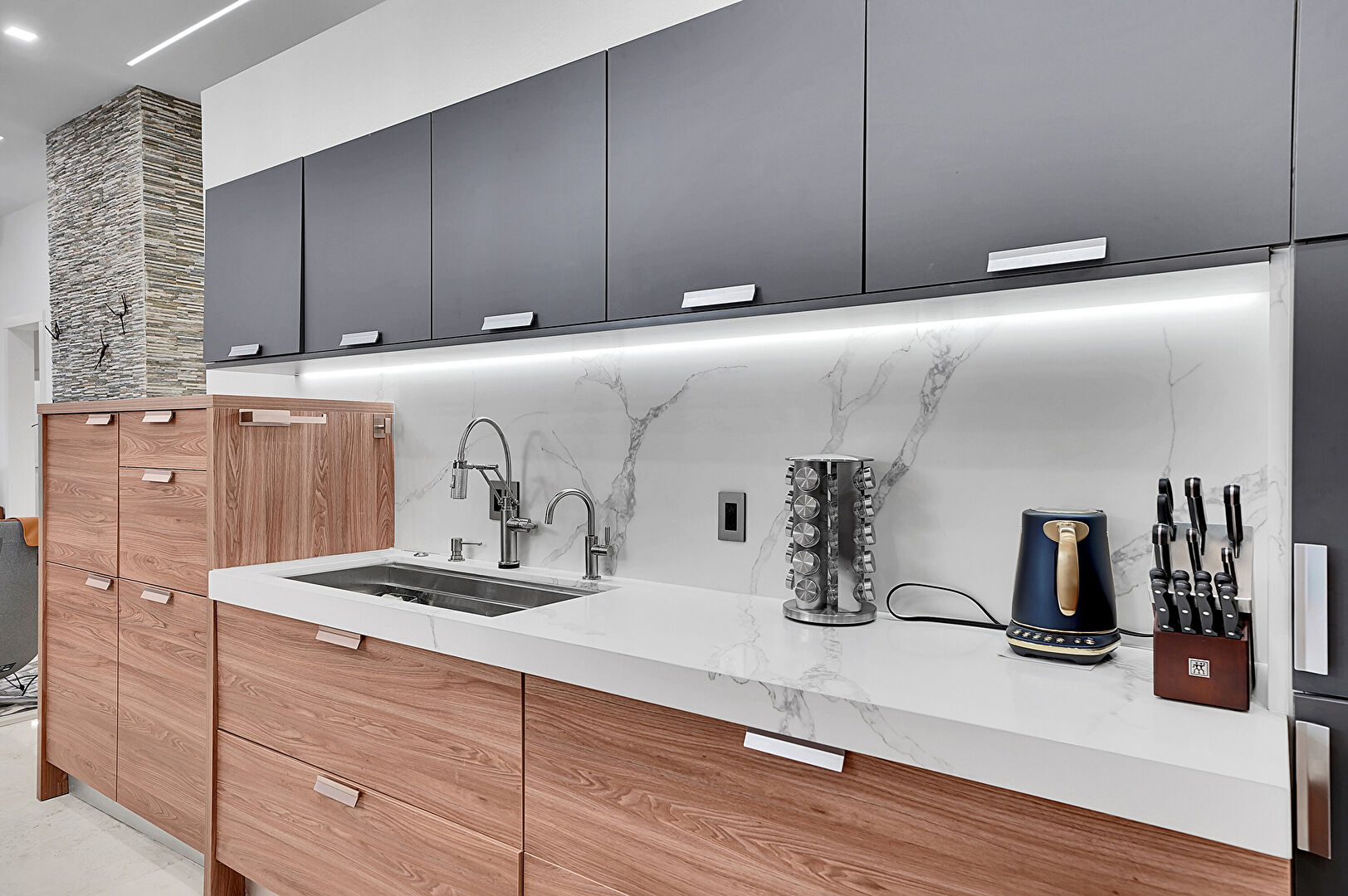 Black Cabinets, Ceiling Fan, Concrete Floor, Double Oven, Drywall, Flat Panel Cabinets, Gray Cabinets, Kitchen Bar, Kitchen Island, Medium Brown Cabinets, Notable Chandelier, Office Area, One Wall Kitchen, Opens To Living Area, Pendant Lighting, Recessed Lighting, Stone Countertops, Stone Wall, Vent, Drywall, Fireplace, Kitchen Bar, Medium Brown Cabinets, Natural Light, Notable Chandelier, Recessed Lighting