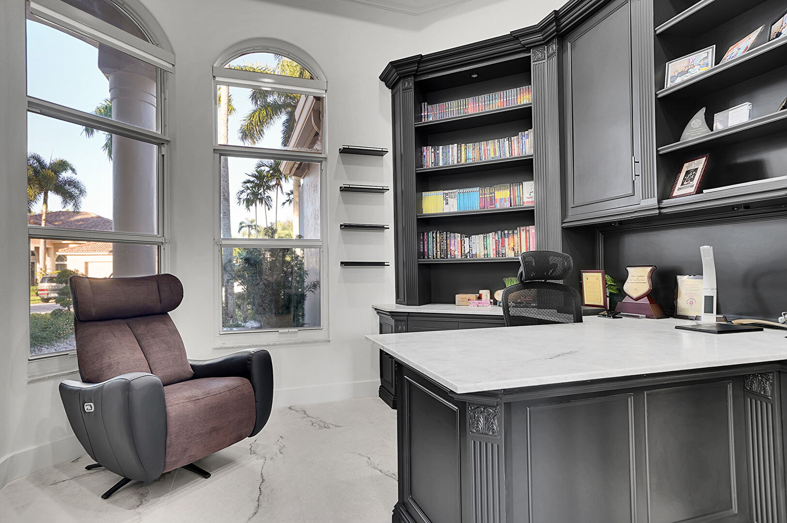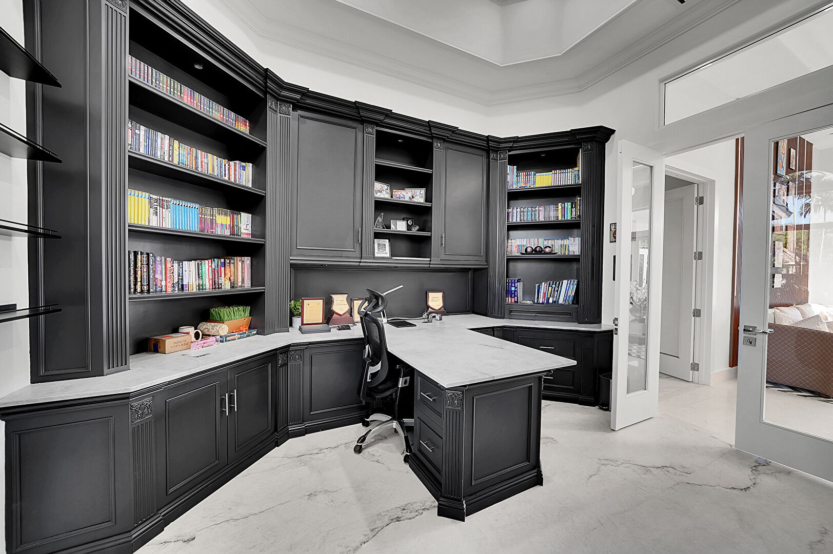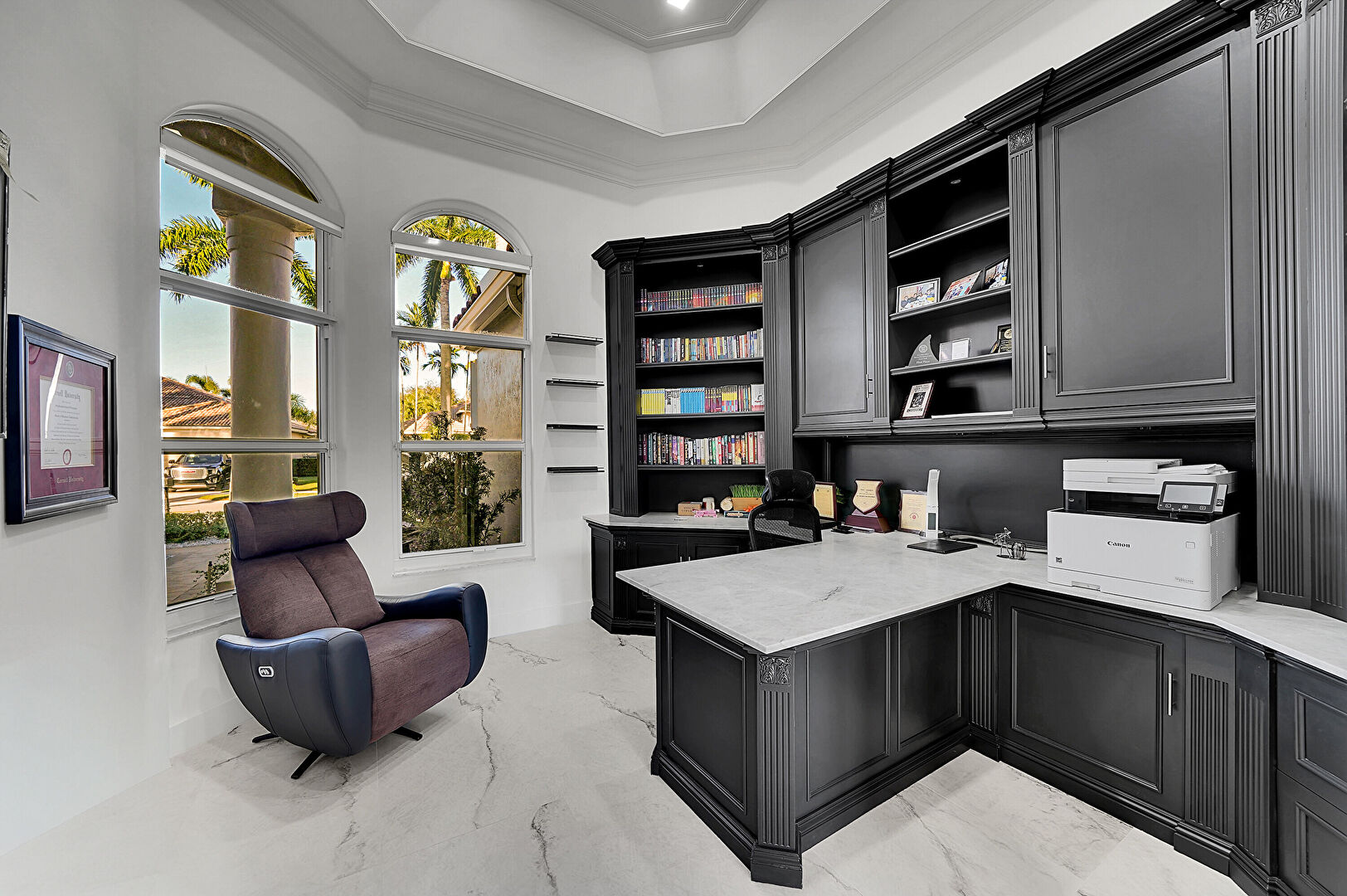 Baseboards Wall, Built In Desk, Concrete Floor, Crown Molding, Drywall, Marble Finish Floor, Natural Light, Office Area, Concrete Floor, Crown Molding, Natural Light, Tray Ceiling