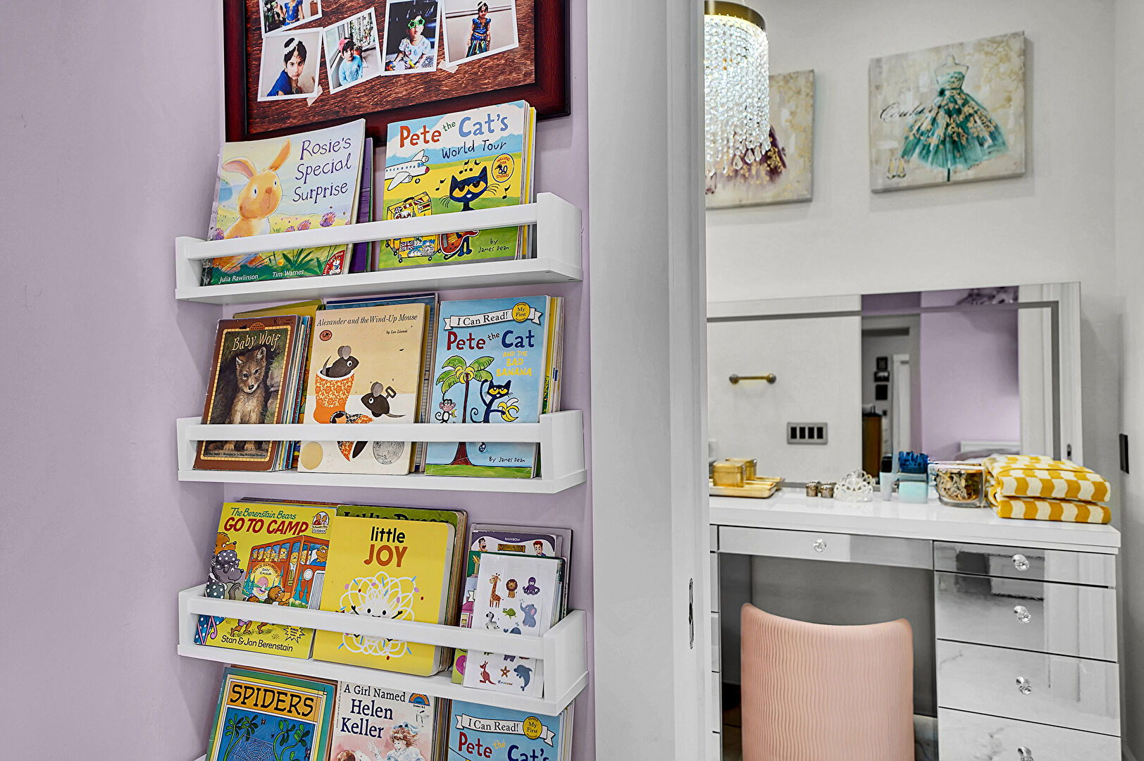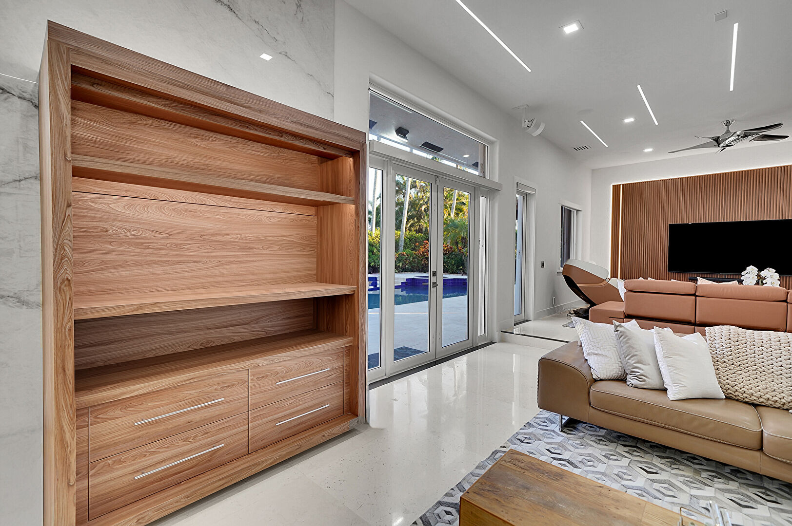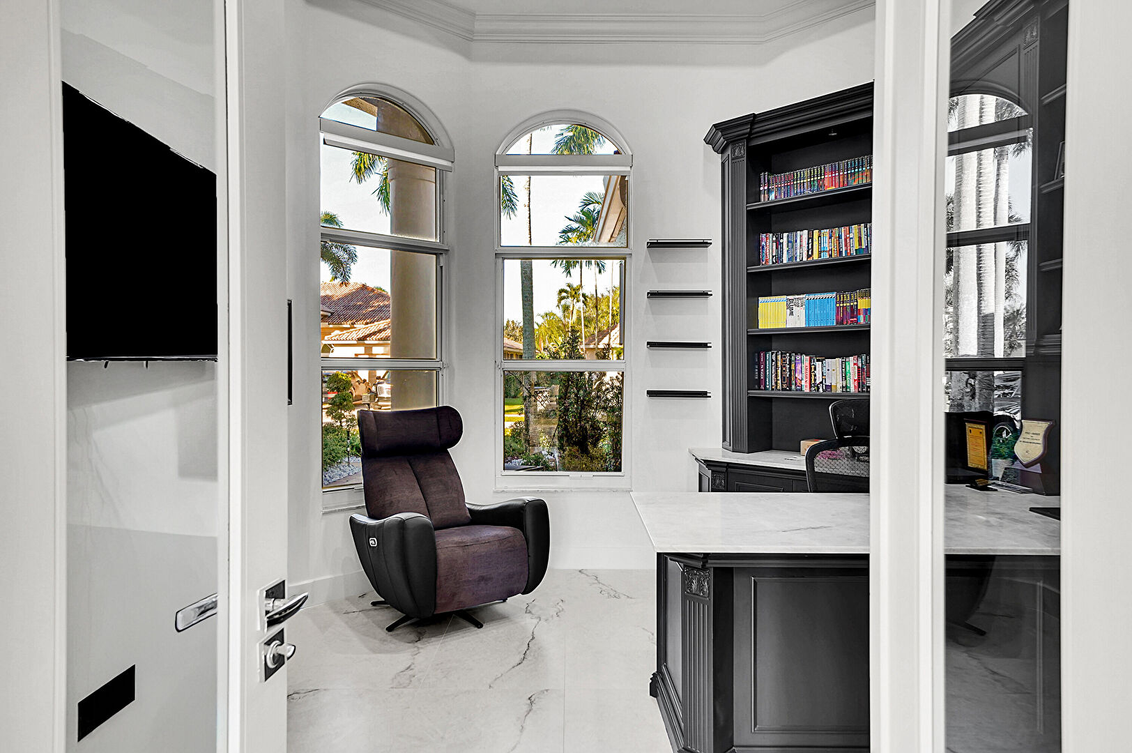 Baseboards Wall, Built In Desk, Concrete Floor, Crown Molding, Drywall, Marble Finish Floor, Natural Light, Office Area, Concrete Floor, Crown Molding, Natural Light, Tray Ceiling