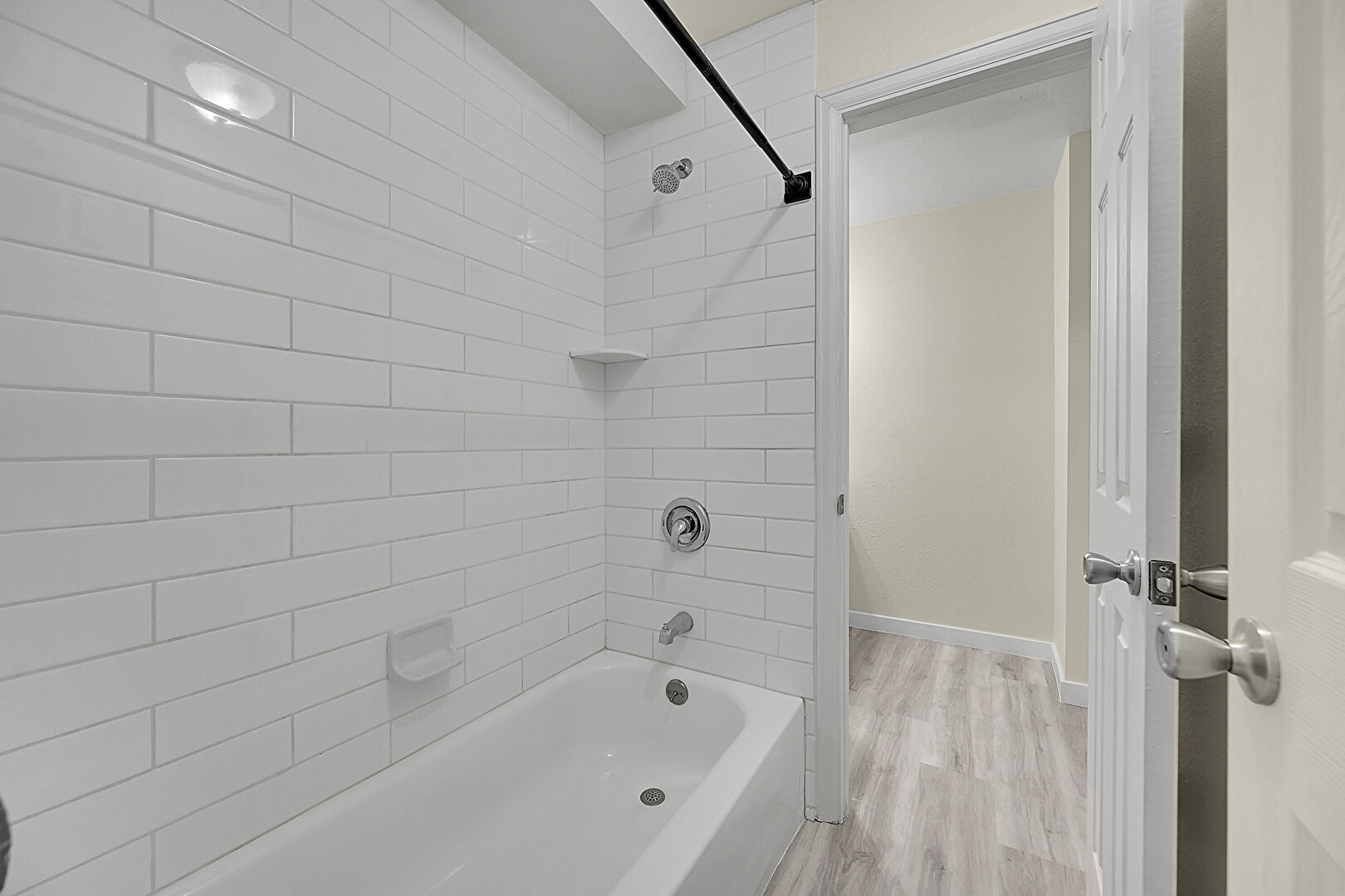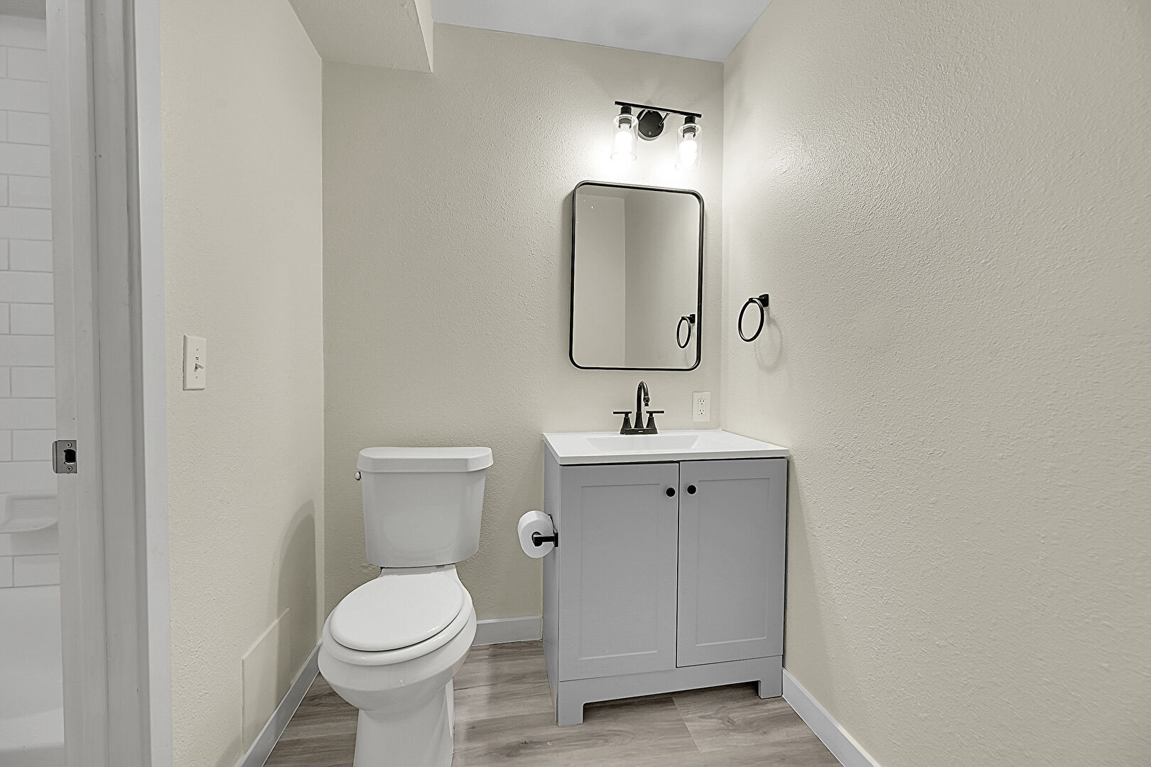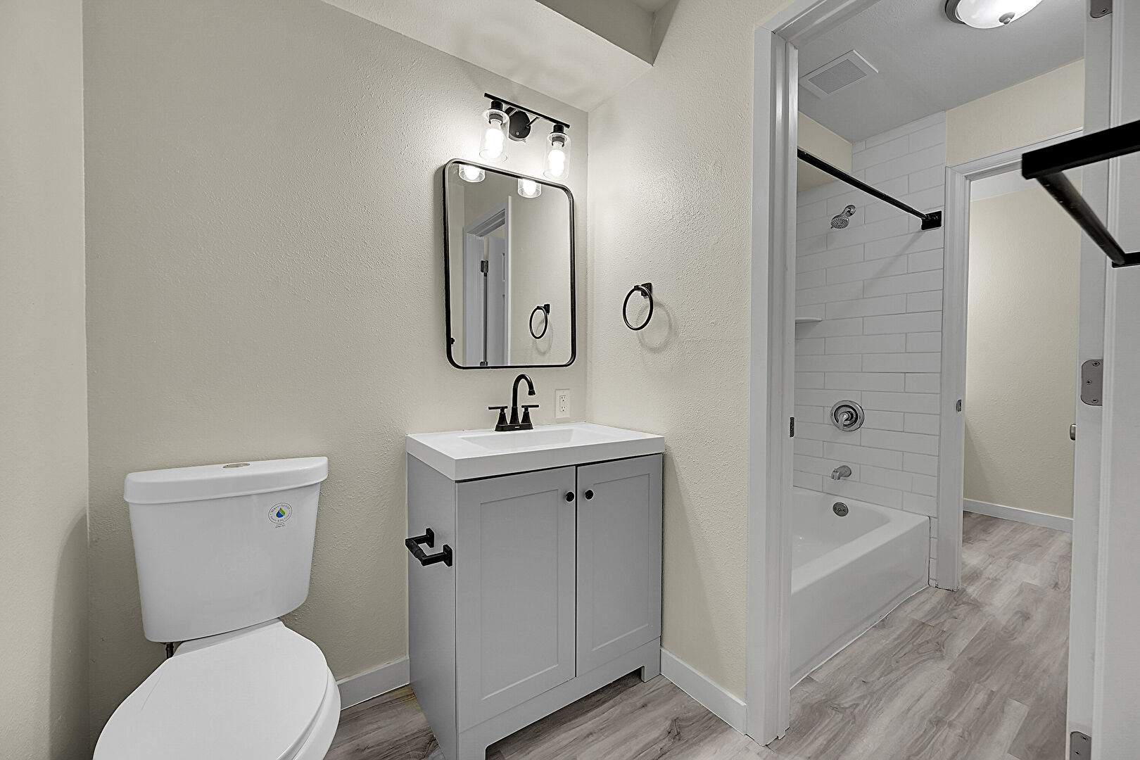 Baseboards Wall, Combined Bath Shower, Drywall, Full Bathroom, Textured Wall, Vanity, Vent, Wood Finish Floor, Full Bathroom, Wood Finish Floor