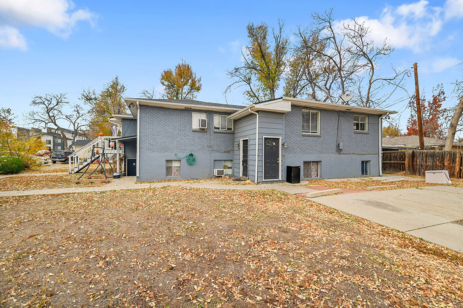 Brick Siding, Concrete Foundation, Downspout, Fence, Gutters, Horizontal Siding, Parking Pad, Satellite Dish, Stairs, Brick Siding, Gutters