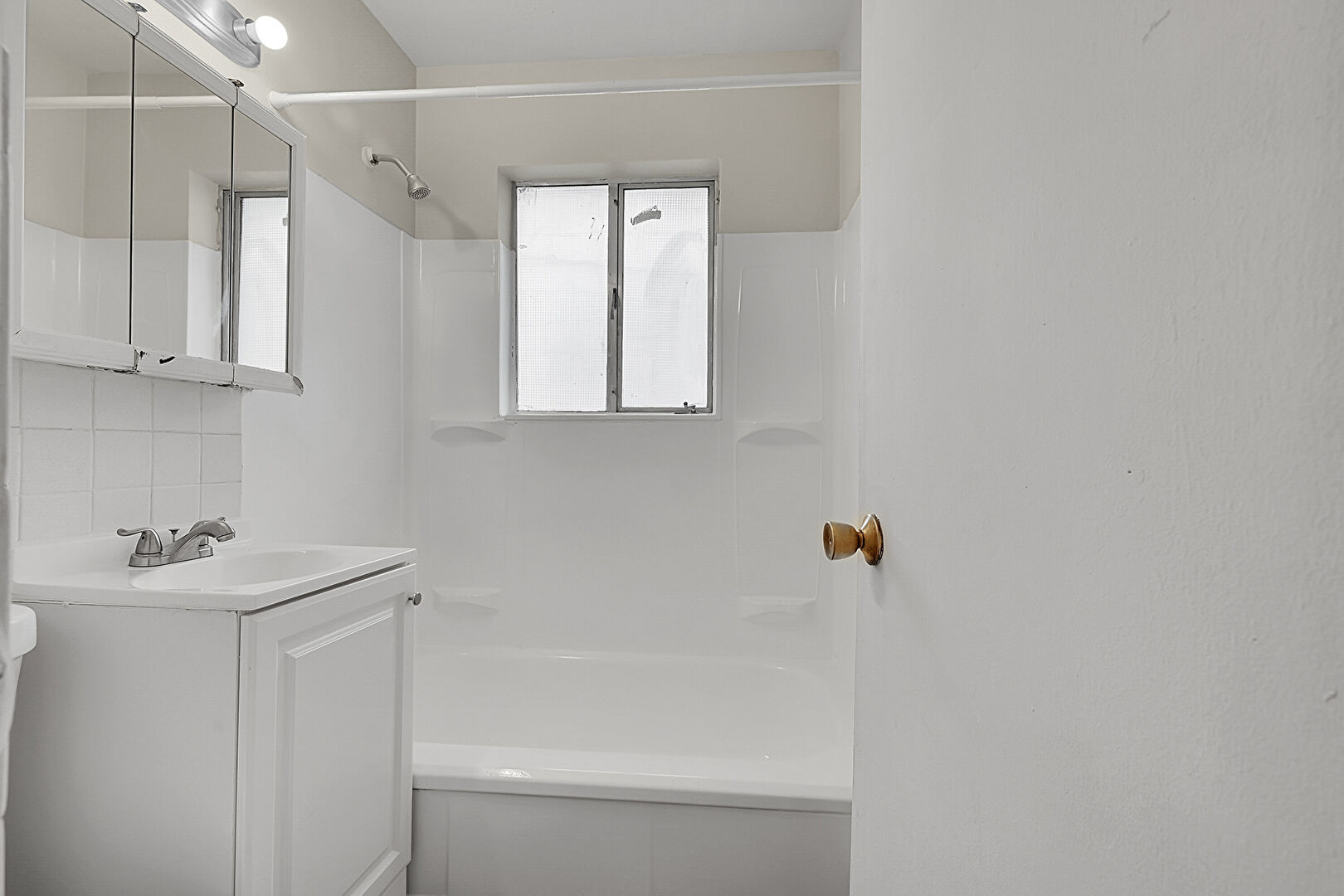 Combined Bath Shower, Drywall, Natural Light, Tile Wall, Vanity, Full Bathroom