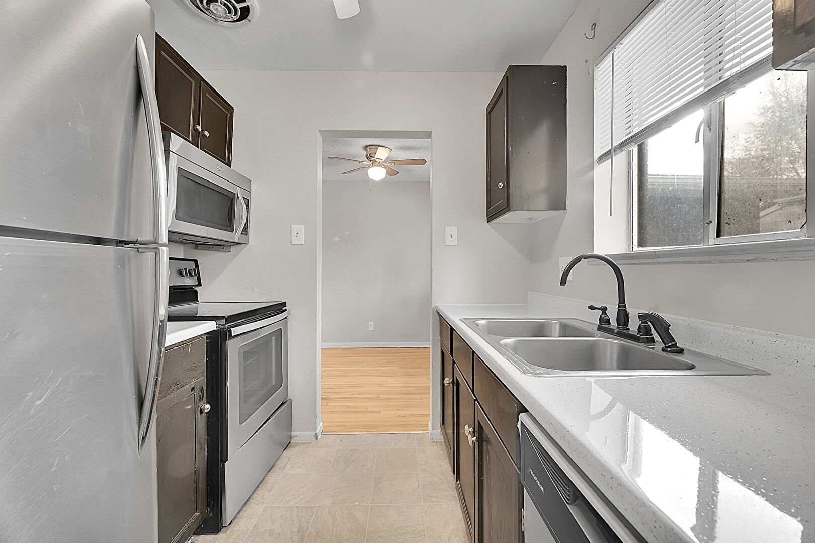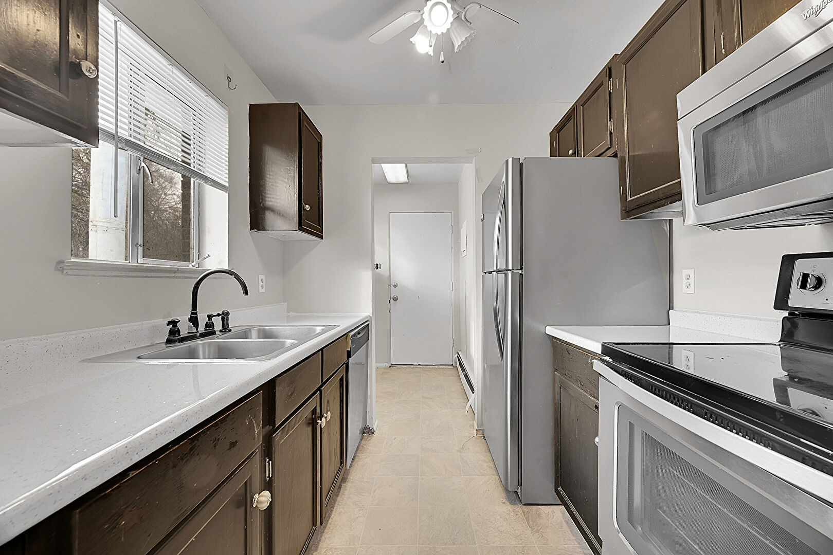 Baseboard Radiator, Baseboards Wall, Ceiling Fan, Dark Brown Cabinets, Drywall, Natural Light, Shaker Cabinets, Stone Countertops, Tile Floor, Vent, Visible Hinge Cabinets, Natural Light, Tile Floor