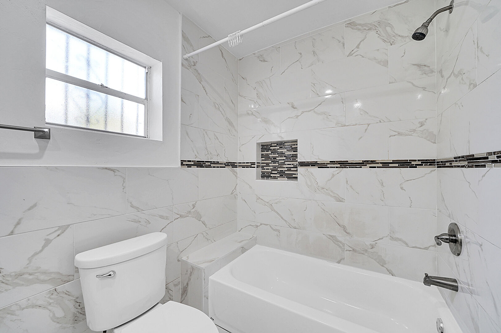 Closet, Combined Bath Shower, Drywall, Full Bathroom, Natural Light, Tile Wall, Vanity, Vent, Wainscot Wall, Natural Light, Wainscot Wall