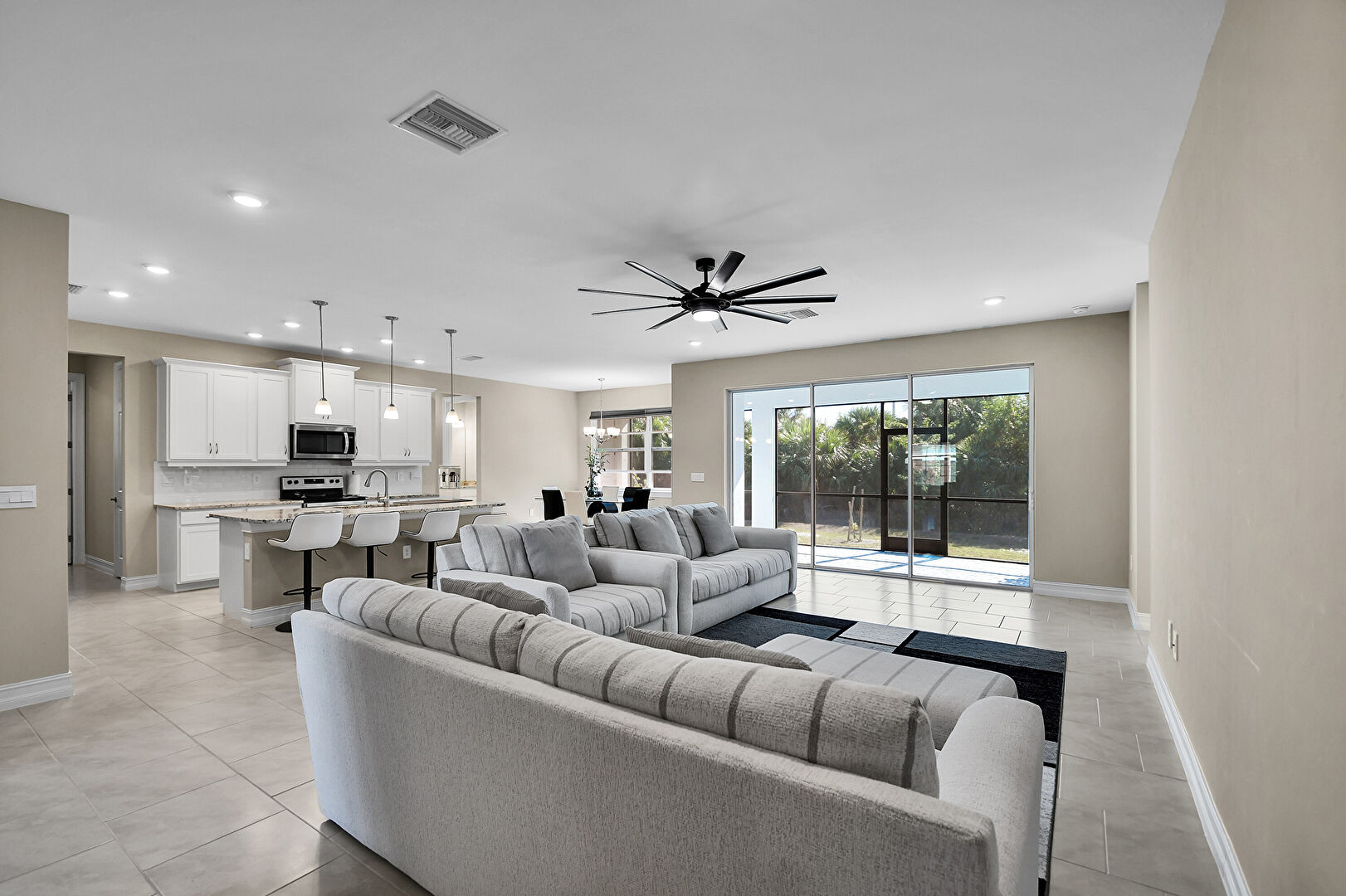 Baseboards Wall, Ceiling Fan, Drywall, Natural Light, Notable Chandelier, Recessed Lighting, Tile Floor, Vent, Baseboards Wall, Notable Chandelier, Tile Floor