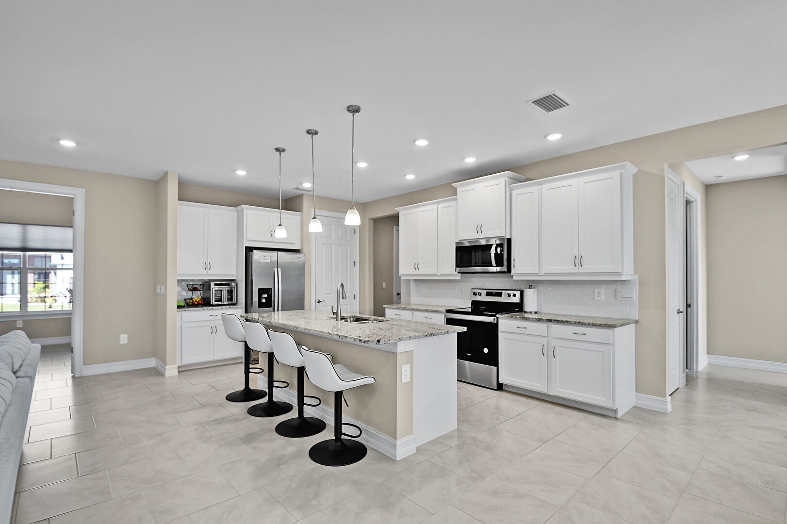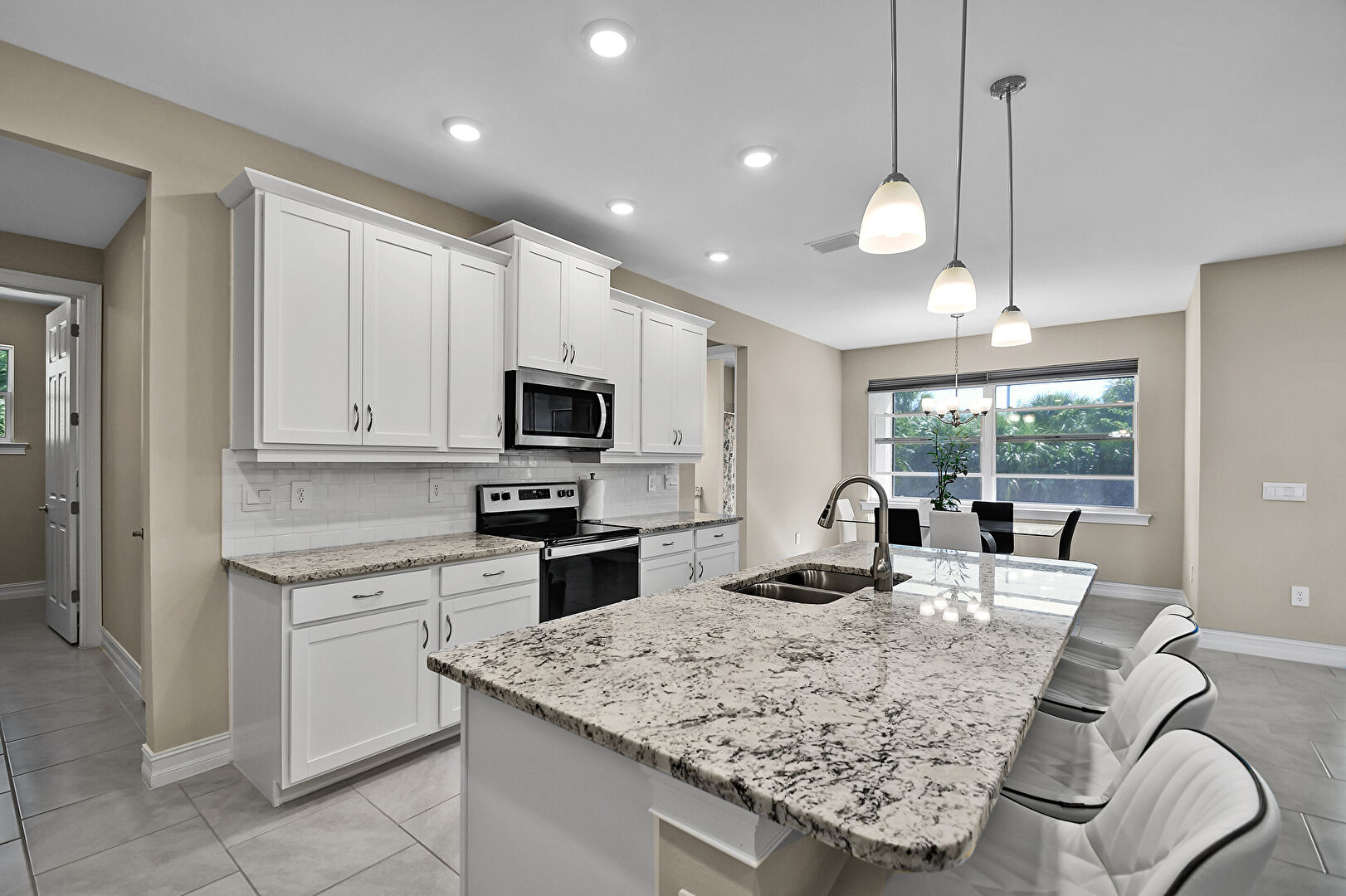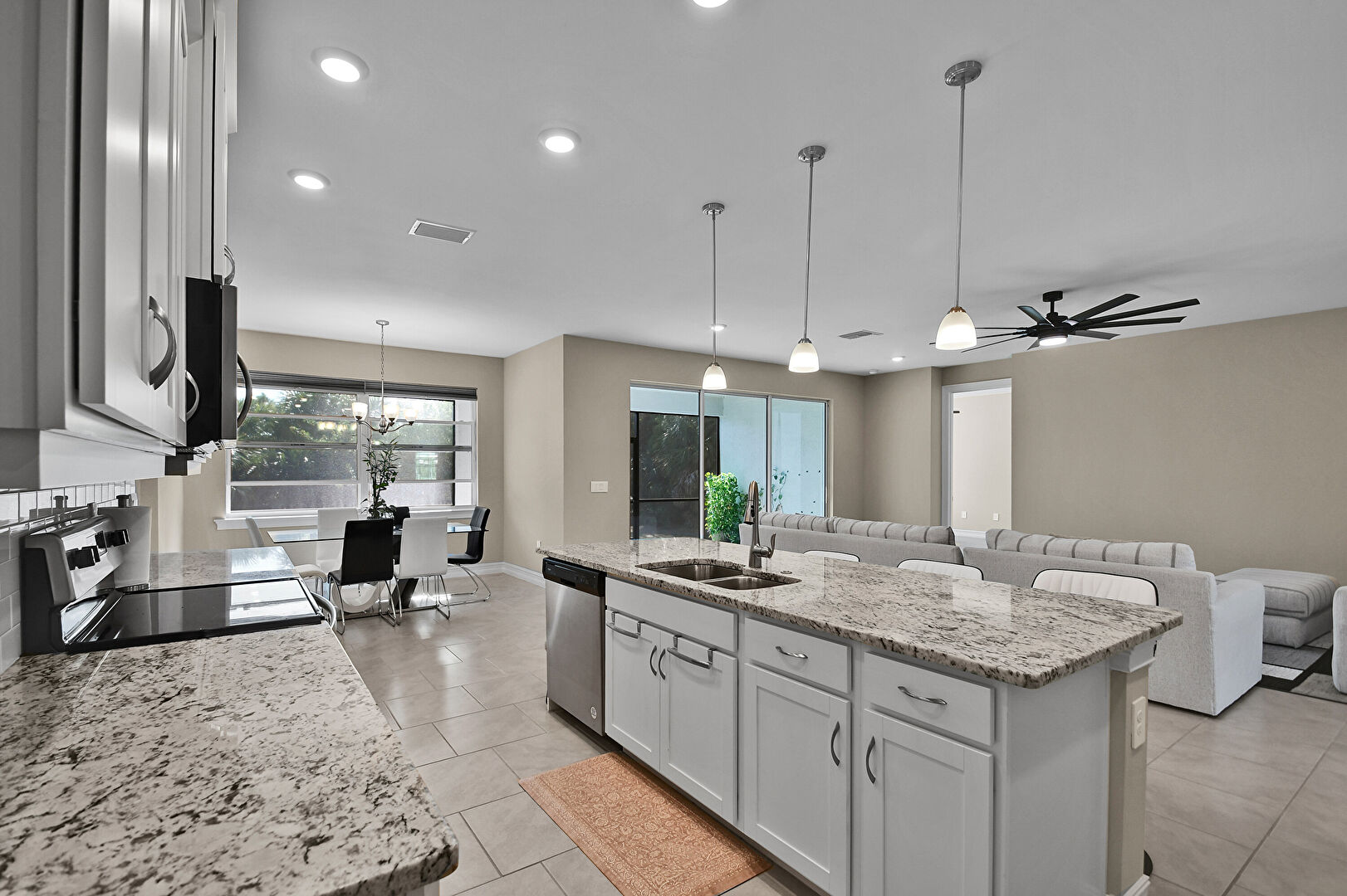 Baseboards Wall, Ceiling Fan, Crown Molding Cabinets, Drywall, Kitchen Bar, Kitchen Island, L Shaped Kitchen, Natural Light, Notable Chandelier, Opens To Living Area, Pendant Lighting, Recessed Lighting, Shaker Cabinets, Stone Countertops, Tile Floor, Vent, Kitchen Bar, L Shaped Kitchen, Pendant Lighting, Stone Countertops, Tile Floor, Vent